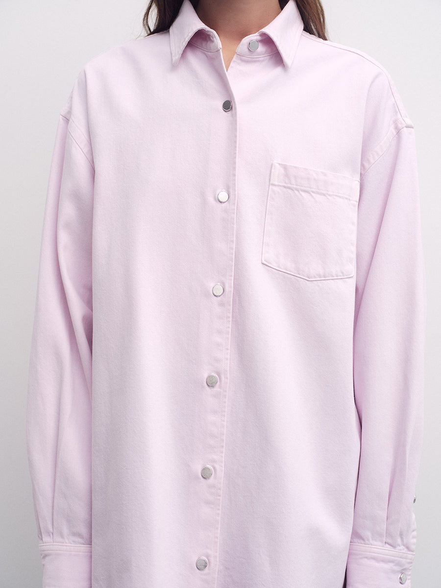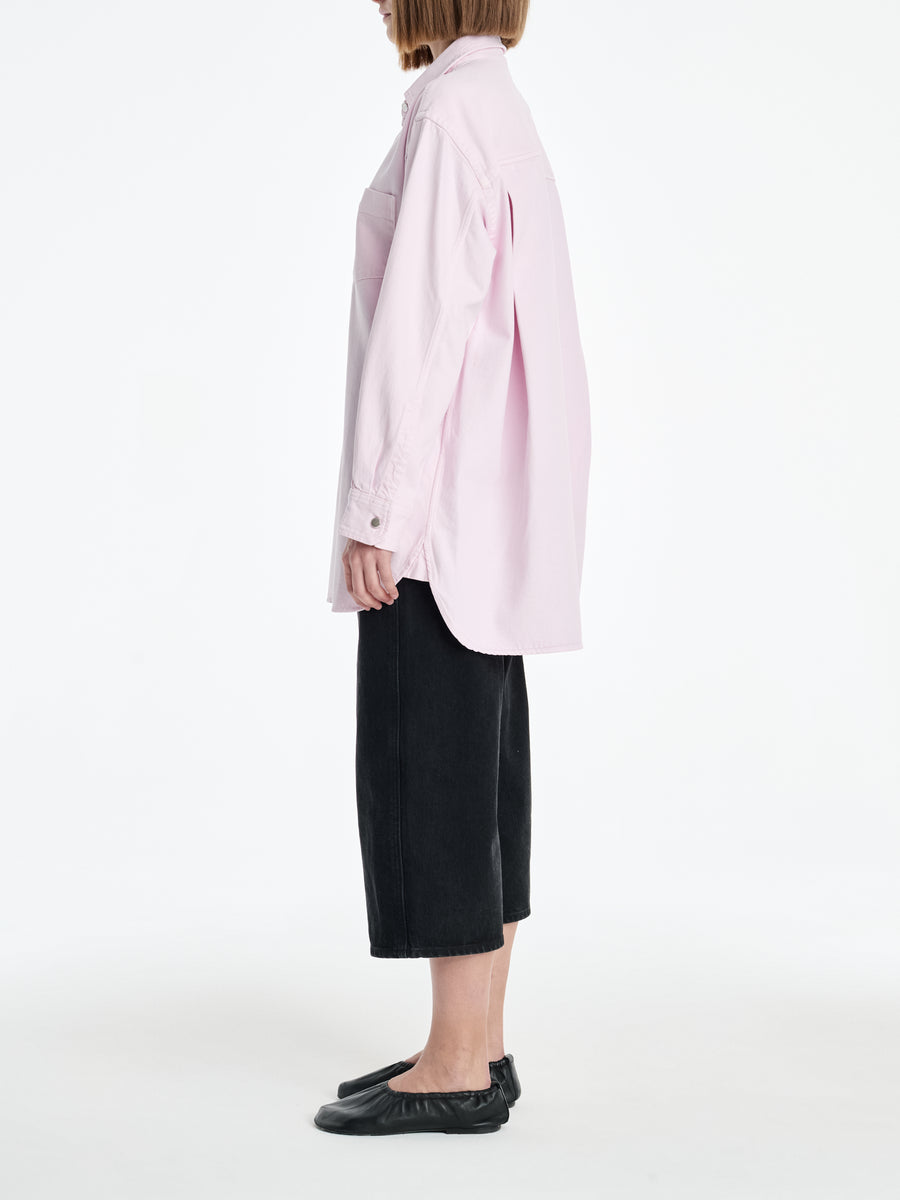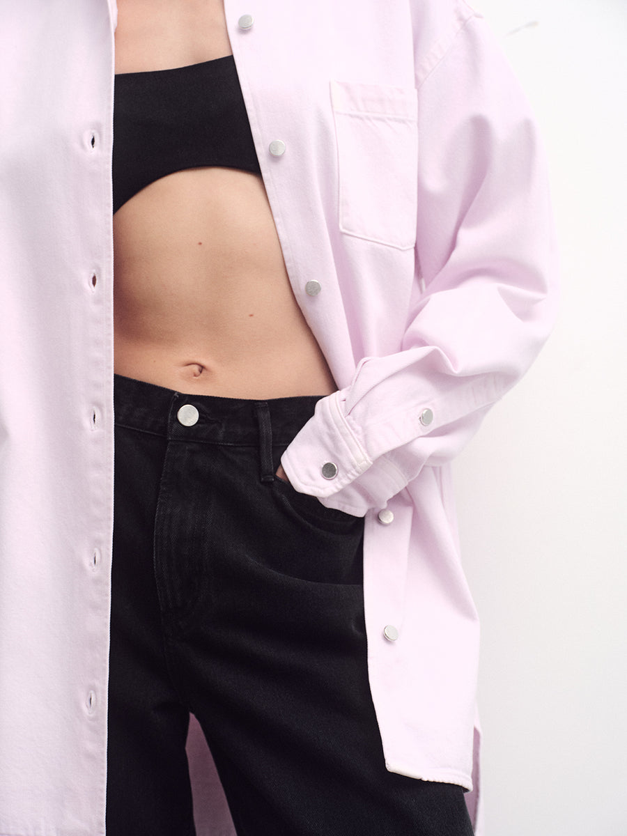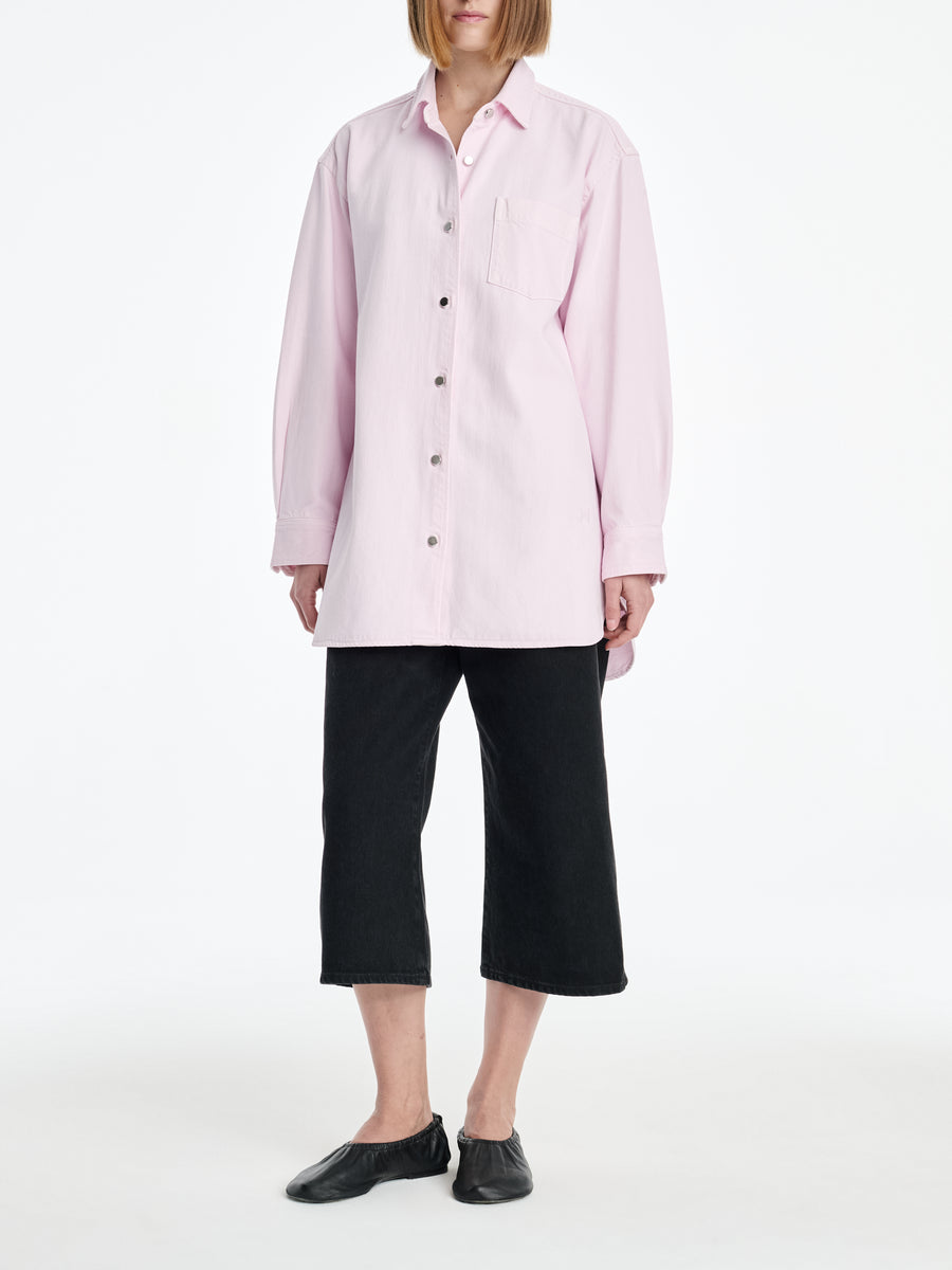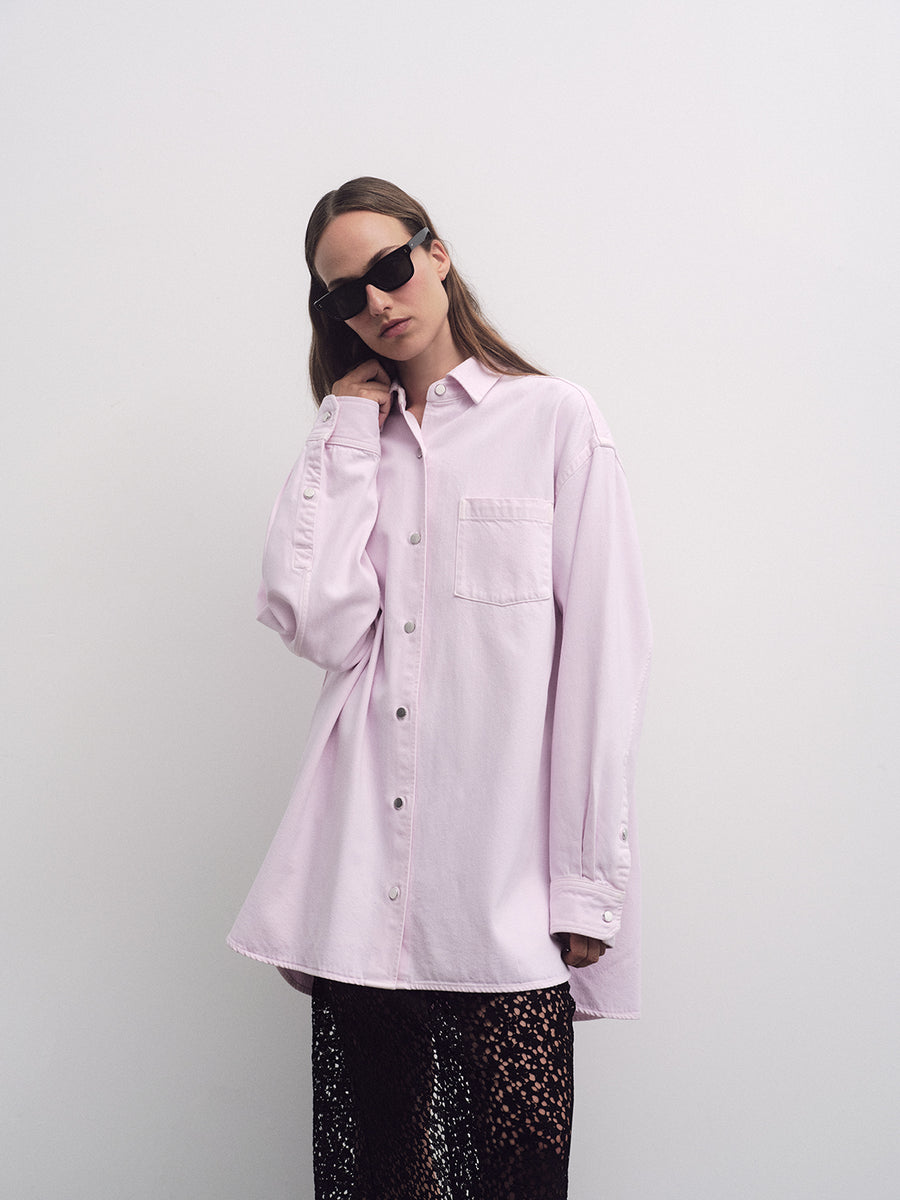 An over-sized, A-line shirt is cut in a sun-faded Stone Wash Powder Pink – crafted from 60% organic cotton and 40% Refibra Lyocell. Oversized and fluid, it redefines shirting with a responsible textile story.