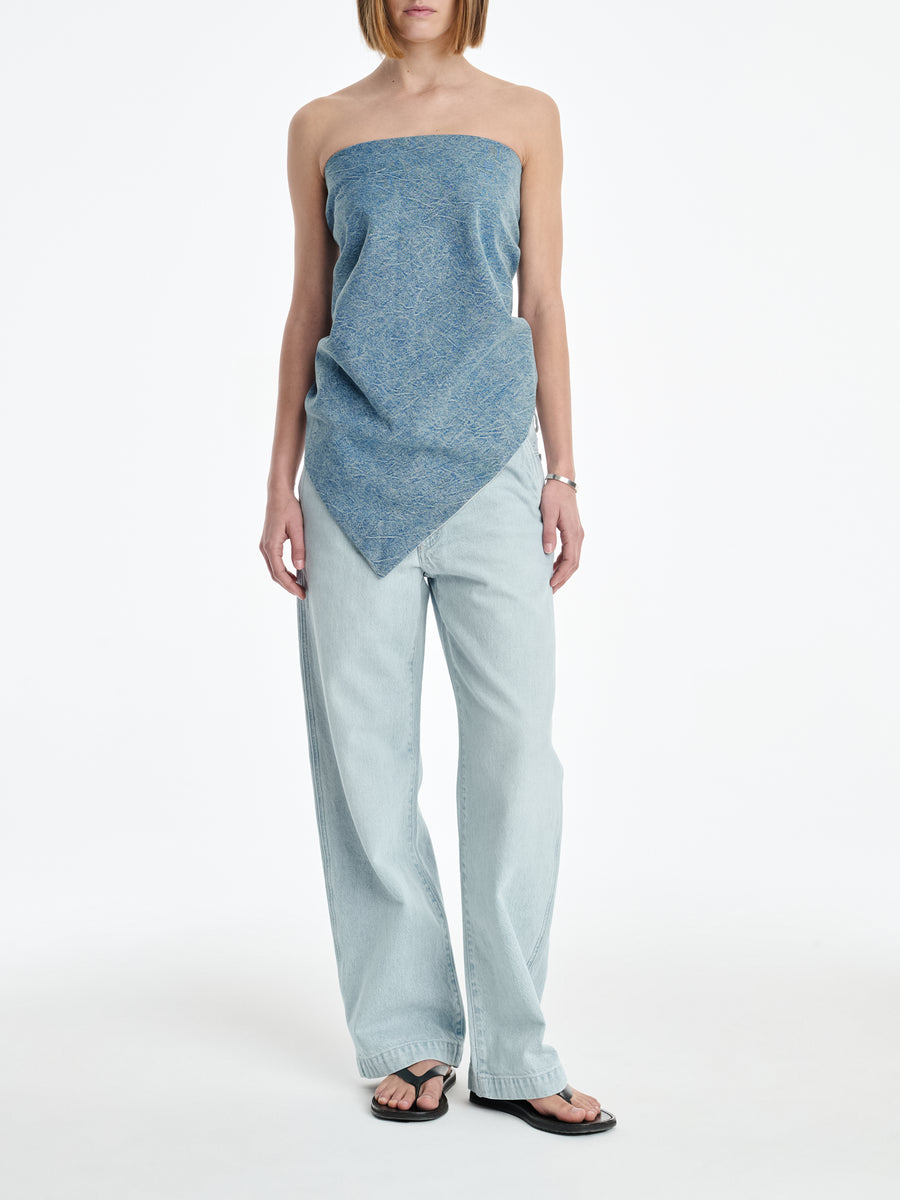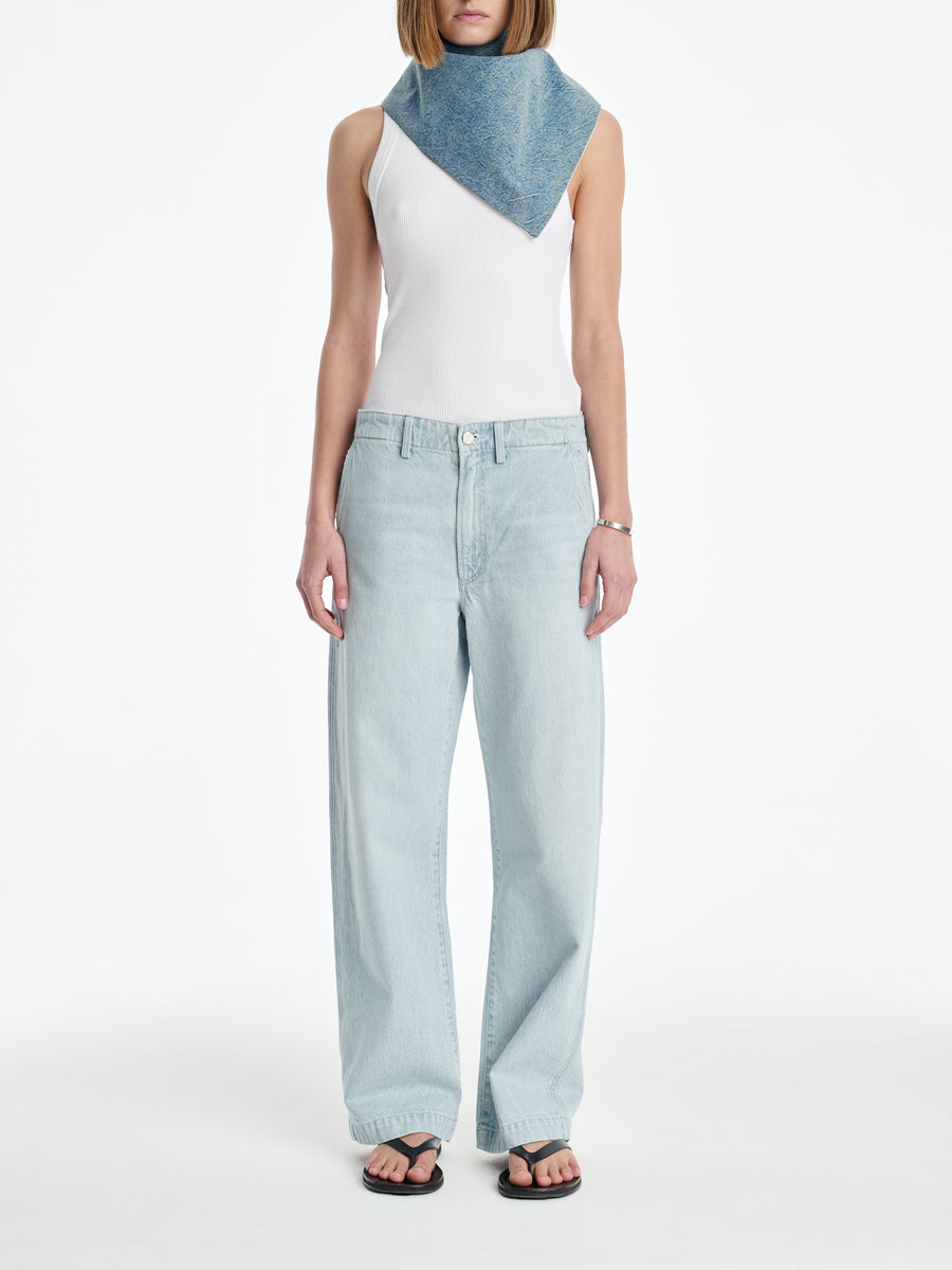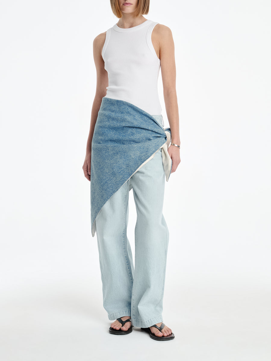 A reversible triangle bandana in washed-down Crinkled Indigo is cut from a responsible blend of 80% organic cotton and 20% recycled cotton on one side and Naia Renew ivory sateen on the other. Extremely versatile, it can be worn around the neck as a traditional bandana, around the waist as a belt or over shoulders.