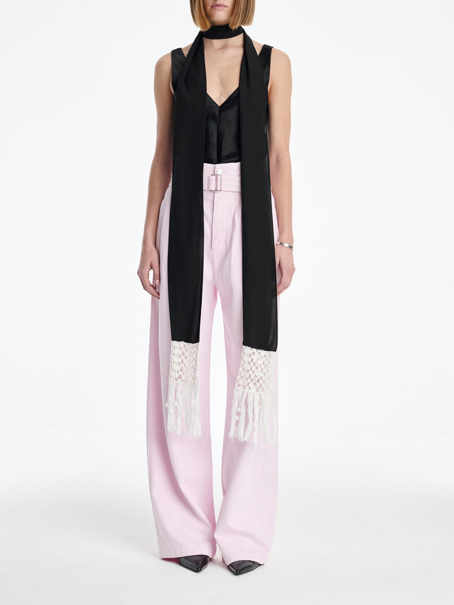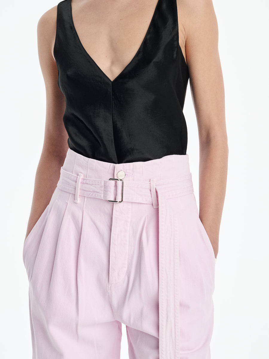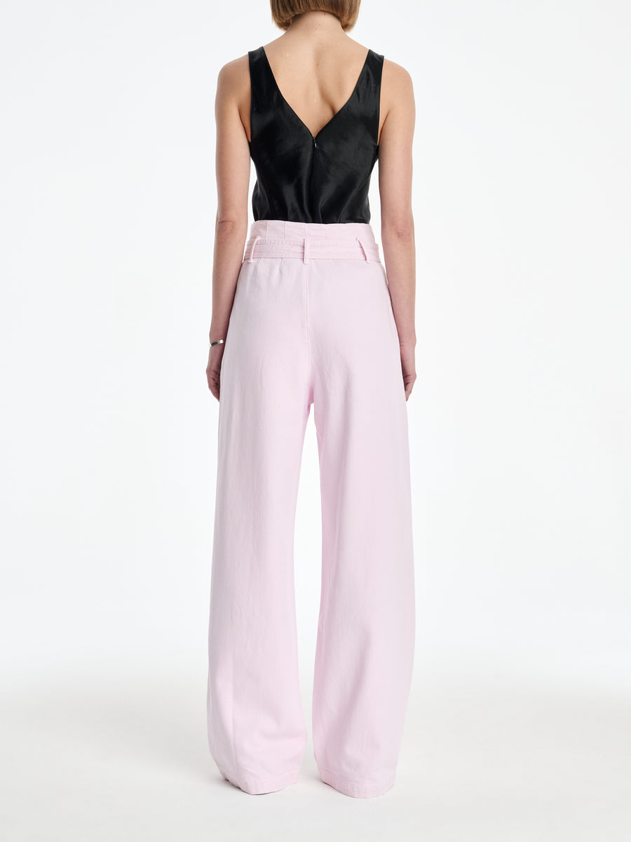 A sculpted, corset-inspired jean in a sun-faded Stone Wash Powder Pink– crafted from a conscious mix of 60% organic cotton and 40% Refibra Lyocell, derived from upcycled cotton waste. Finished with clean seaming and custom-made silver shank hardware, it is feminine in hue and redefines denim tailoring through circular design.