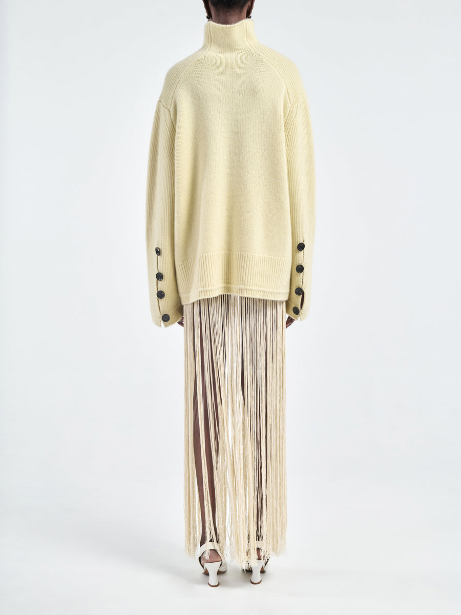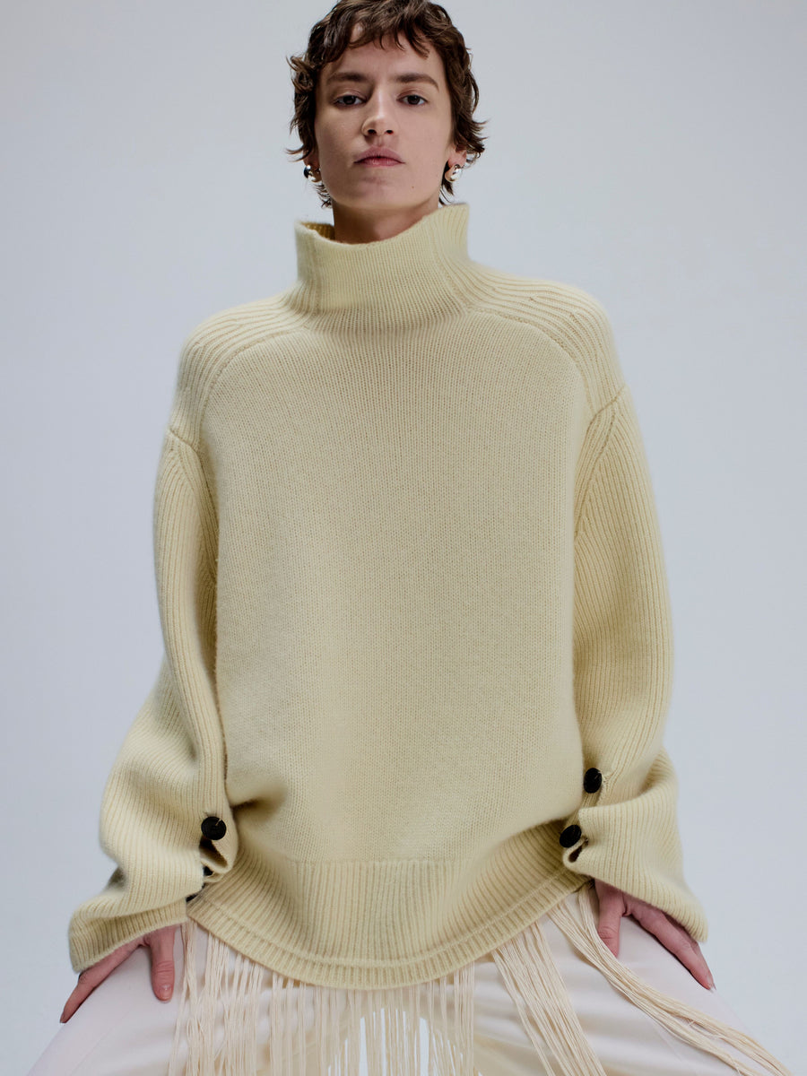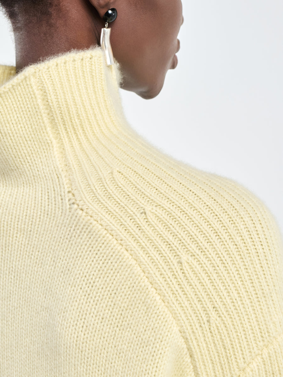 The Primrose Yellow Mock Neck Sweater is made in a beautifully soft cashmere-wool blend. It is designed with a rib sleeve and jersey body, and has a relaxed, easy fit with 3 large signature corozo nut buttons at the cuff.
