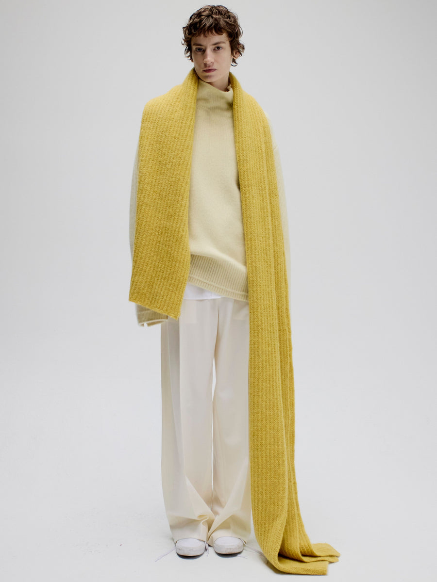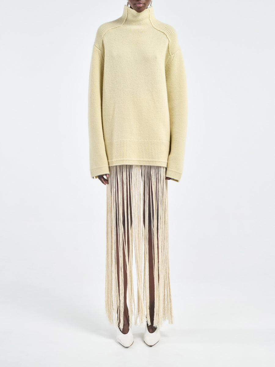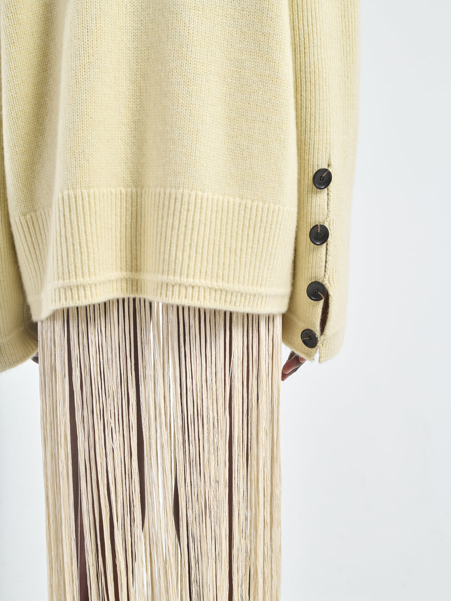 The Primrose Yellow Mock Neck Sweater is made in a beautifully soft cashmere-wool blend. It is designed with a rib sleeve and jersey body, and has a relaxed, easy fit with 3 large signature corozo nut buttons at the cuff.