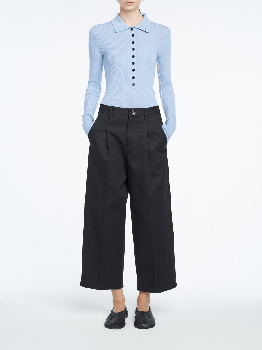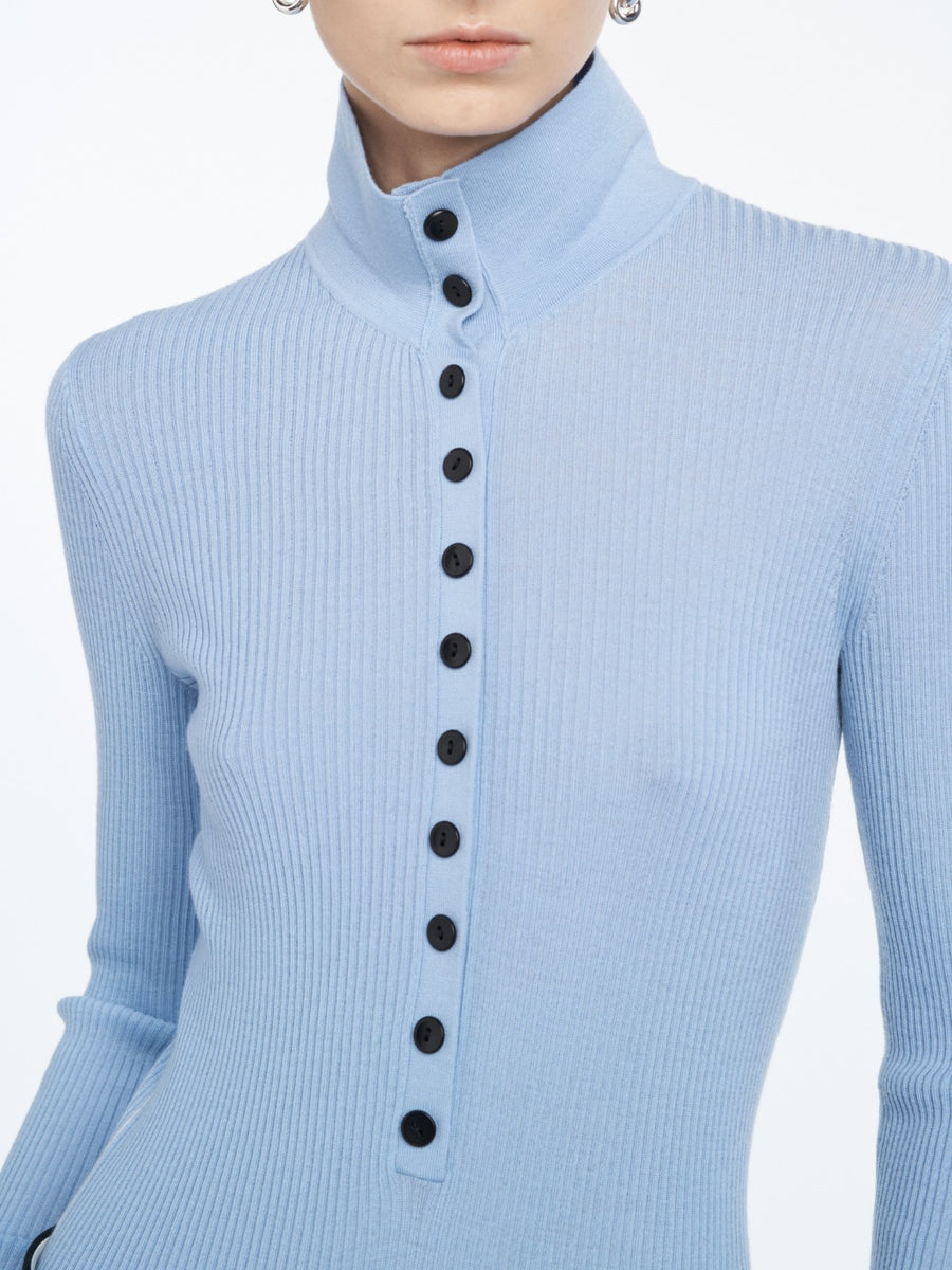Made in 100% responsible merino wool with a soft cashmere feel, the long sleeve Tiny Button Polo in sky blue has a close-fit to be worn along or layered. Detailed by our signature contrast stitch along the sleep, the polo allows for a multiple styling options – can be unbuttoned with a collared neck or buttoned to the top for a turtleneck feel.