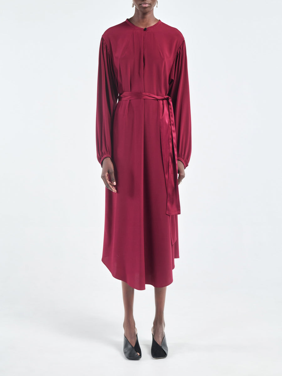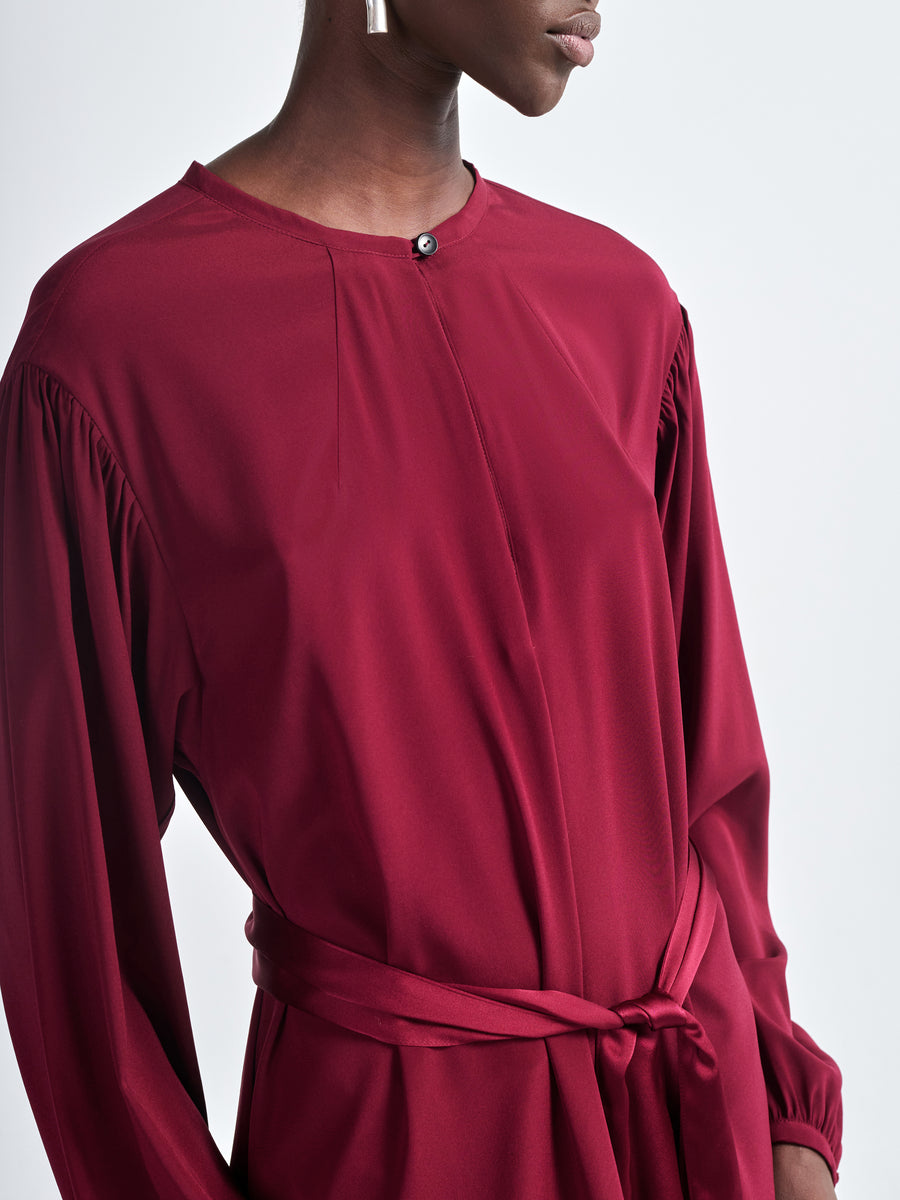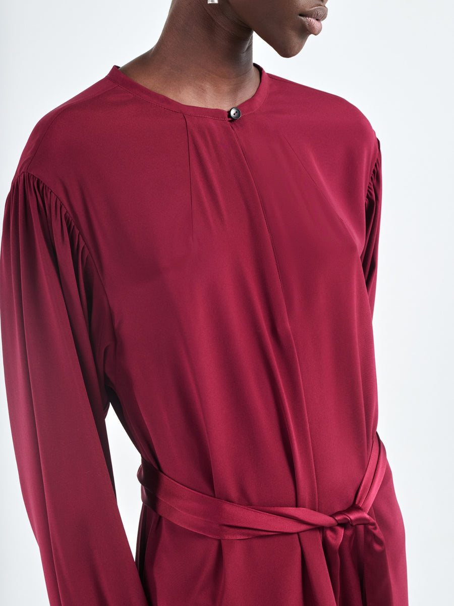 The Belted Boho Dress in a deep ox blood Japanese Naia Renew glossy sateen. It has an easy fit, featuring a crew neck with a built-in scarf, long sleeves, and custom shell button closures at the front, neck, and cuffs. Completed with a detachable belt that can be tied at the waist for a defined silhouette.