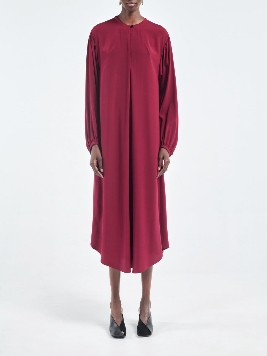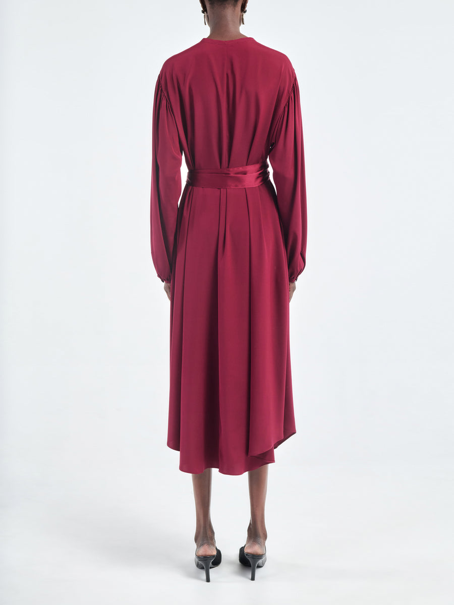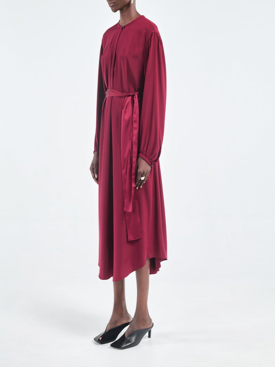 The Belted Boho Dress in a deep ox blood Japanese Naia Renew glossy sateen. It has an easy fit, featuring a crew neck with a built-in scarf, long sleeves, and custom shell button closures at the front, neck, and cuffs. Completed with a detachable belt that can be tied at the waist for a defined silhouette.