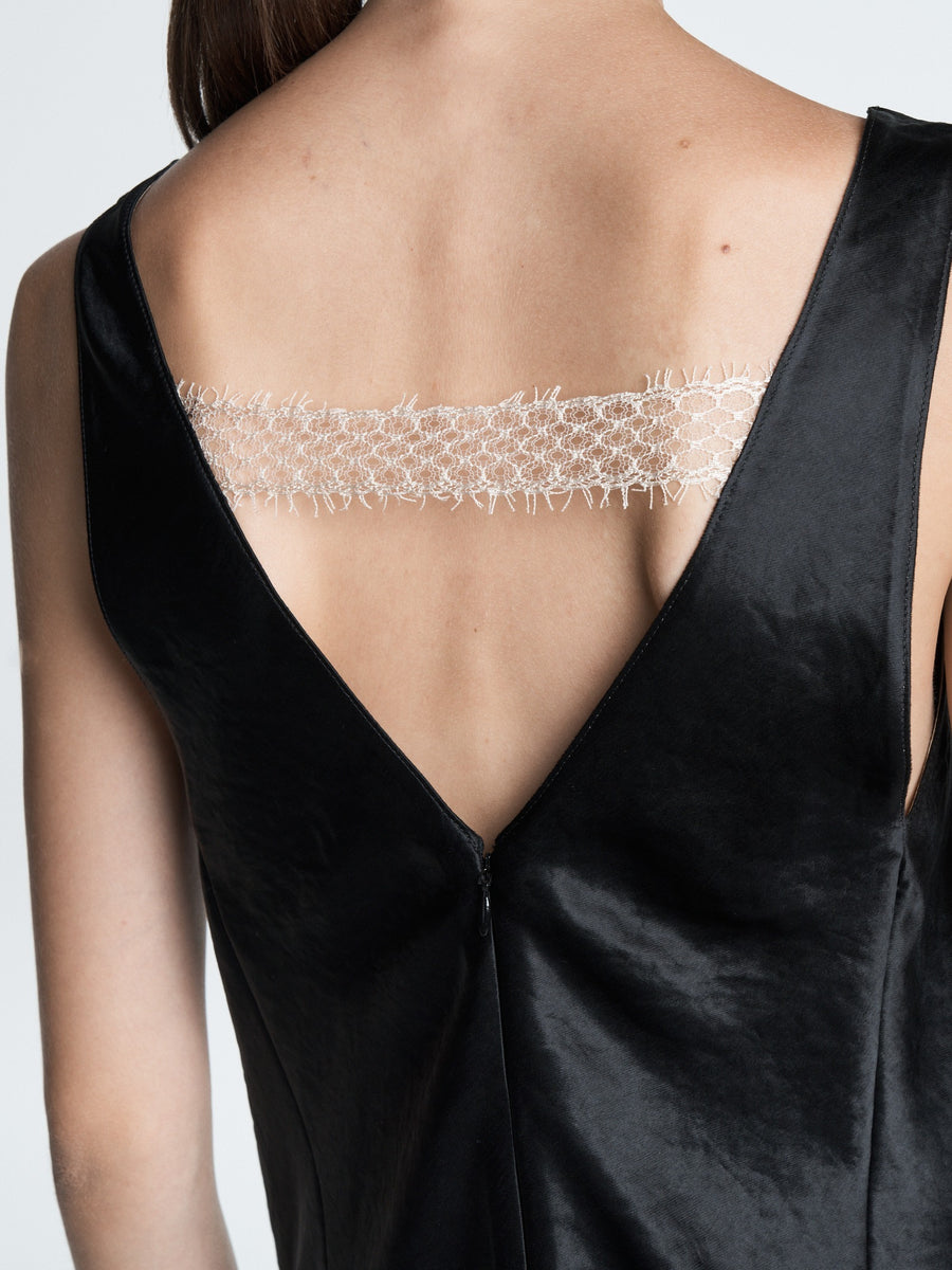The Deep V Tunic Dress in black Japanese Naia Renew sateen is cut on the bias for a flattering fit. It has a delicate, tea stained lace detail at the back and hem, v-neck and back, hidden pockets on the seam and invisible back zipper.