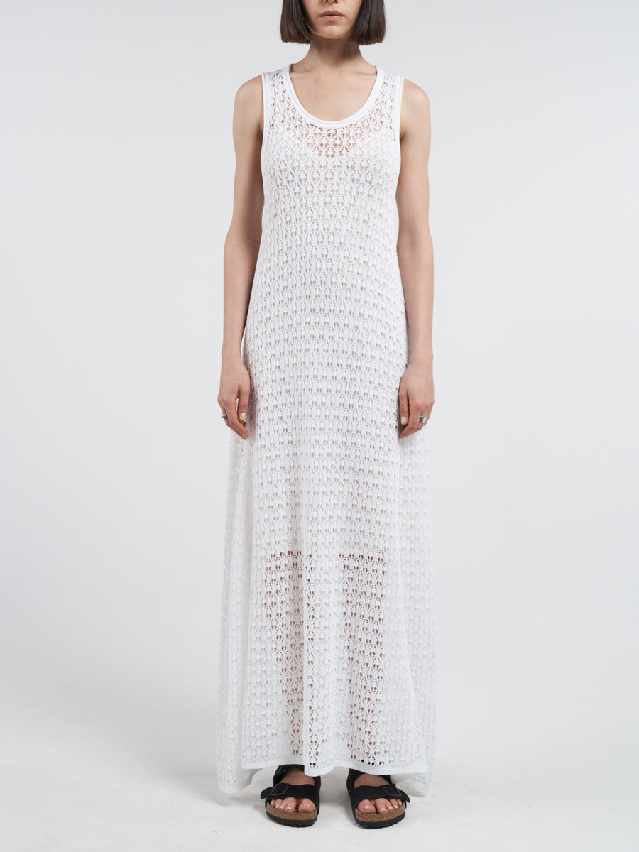 Crafted in organic mercerized cotton with a delicate knit lace stitch, this sheer, floor-length tank dress exudes a dramatic yet soft elegance. The all-over lace pattern and A-line silhouette create a natural flow as the dress gracefully reaches the floor. Finished with a half-woven slip for added modesty, this piece offers a sophisticated balance of texture and movement.