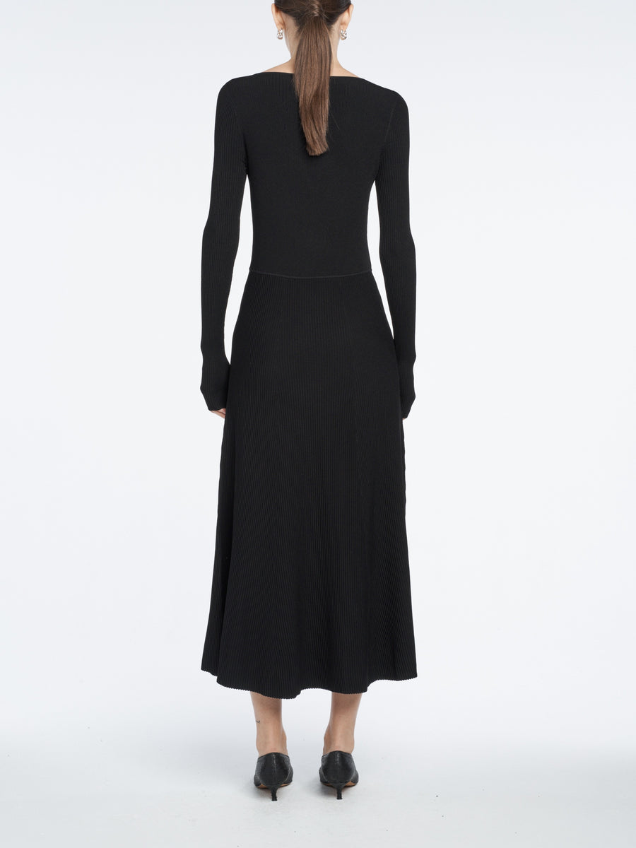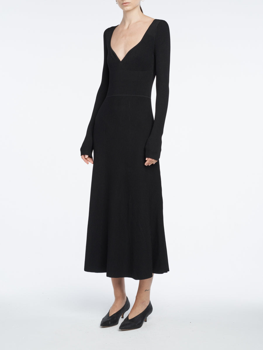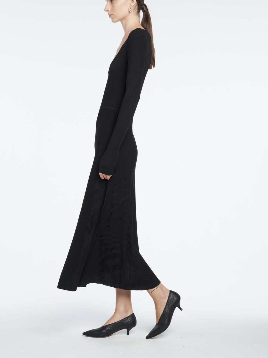 A black ribbed knit full length dress defined by its subtle bustier form-fitting bodice and circle skirt, providing a silhouette lovely for an evening or special occasion.