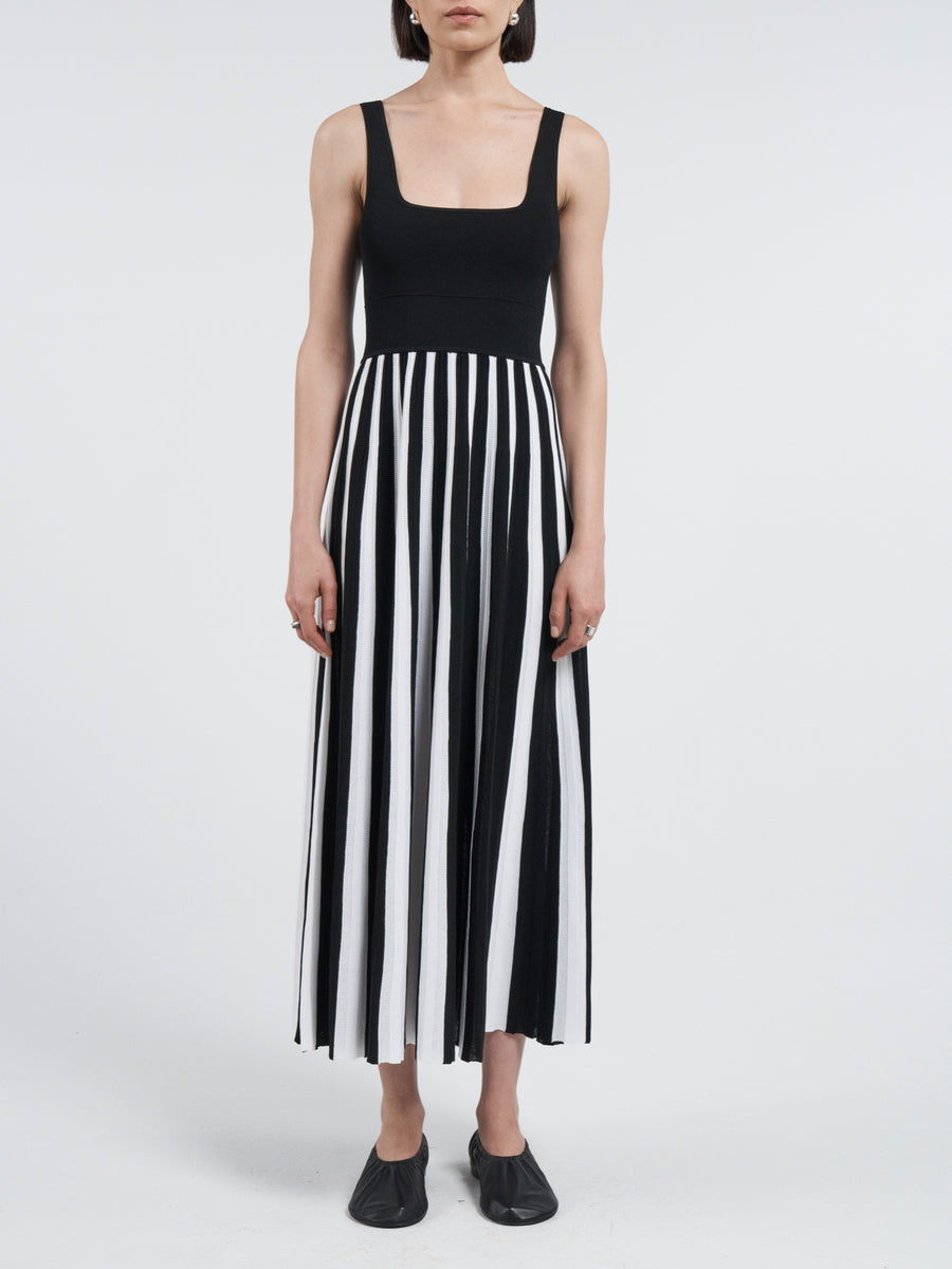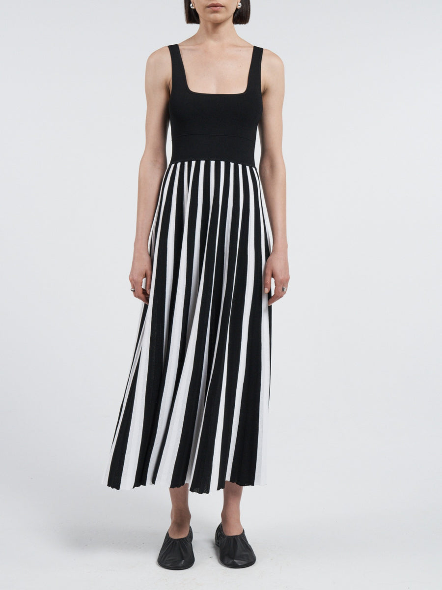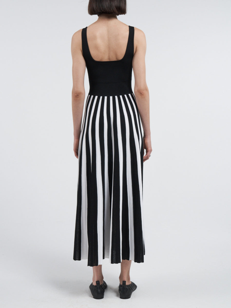 One of our best-selling dresses, now reimagined in new colors. This square-neck viscose mesh dress combines comfort and flattering design. The solid black bodice fits closely through the waist, transitioning into a black and white striped skirt. Crafted in a solid mesh knit, the skirt creates a full, flowing silhouette that reaches a midi length.