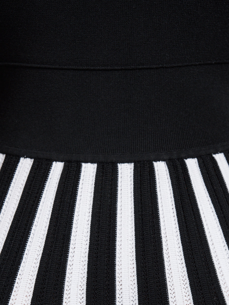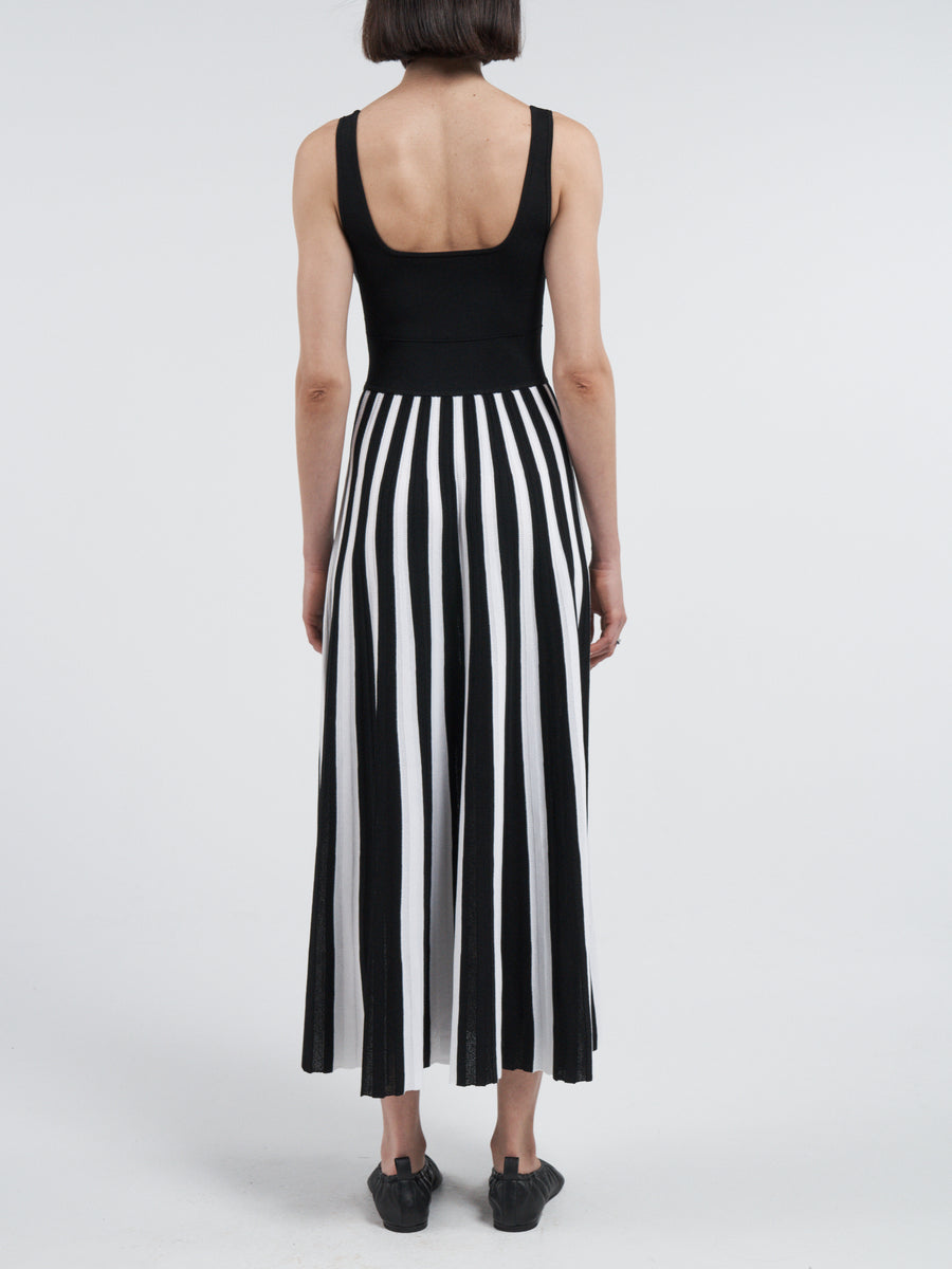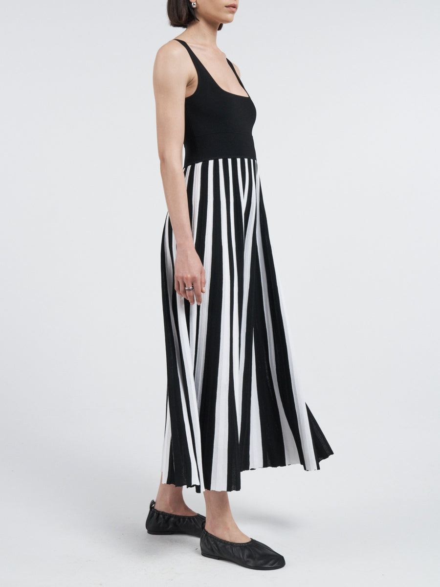 One of our best-selling dresses, now reimagined in new colors. This square-neck viscose mesh dress combines comfort and flattering design. The solid black bodice fits closely through the waist, transitioning into a black and white striped skirt. Crafted in a solid mesh knit, the skirt creates a full, flowing silhouette that reaches a midi length.