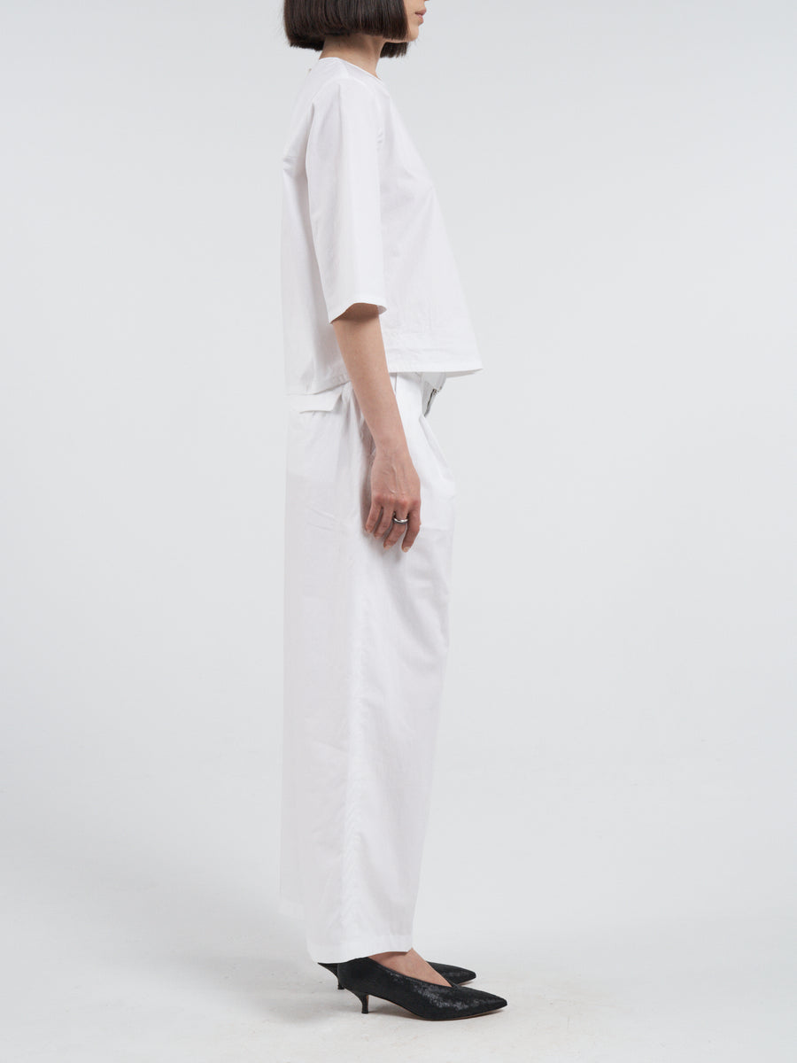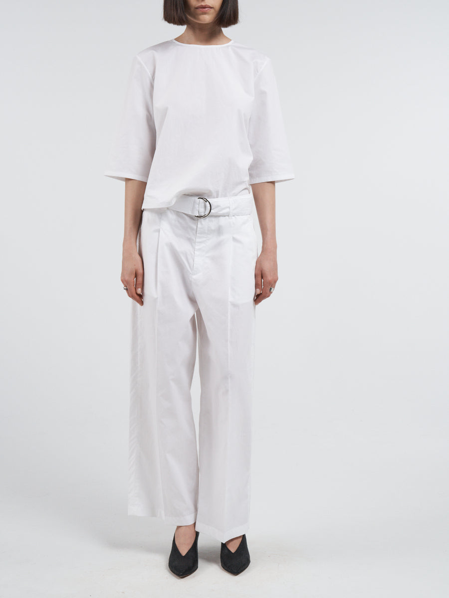 Crafted in our organic white cotton, these wide-leg trousers sit at a mid-rise and finish at an ankle-cropped length. A two-inch-wide, elongated matching belt—made from the same white cotton fabric—fastens with two silver D-rings, while flap welt pockets at the back complete this relaxed yet tailored pant