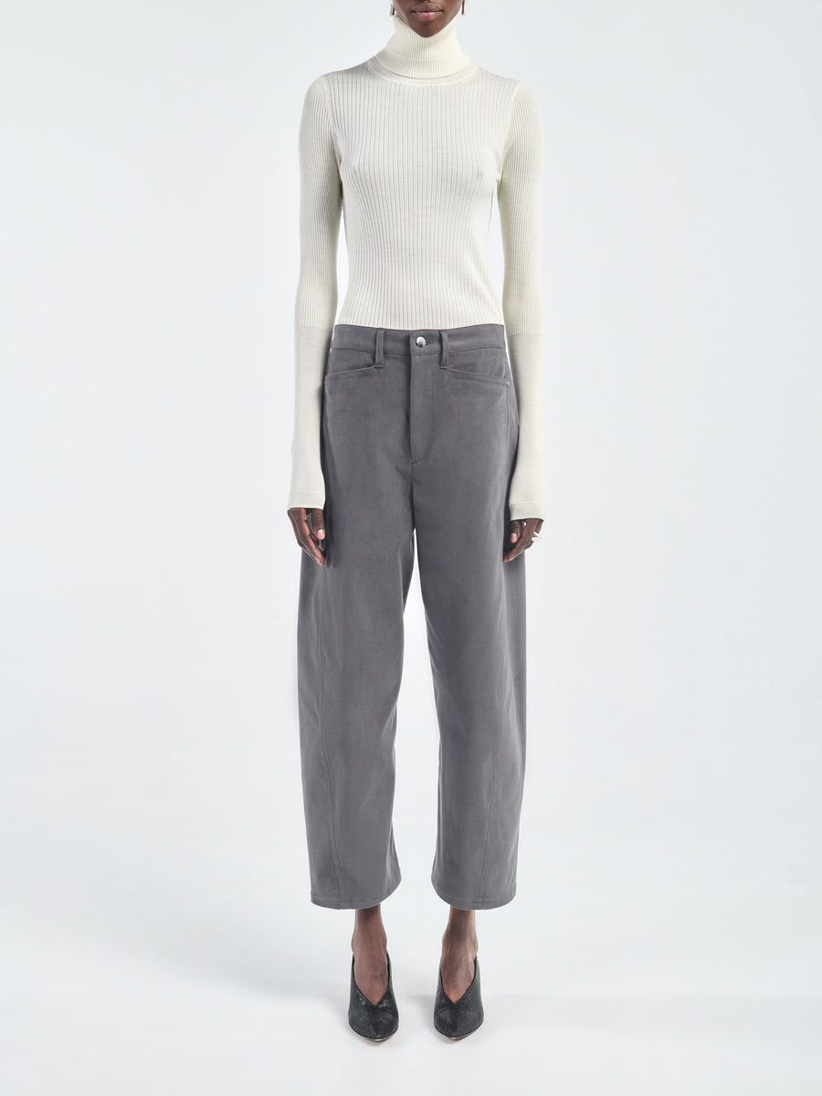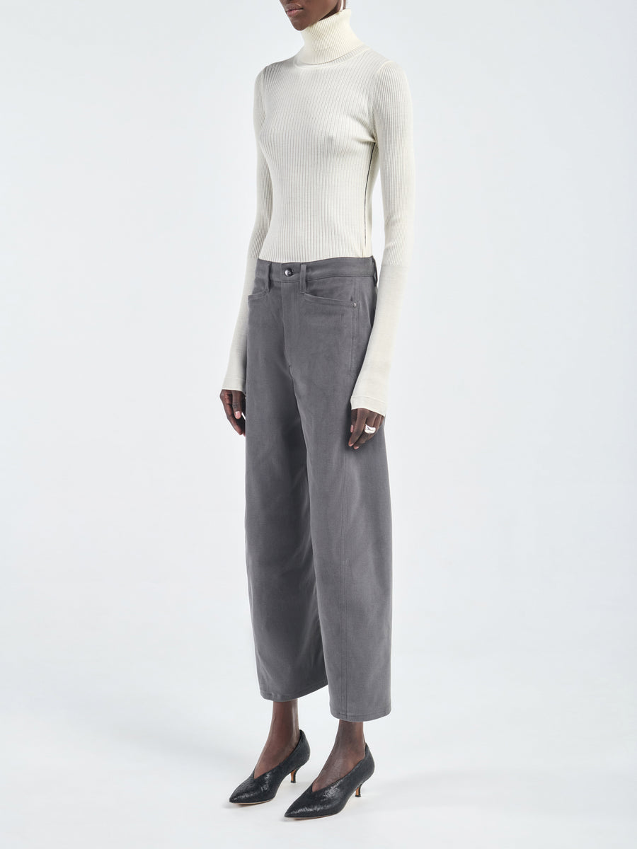 For Fall, our best-selling Bow Leg Crop Jean is made in a more structured organic cotton denim to really hold the articulated curve of the leg shape. They feature diagonal slash pockets at the front, twisted side seams, darts at the back waistband for a more flattering fit, and our signature recycled metal hardware. The smoke grey colorway is particularly beautiful paired with neutrals for Fall.