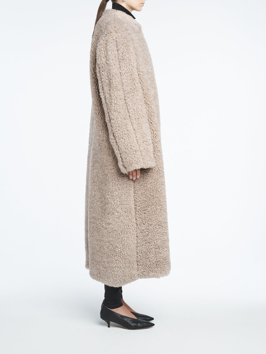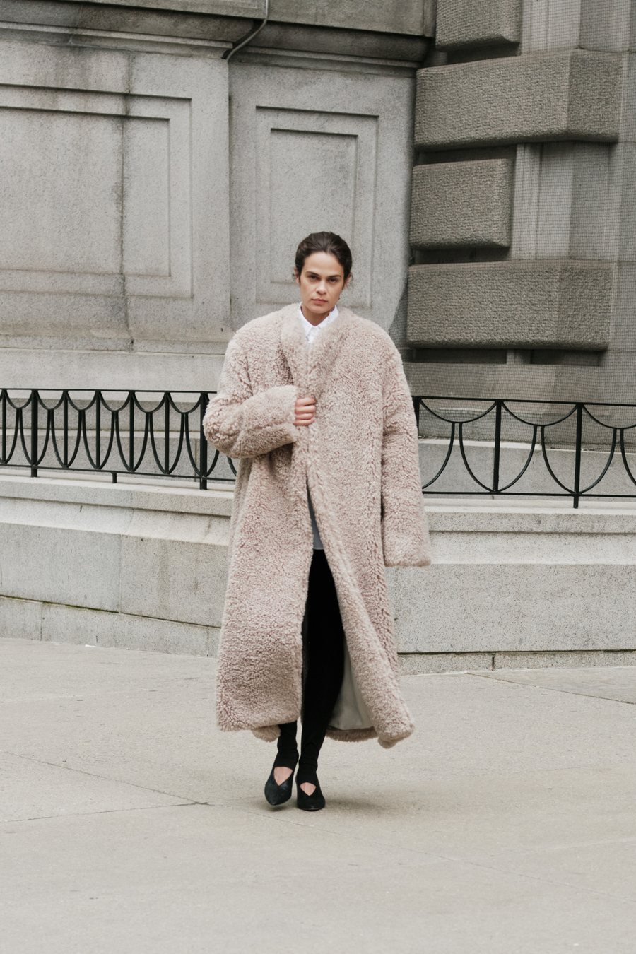 The Wrap Coat in pebble is a statement piece – made easy to throw over any look. Made of 100% soft Recycled Polyester Shearling with a relaxed, robe-like fit. Oversized fit, consider sizing down if you have a more petite frame.