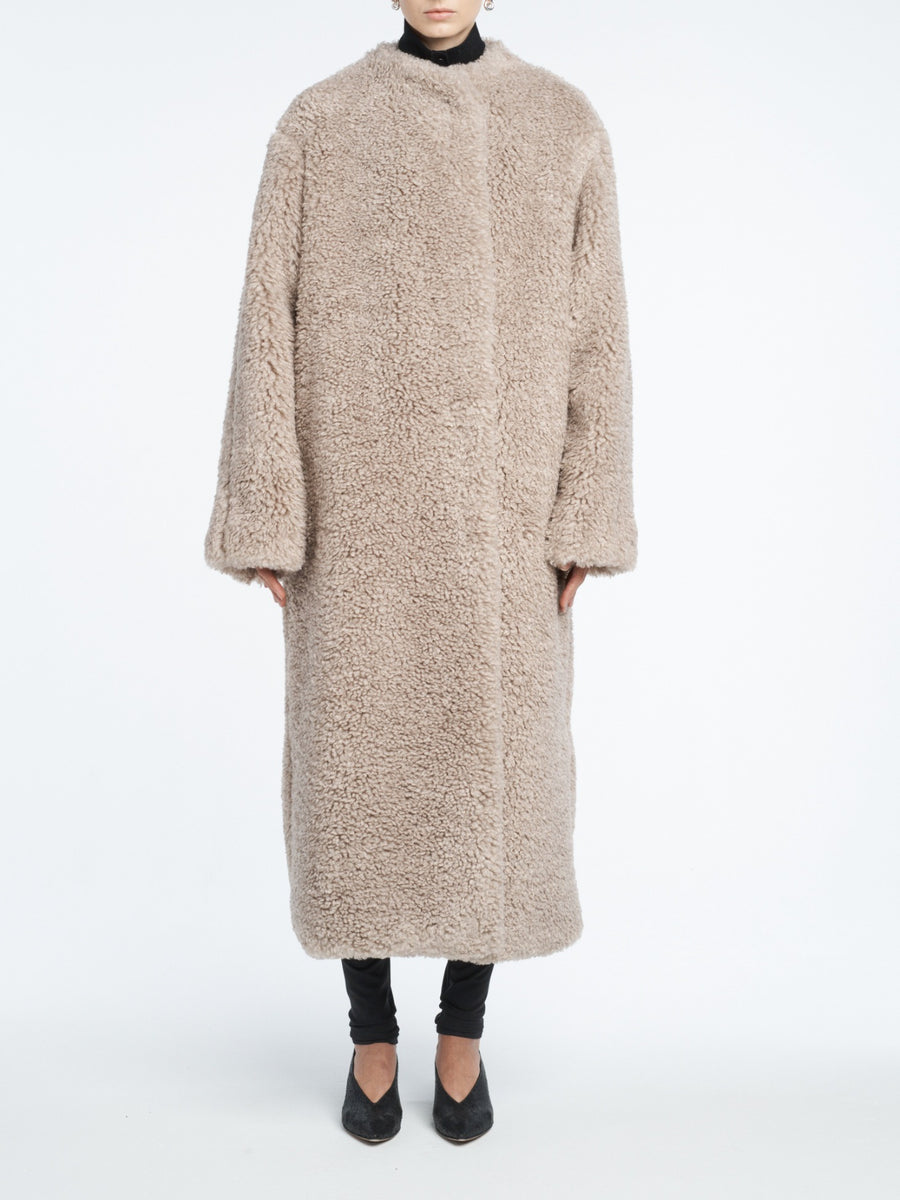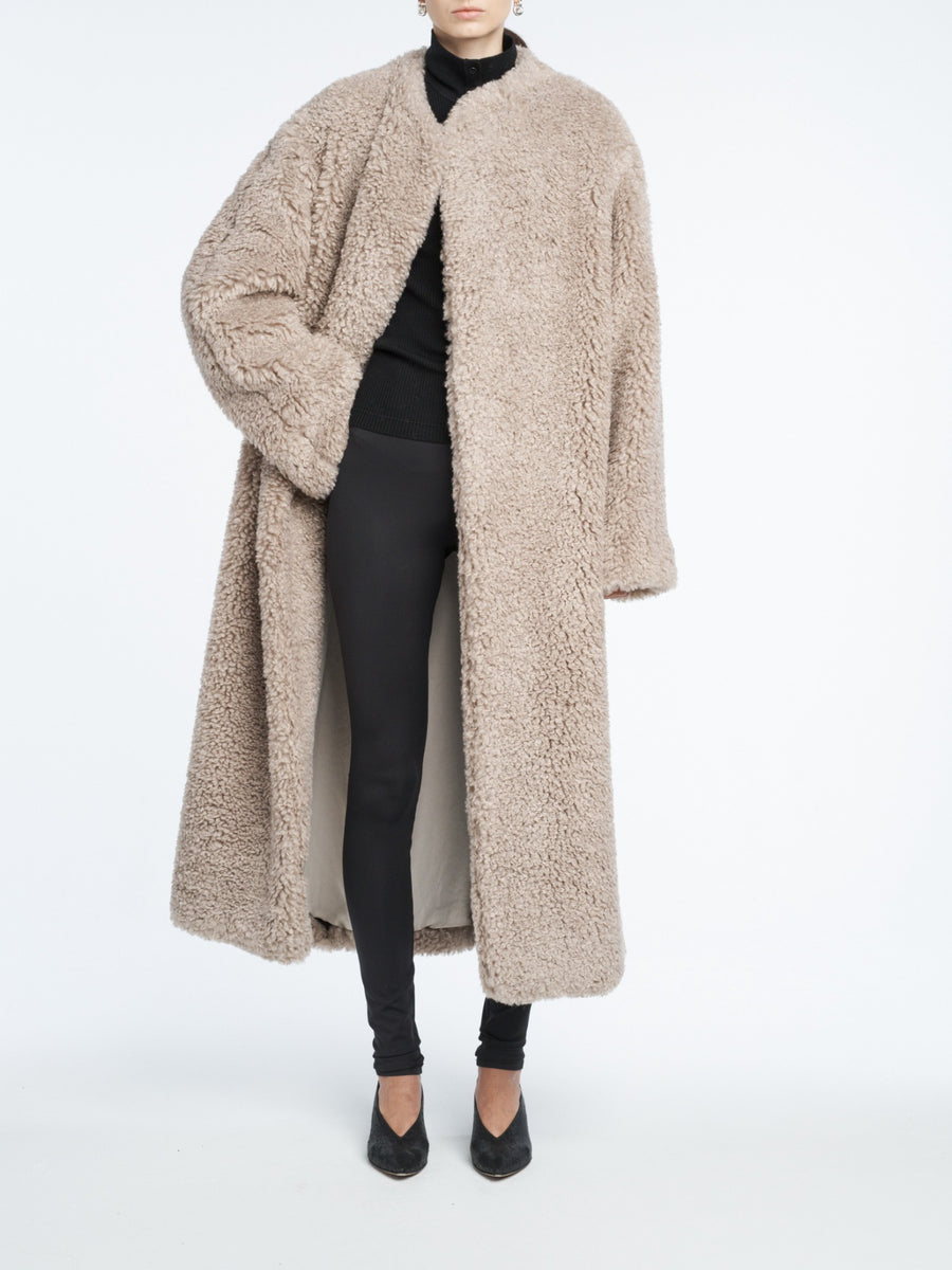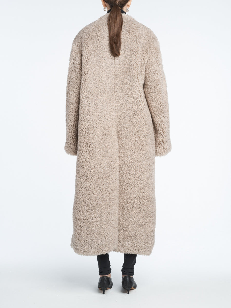 The Wrap Coat in pebble is a statement piece – made easy to throw over any look. Made of 100% soft Recycled Polyester Shearling with a relaxed, robe-like fit.