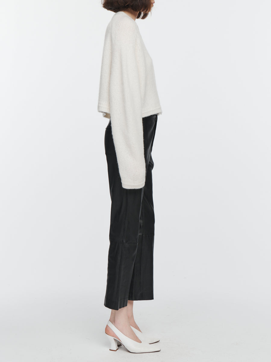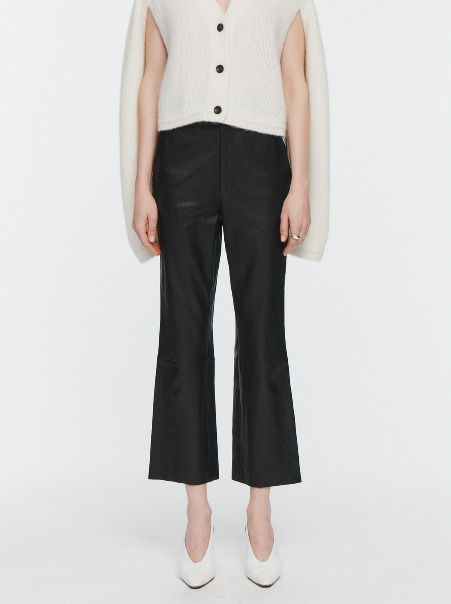 Our best selling High Waisted Crop trouser now offered in stretch leather. Made in New York City from a beautiful soft, stretch leather from a tannery in France known for their environmental practices, reducing water and chemical use in the tanning process. Featuring a high waist, slash pockets and a gentle, flattering flare at the bottom of the leg.