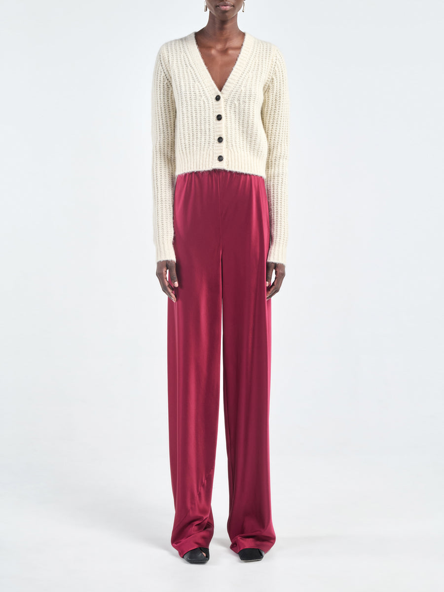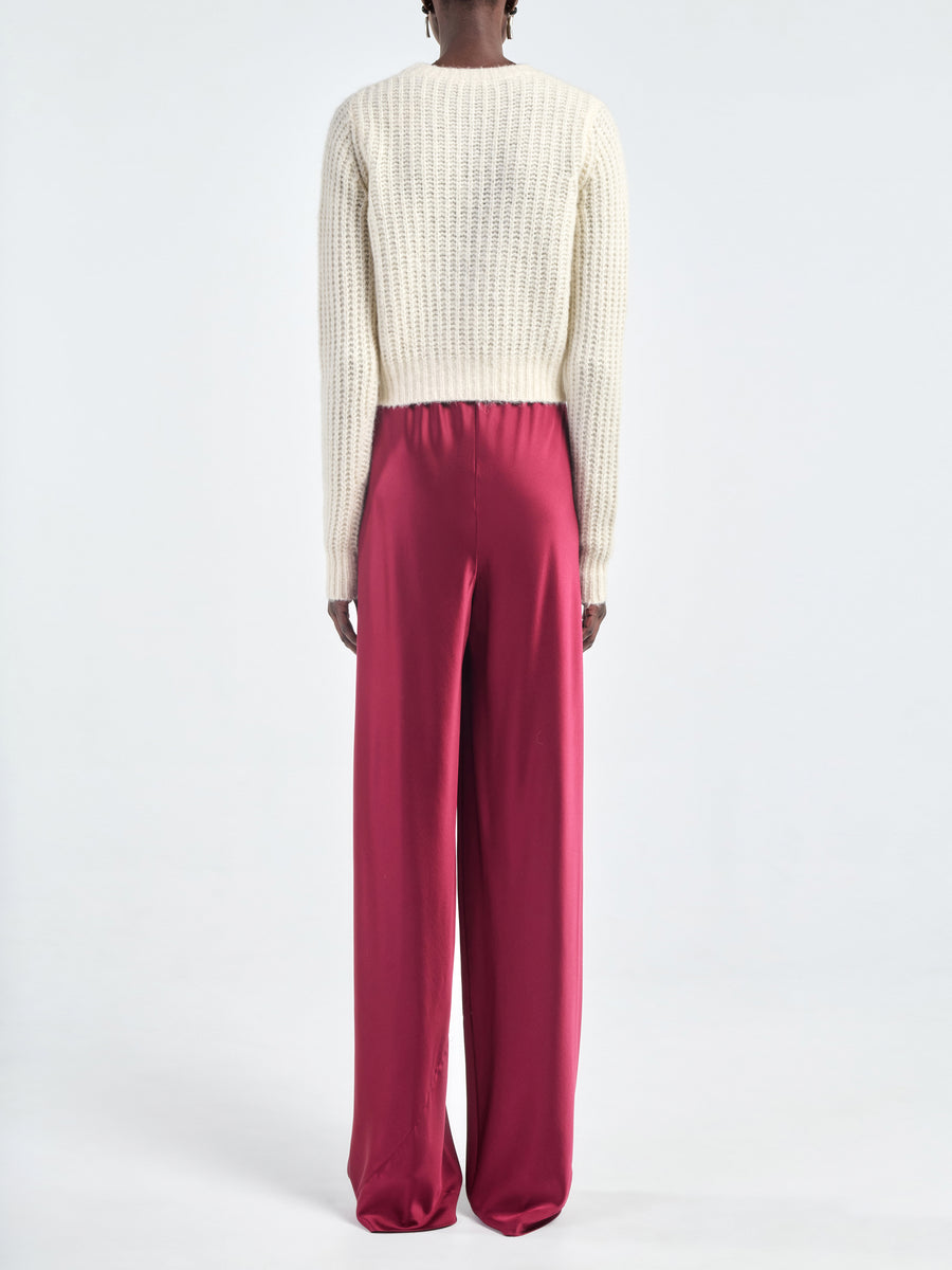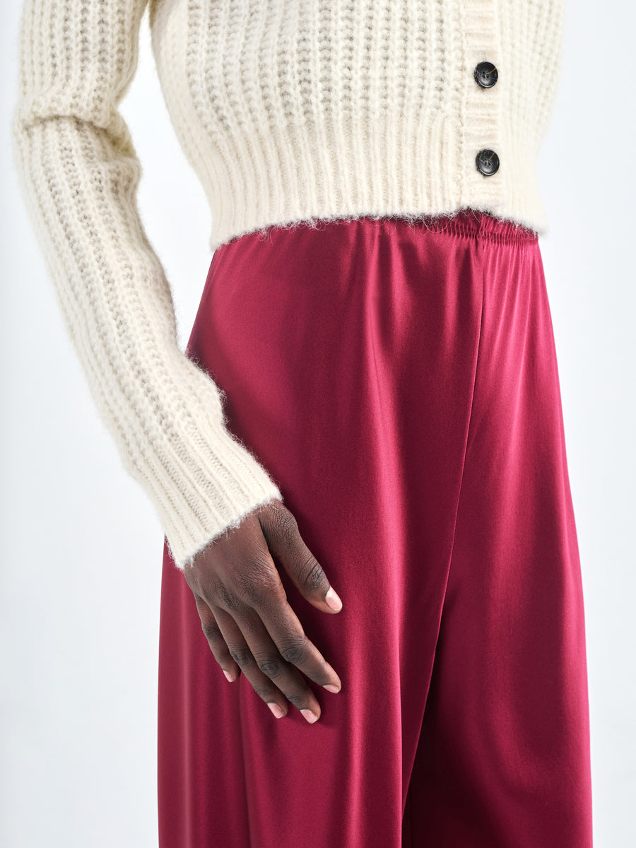 Our Bias Cut Trousers are made in a beautiful Japanese Naia Renew sateen. These trousers have a a delicate elasticated waistband, creating a very easy fit. They skim the hips and have a relaxed wide leg shape.