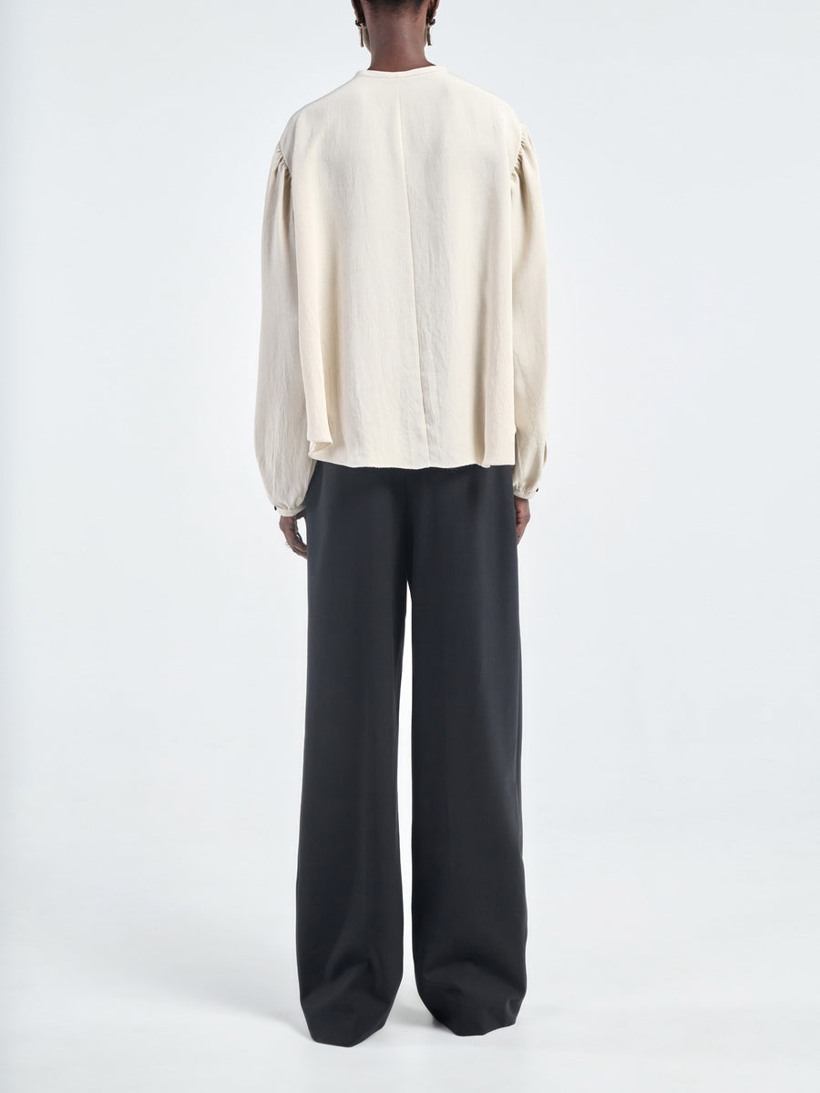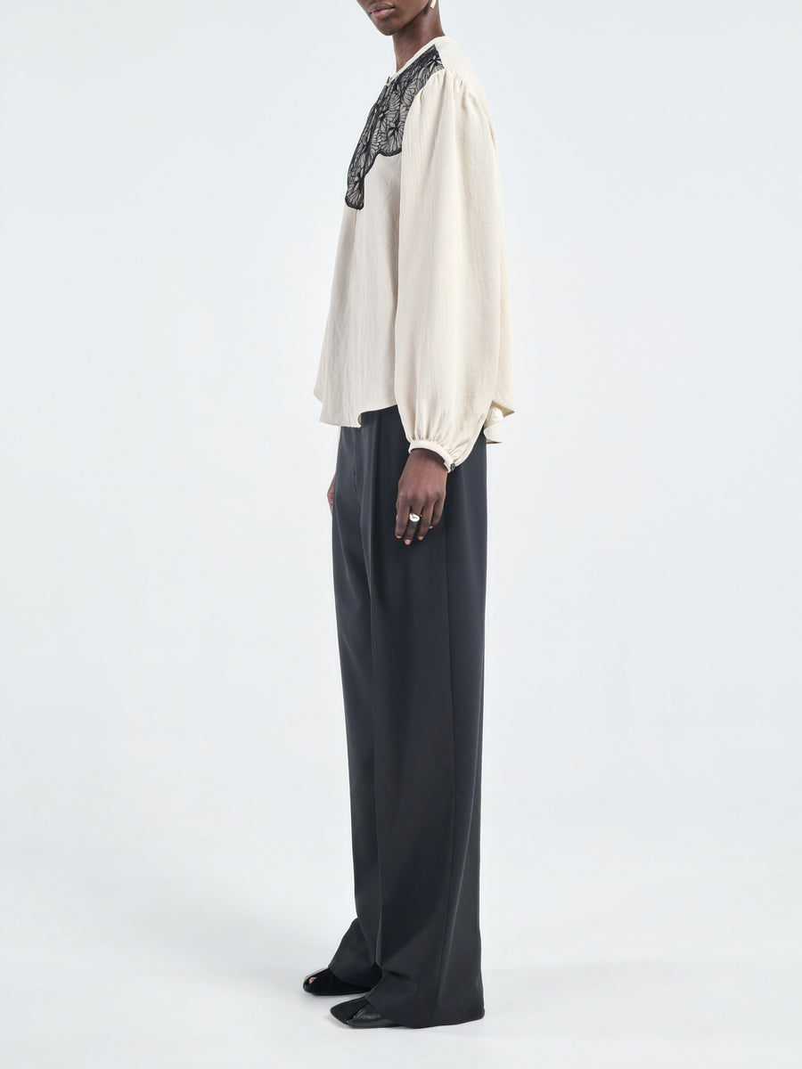 The Boho Lace Blouse in Ivory/Back is an easy drop shoulder silhouette made in Japanese Naia Renew™ matte twill. Featuring French Dentelle de Calais-Caudry® lace bib and corzo nut button closure at the center neck.
