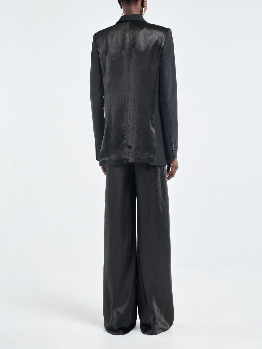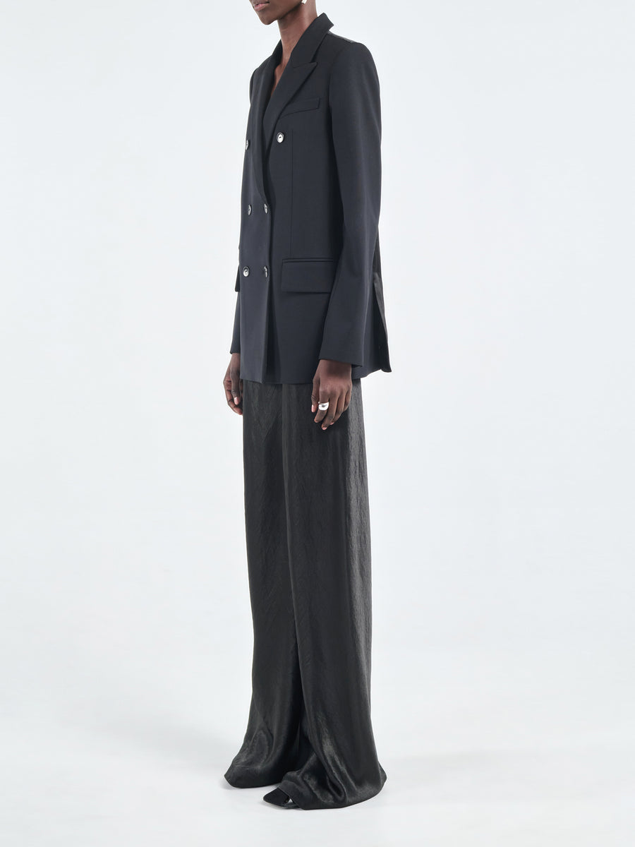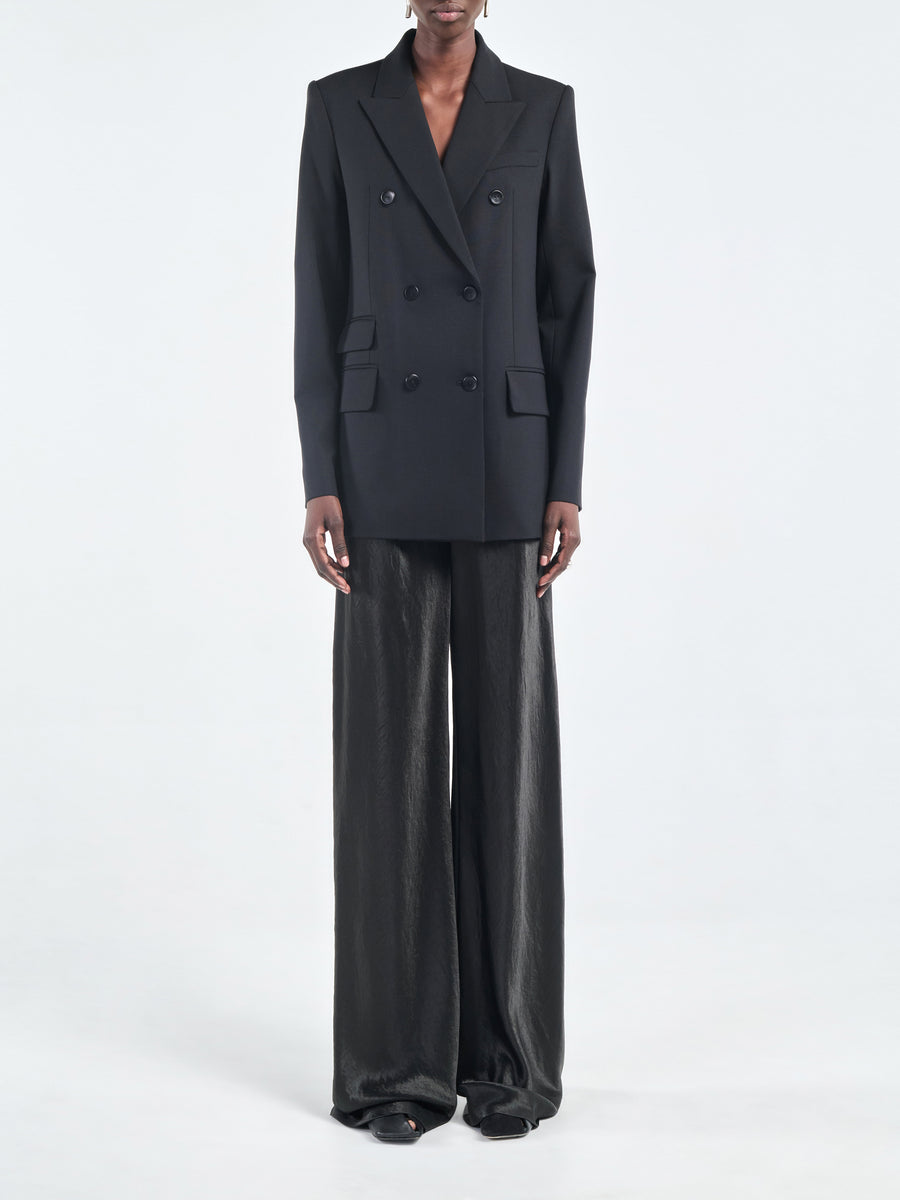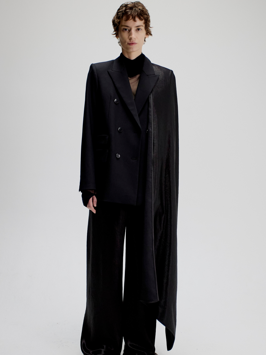 Our signature Double Breasted Blazer in responsible black Italian wool basketweave. It features a strong shoulder, is double breasted, and has a detachable cloak scarf in Japanese Naia Renew sateen twill. The scarf can be wrapped, worn long, or removed completely. The blazer is finished with an organic cotton lining and biodegradable black corozo nut buttons at the front and cuffs.