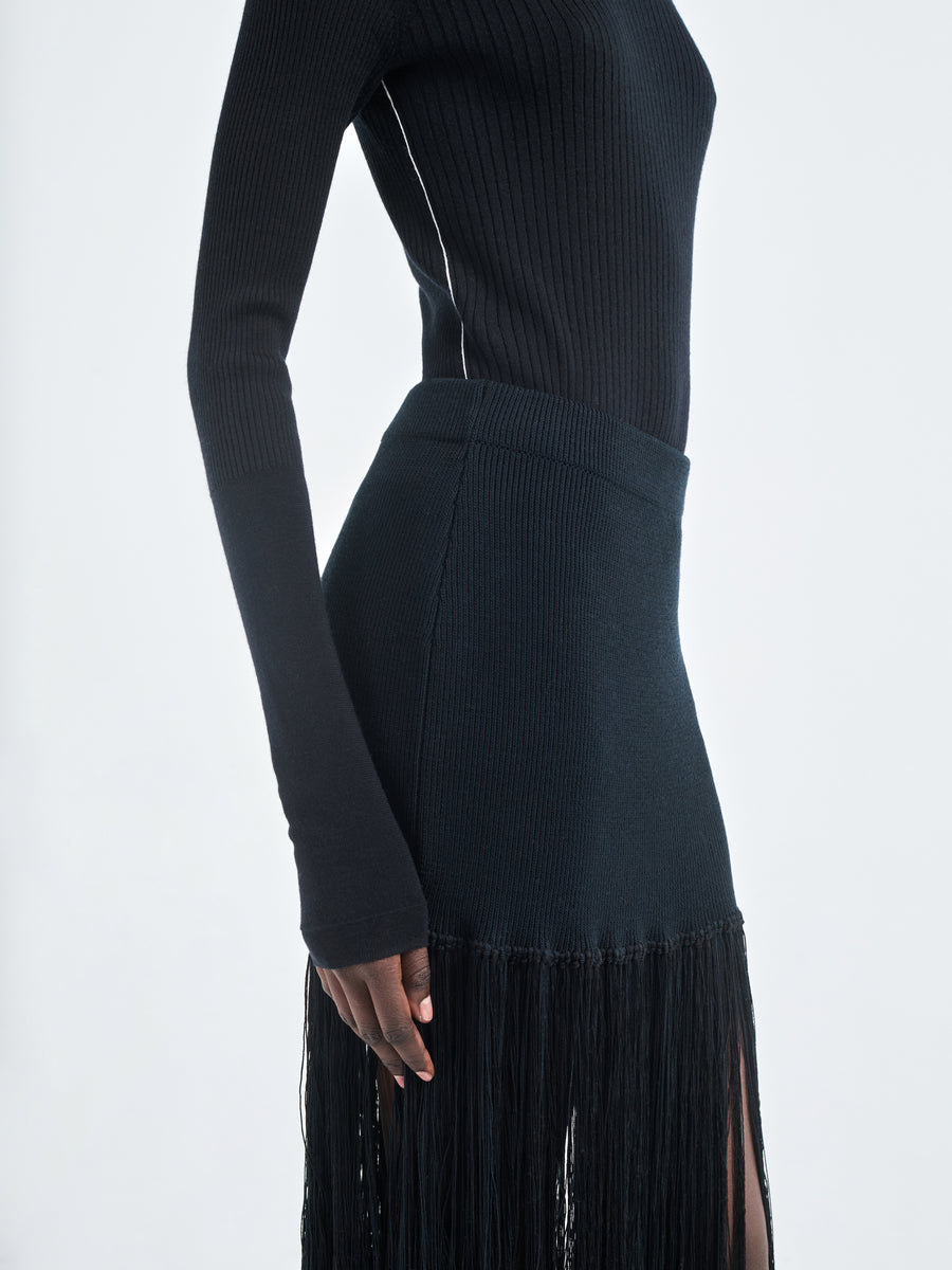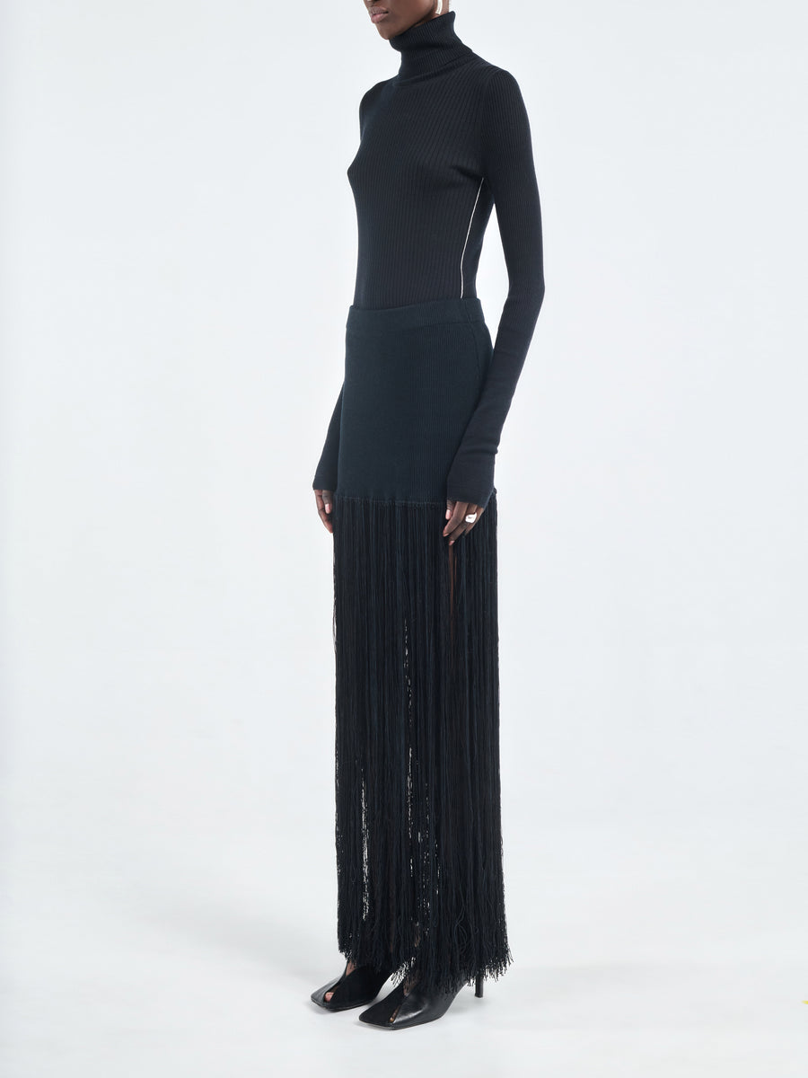Black hand-knotted skirt in 100% organic mercerized cotton. Features long fringe detailing and a fluid drape. Can be worn as a statement layer with a blazer or turtle neck.