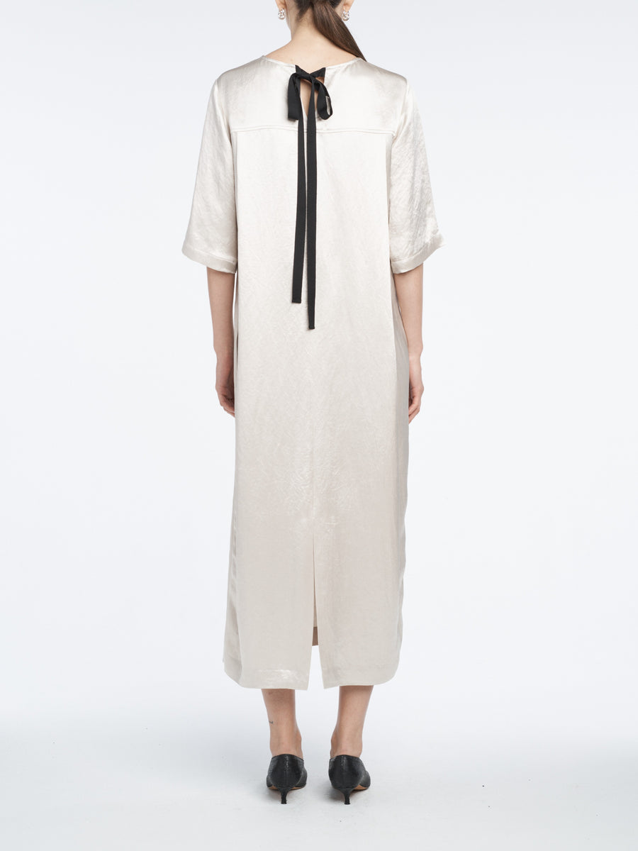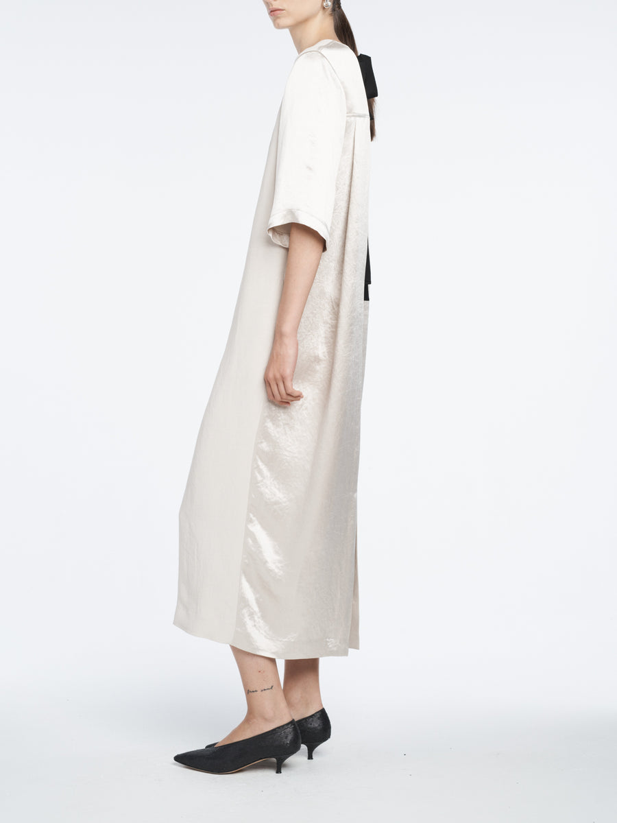 The Midi T-Shirt Dress is locally made from champagne Japanese Naia Renw sateen, providing a dynamic look with a matte front and a lustrous back and sleeves. With a loose silhouette, hidden pocketing, and a black close defined by a black ribbon.