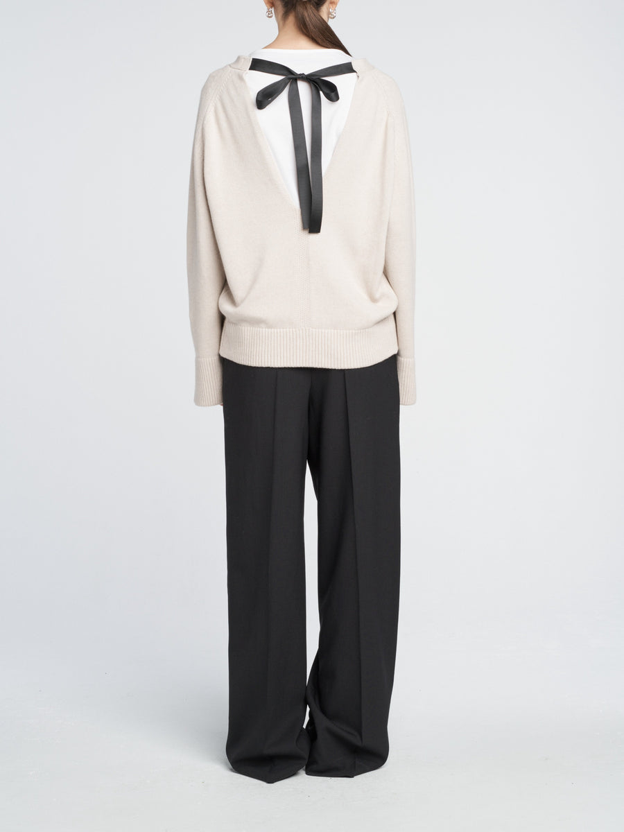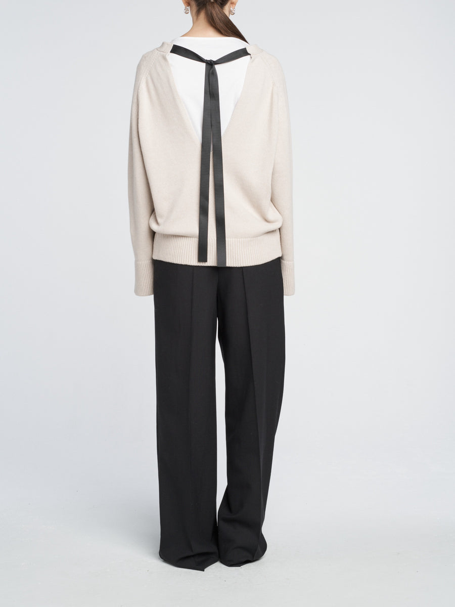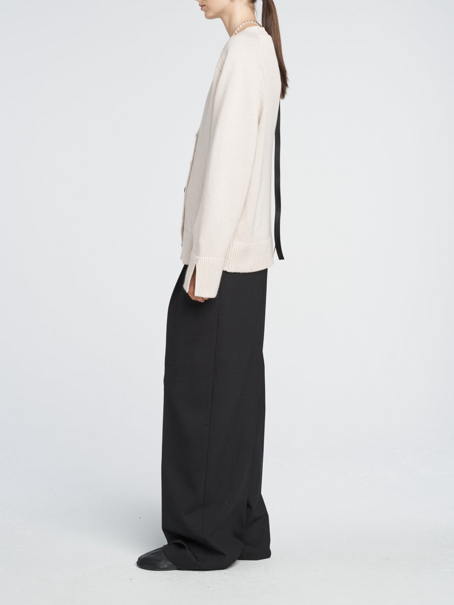 The Ribbon Cardigan in ivory is a novel approach to the classic cardigan. Made in a soft Italian cashmere cotton blend, this oversized cardigan is defined by a tear drop opening at the back finished with a black ribbon close. Completed with a deep V neck, slits at the cuffs, and our signature black corozo buttons.