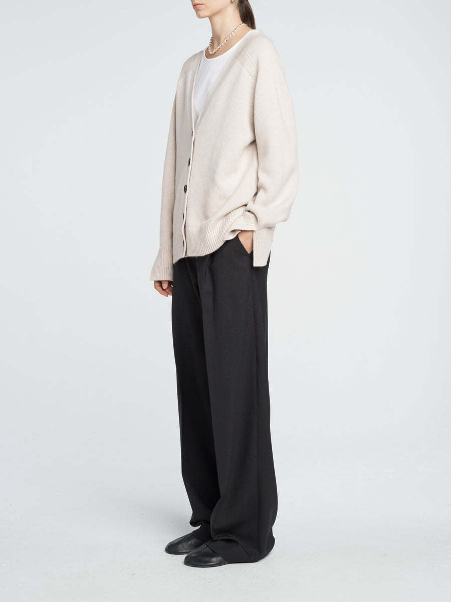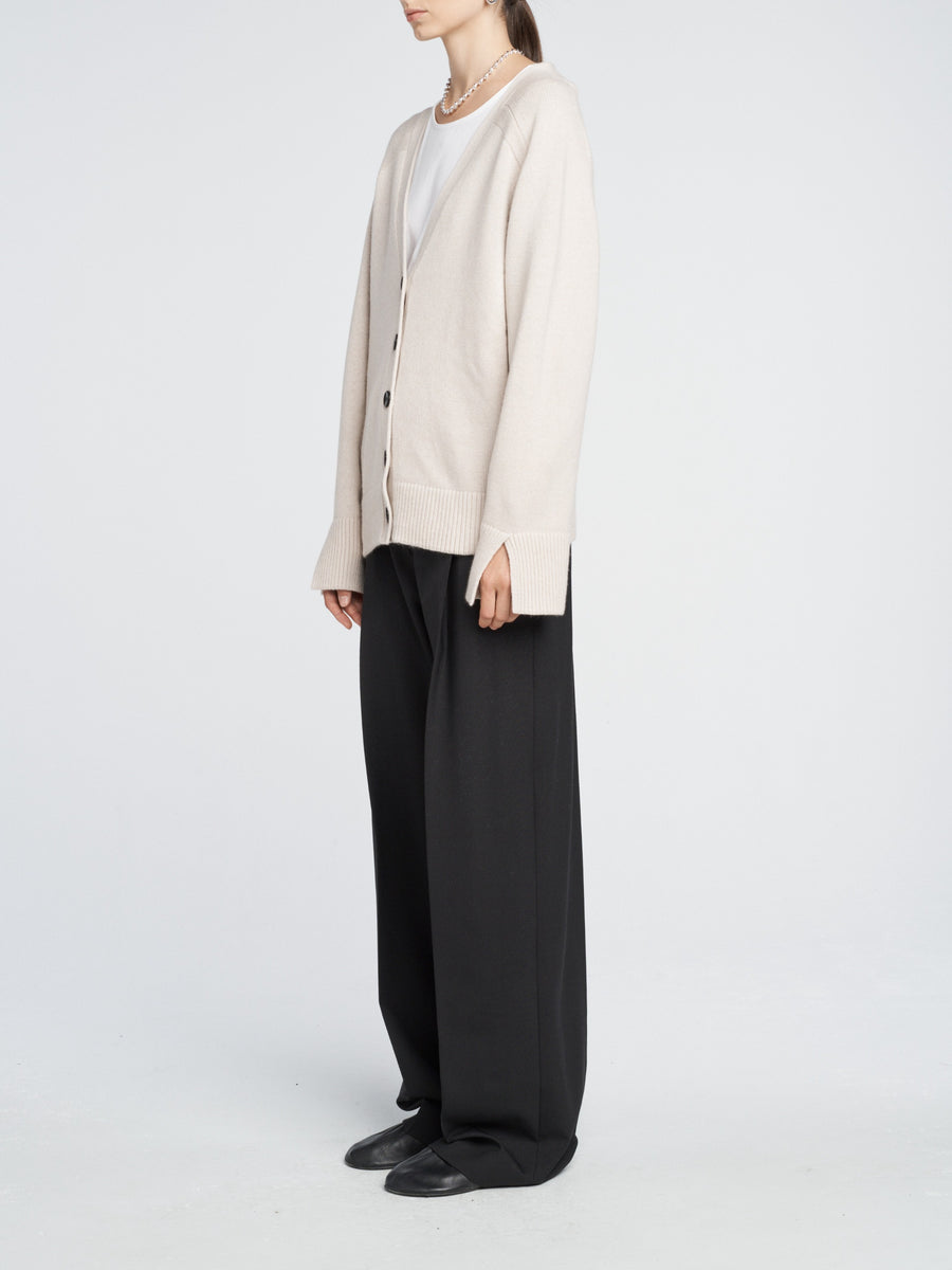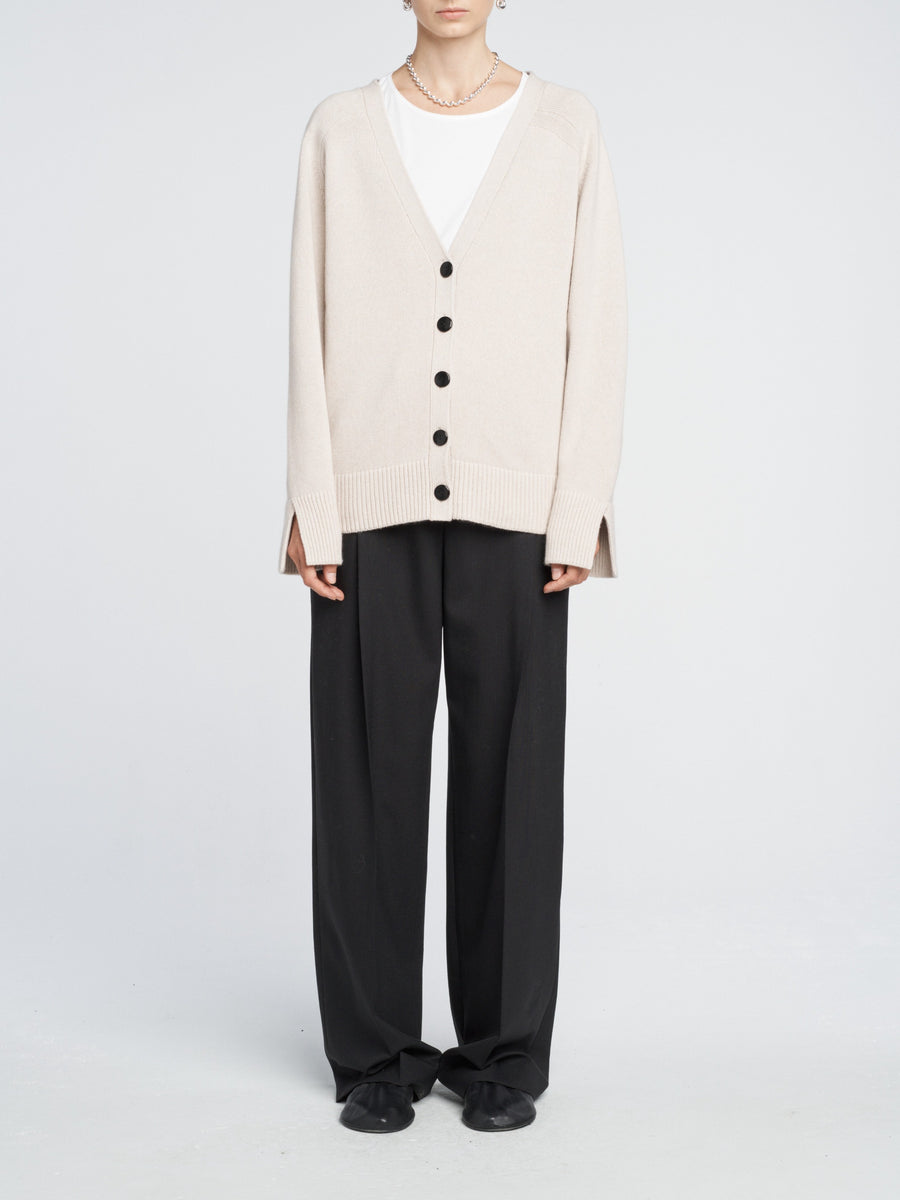 The Ribbon Cardigan in ivory is a novel approach to the classic cardigan. Made in a soft Italian cashmere cotton blend, this oversized cardigan is defined by a tear drop opening at the back finished with a black ribbon close. Completed with a deep V neck, slits at the cuffs, and our signature black corozo buttons.
