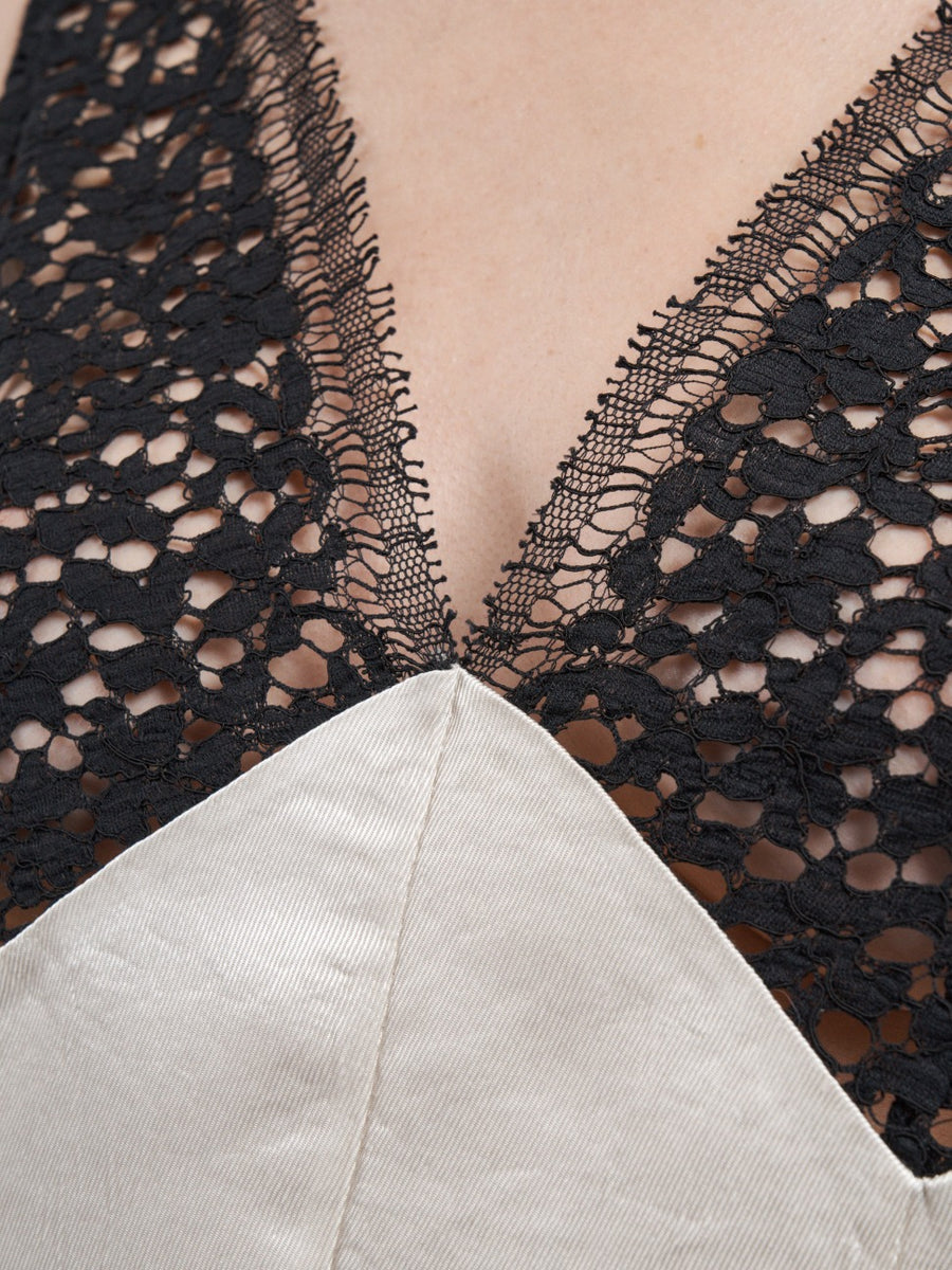 Developed in our ivory Naia™ twill, this top is thoughtfully paneled for a flattering fit. The bust features delicate black Parisian lace panels with intricate eyelash detailing, complementing graceful V-necklines at the front and back.