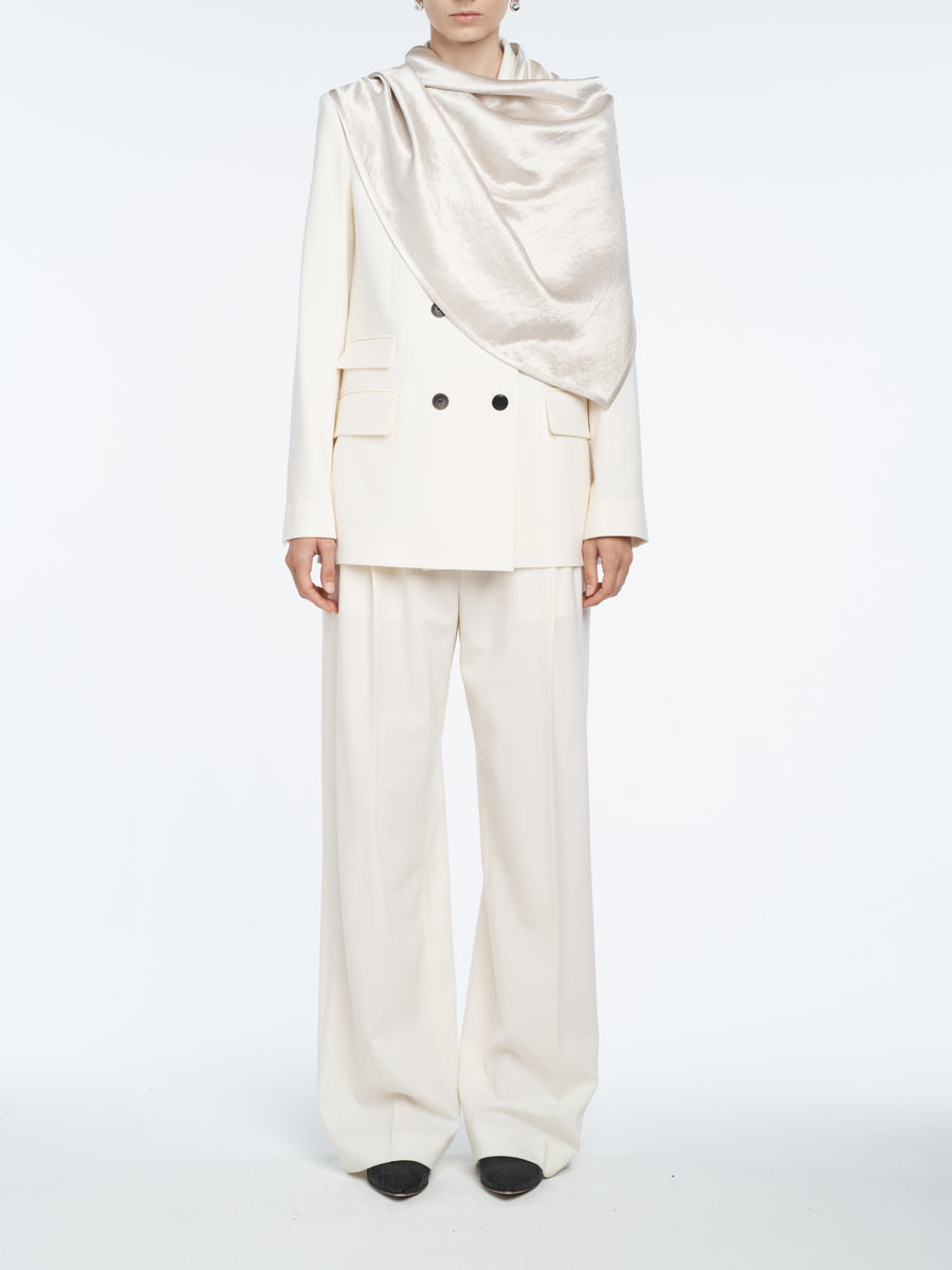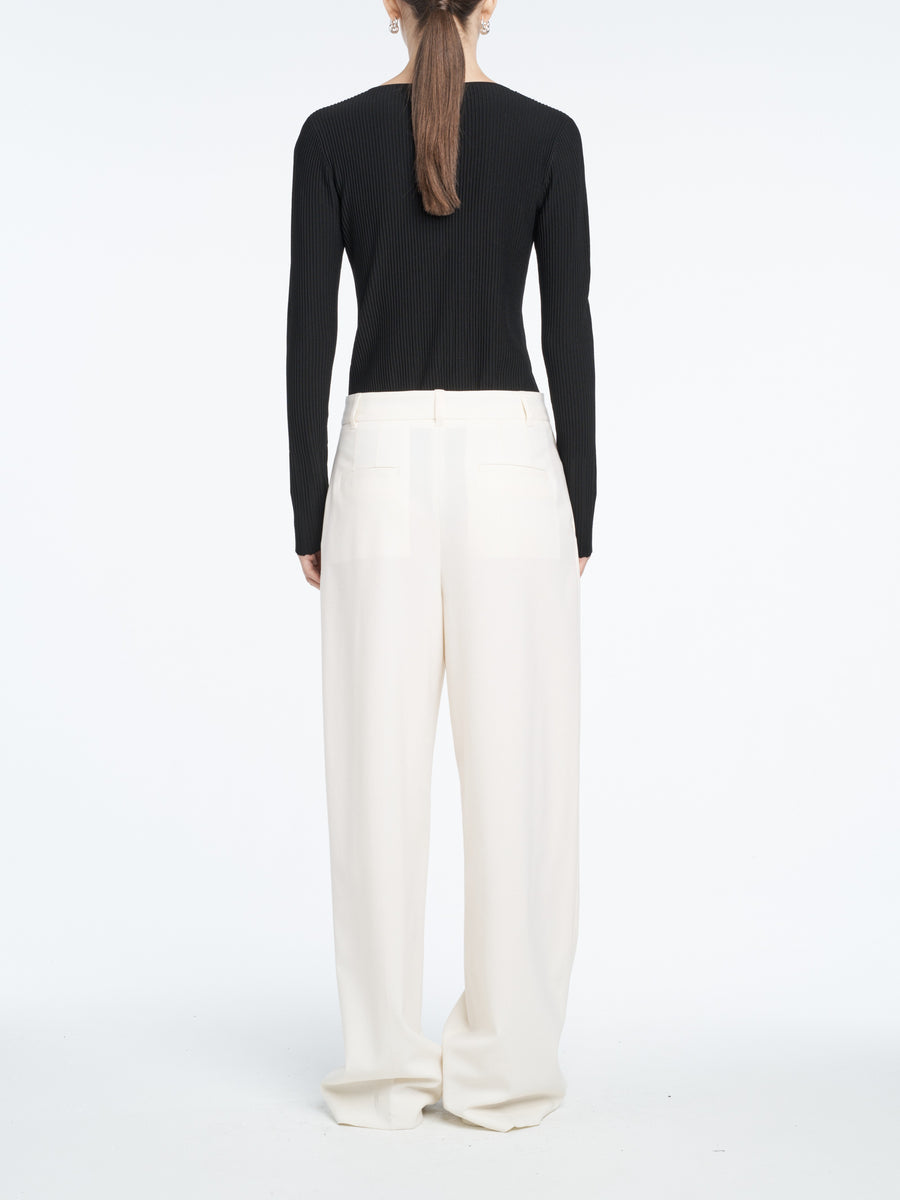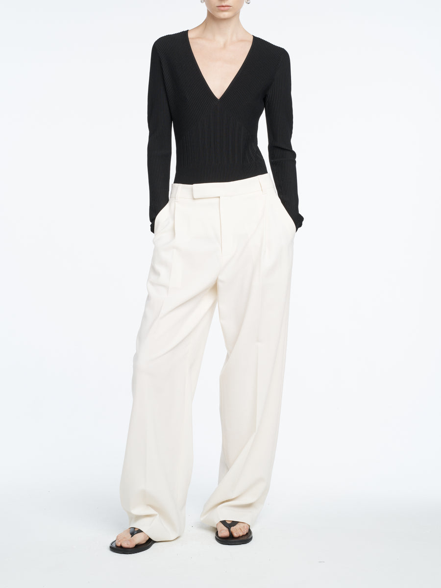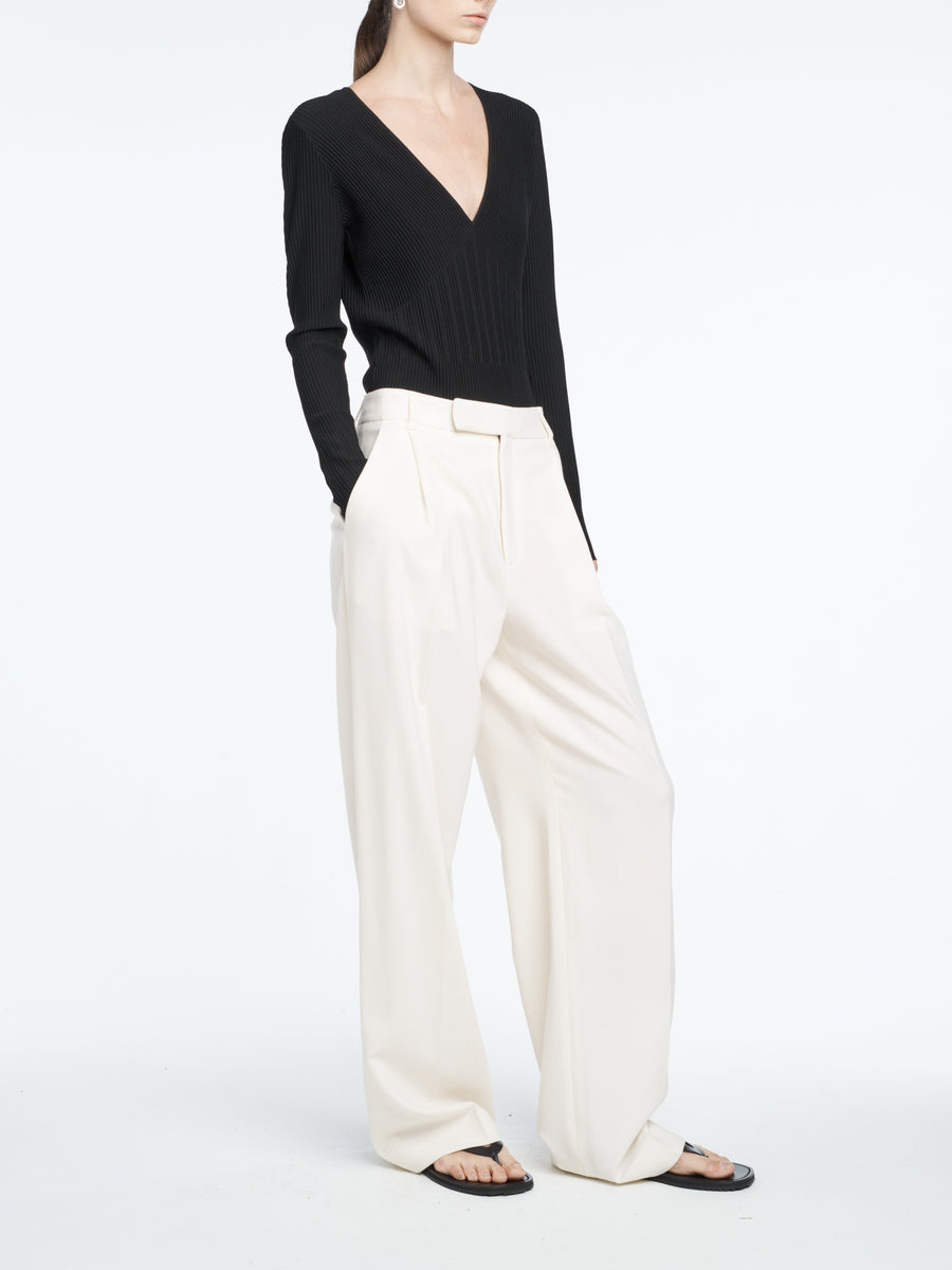 A classic trouser in an ivory lightweight wool basketweave fabrication. Fits mid-rise with a wide leg detailed with a single pleat.