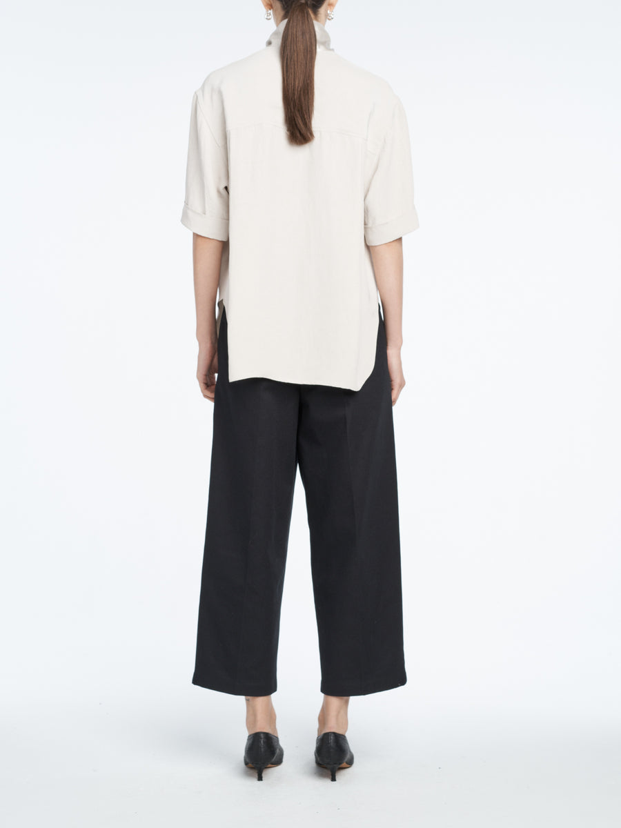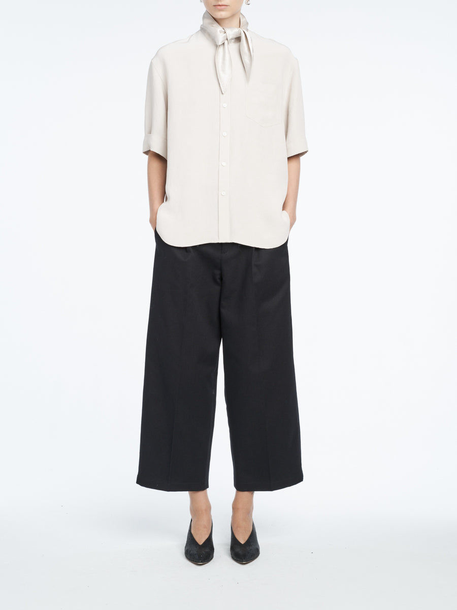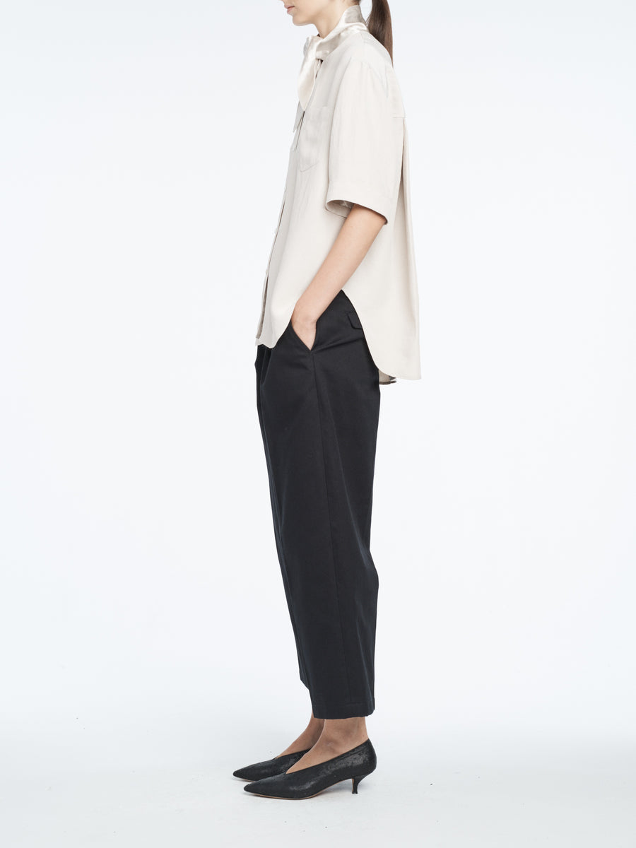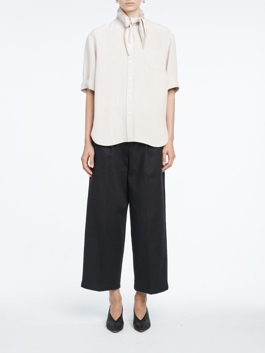 A classic easy fit short sleeve silhouette made of matte Naia Renew sateen, defined by shiny matching tie neck.