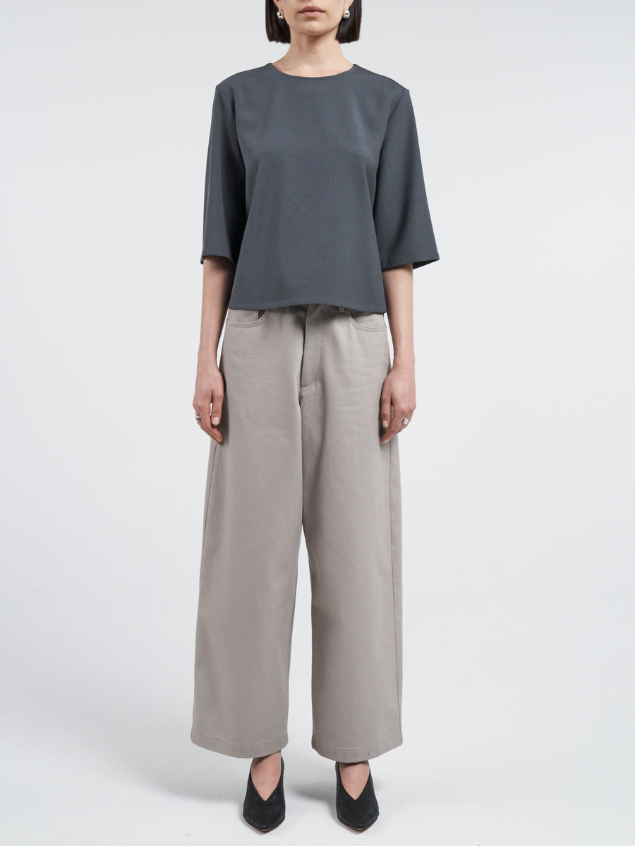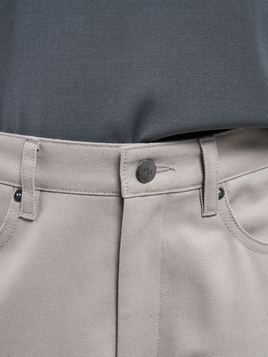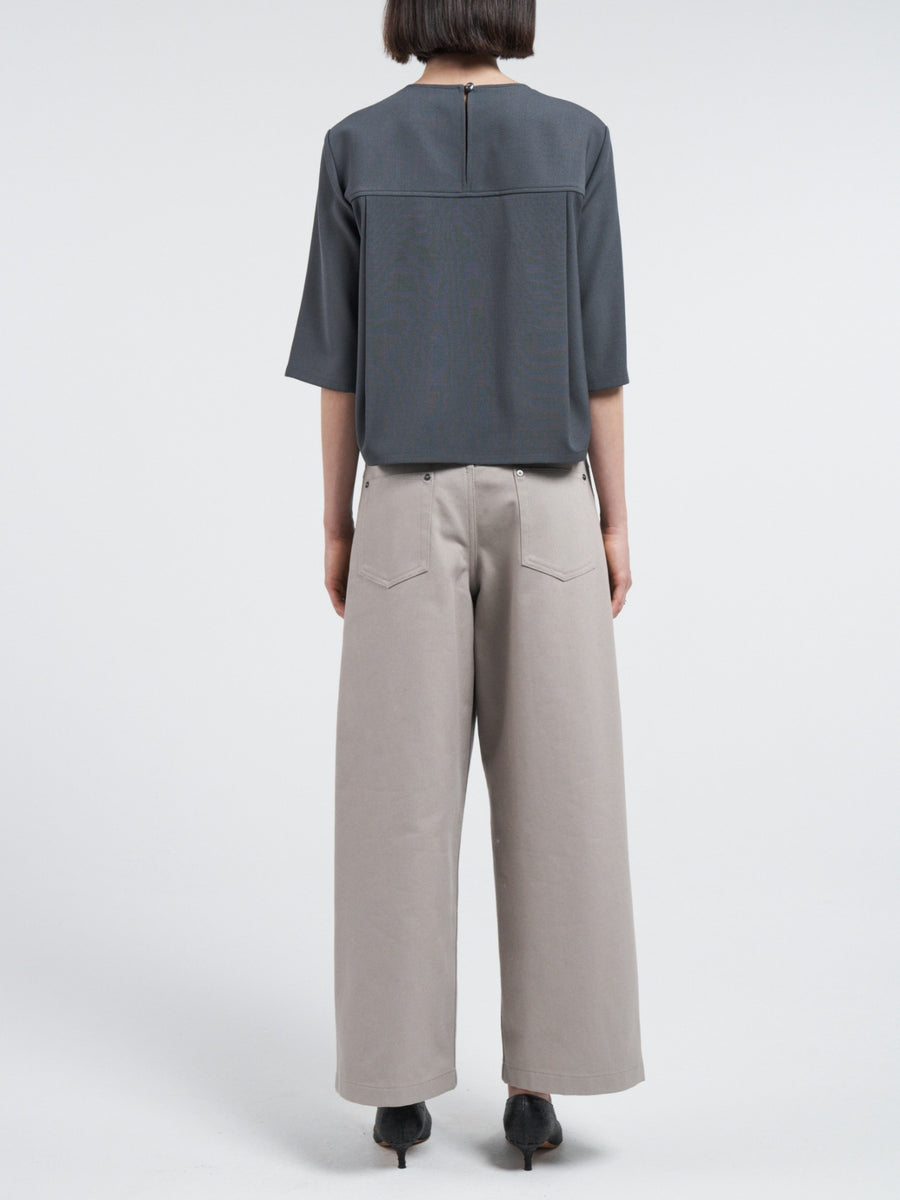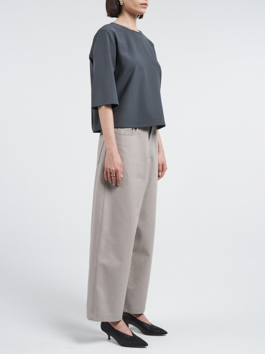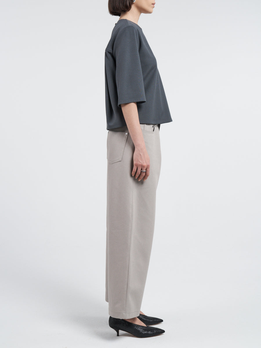 Fashioned in our organic cotton, the “5 Pocket Wide Leg Jean” merges the structure of a trouser with the relaxed feel of baggy jeans. Sitting at a mid-rise, these pants feature classic jean elements, recycled monogram shank button, rivets, and a back yoke.