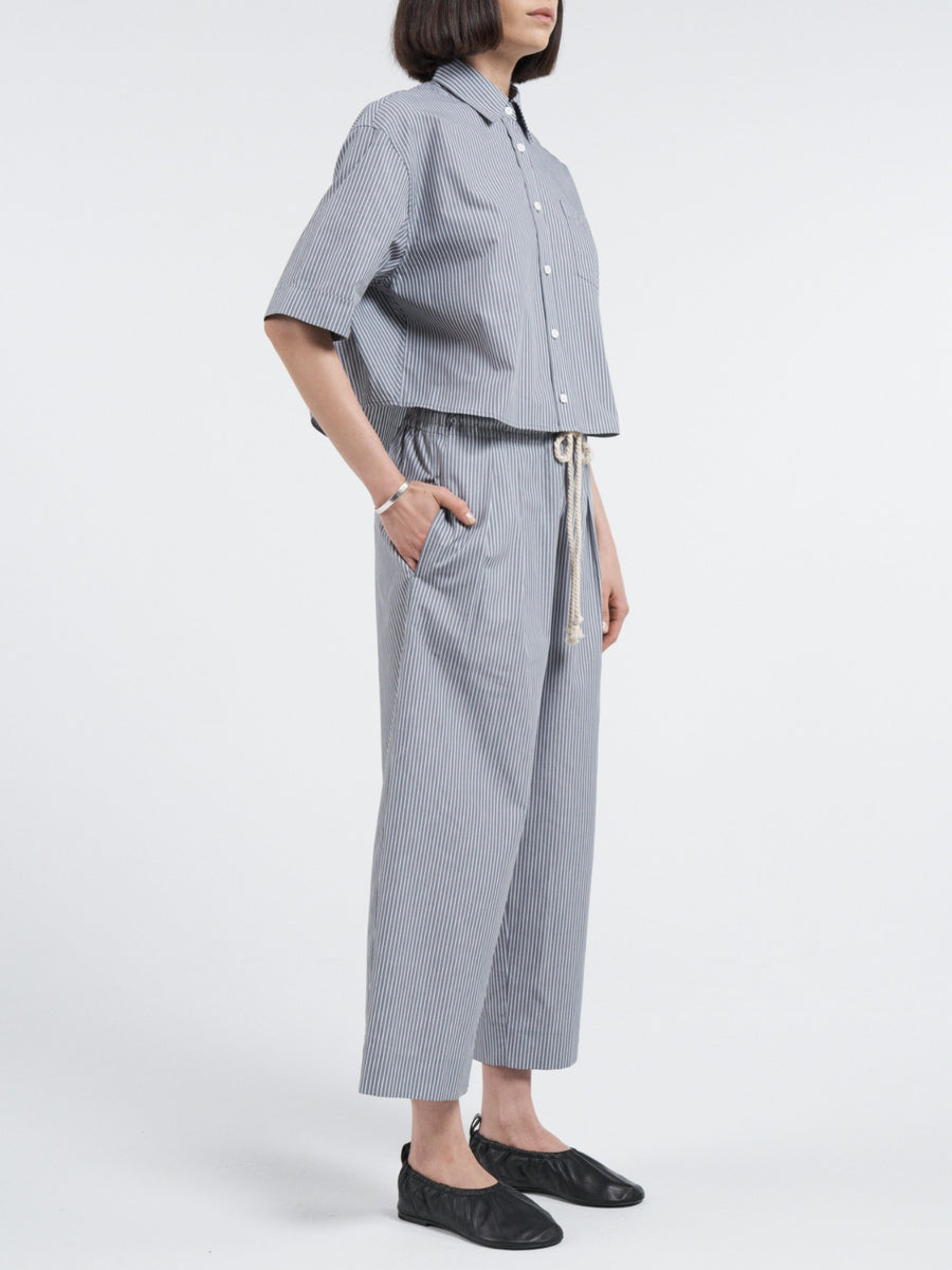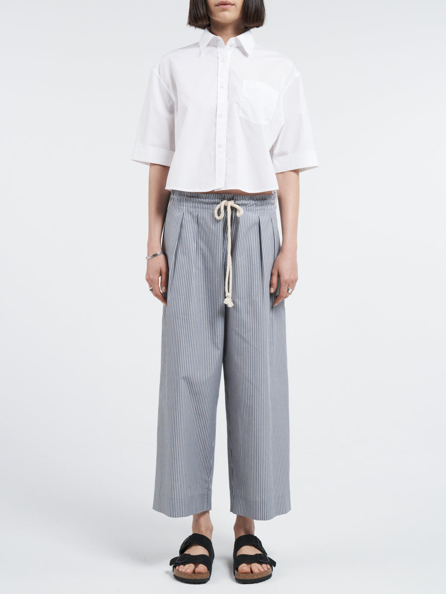 A new fabrication of our best selling drawstring pant. This Grey railroad striped cotton relaxed, cozy pant combines the comfort of loungewear with the styling and fabrication of a trouser. Featuring an elasticated waistband, front pleats and braided rope drawstring, it brings an elevated ease to everyday wear.