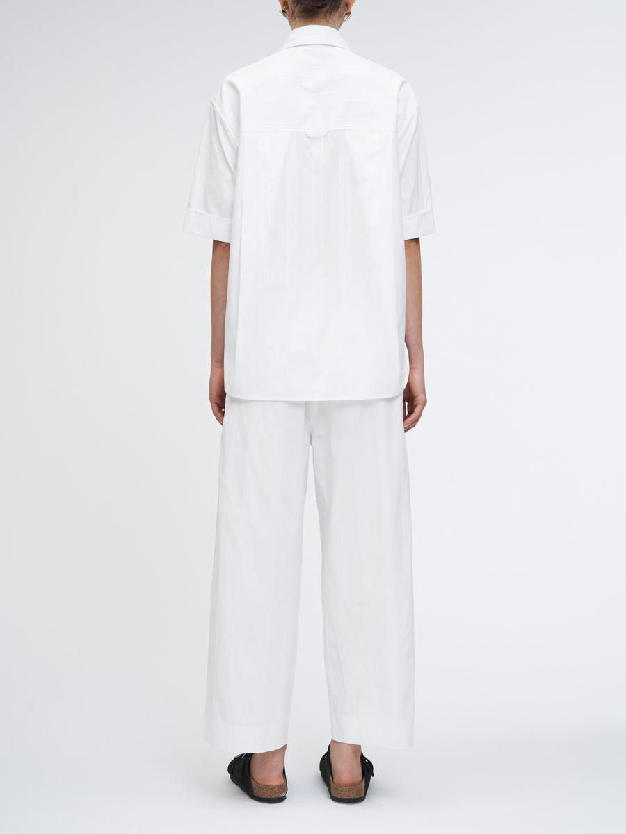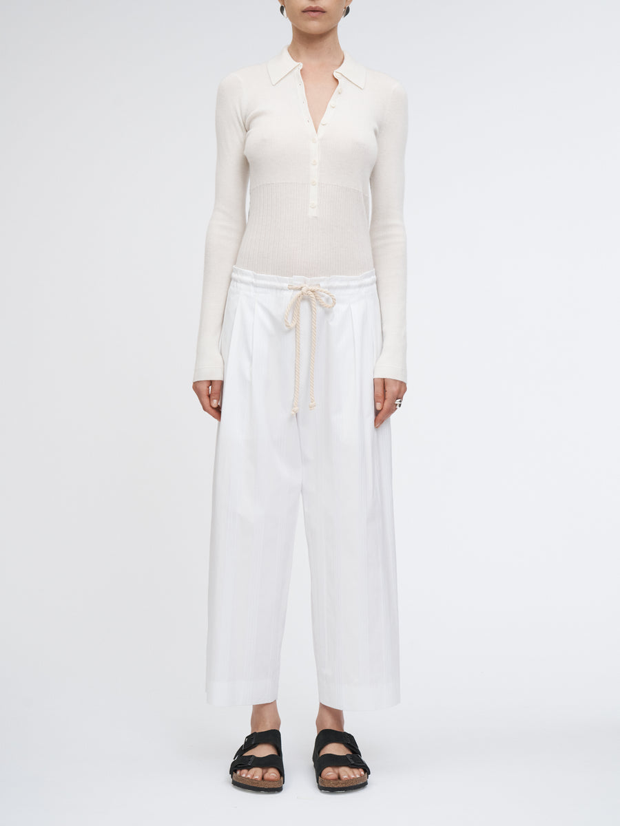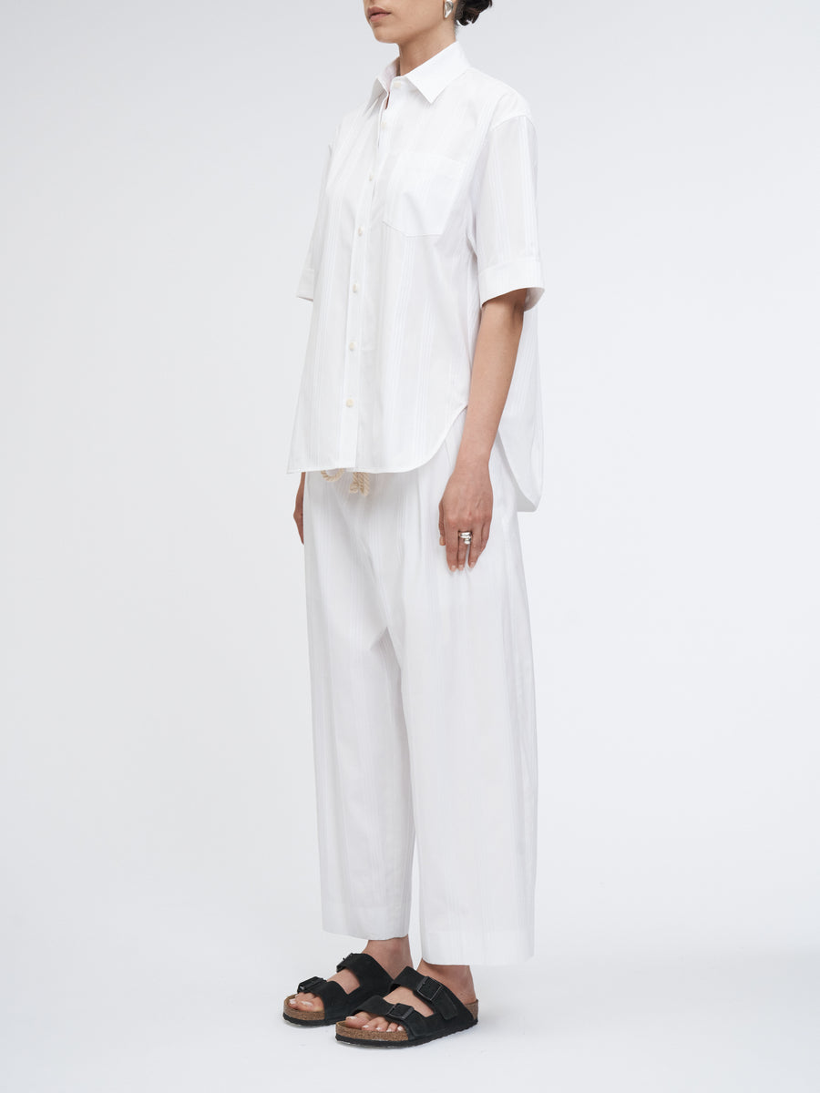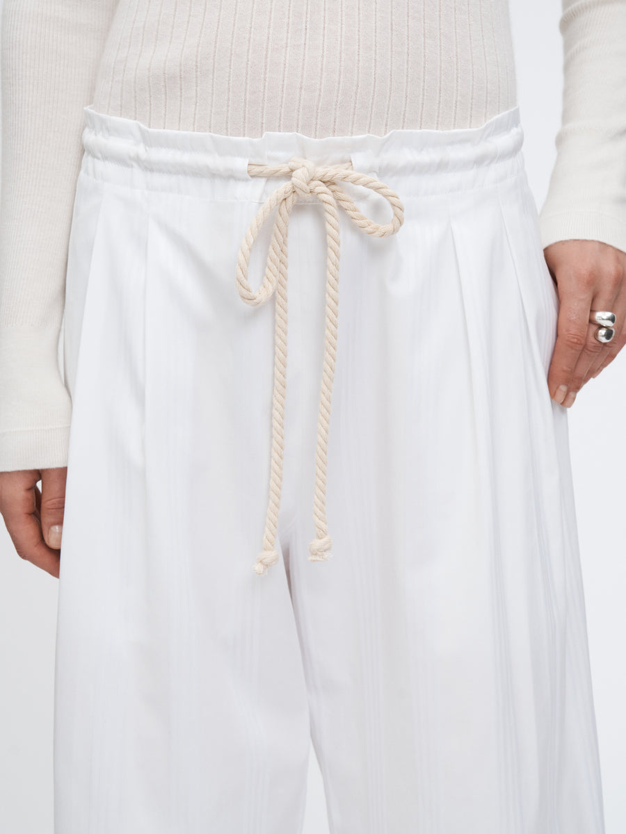 Crafted from our organic Portuguese cotton sateen, this pant features a subtle white-on-white stripe for a quiet detail. This best selling trouser silhouette features front pleats and elasticated drawstring waistband for comfort and ease.