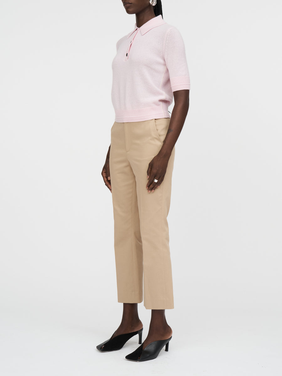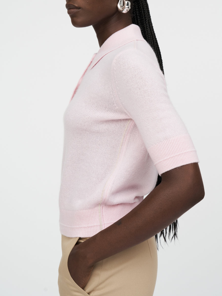 Made from our Italian recycled cashmere and organic cotton blend, this Petite Polo in Whisper Pink features a slim, tailored fit, fastened with three biodegradable buttons and finished with a crema link line at the side seams.