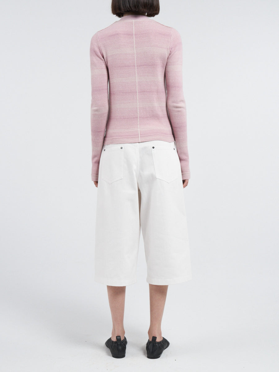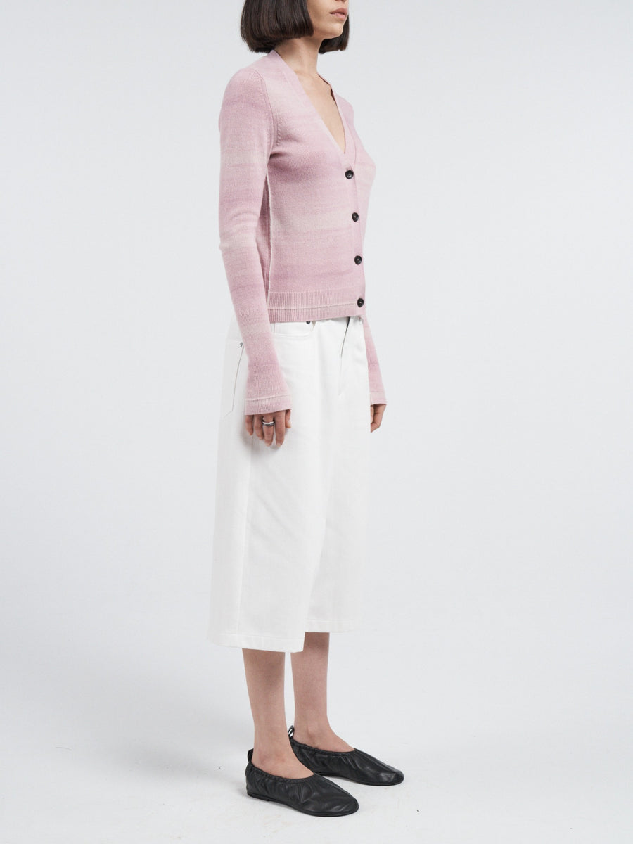 Crafted from space-dyed yarn, this slim cardigan fits closely to the body, offering a sleek and flattering silhouette. The unique dyeing process creates a tonal, 'smudged' stripe effect throughout the fabric. The deep V-neckline is complemented by a biodegradable button closure and elongated double rib-knit sleeve cuffs.