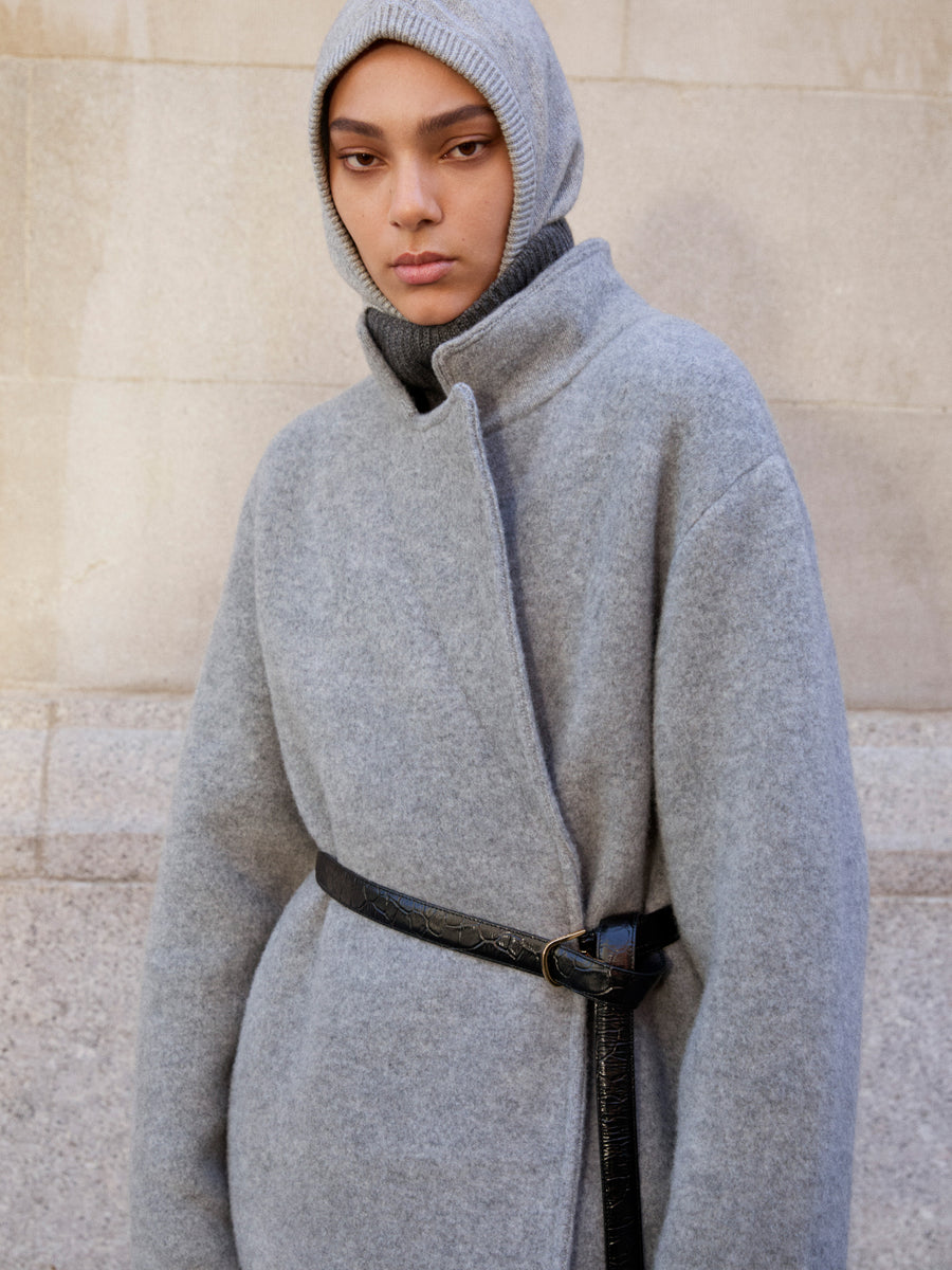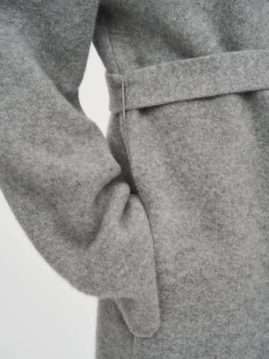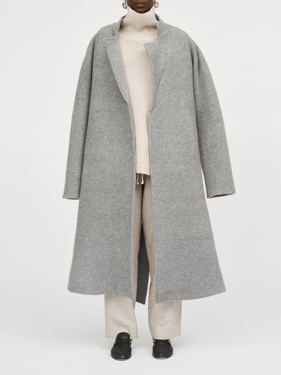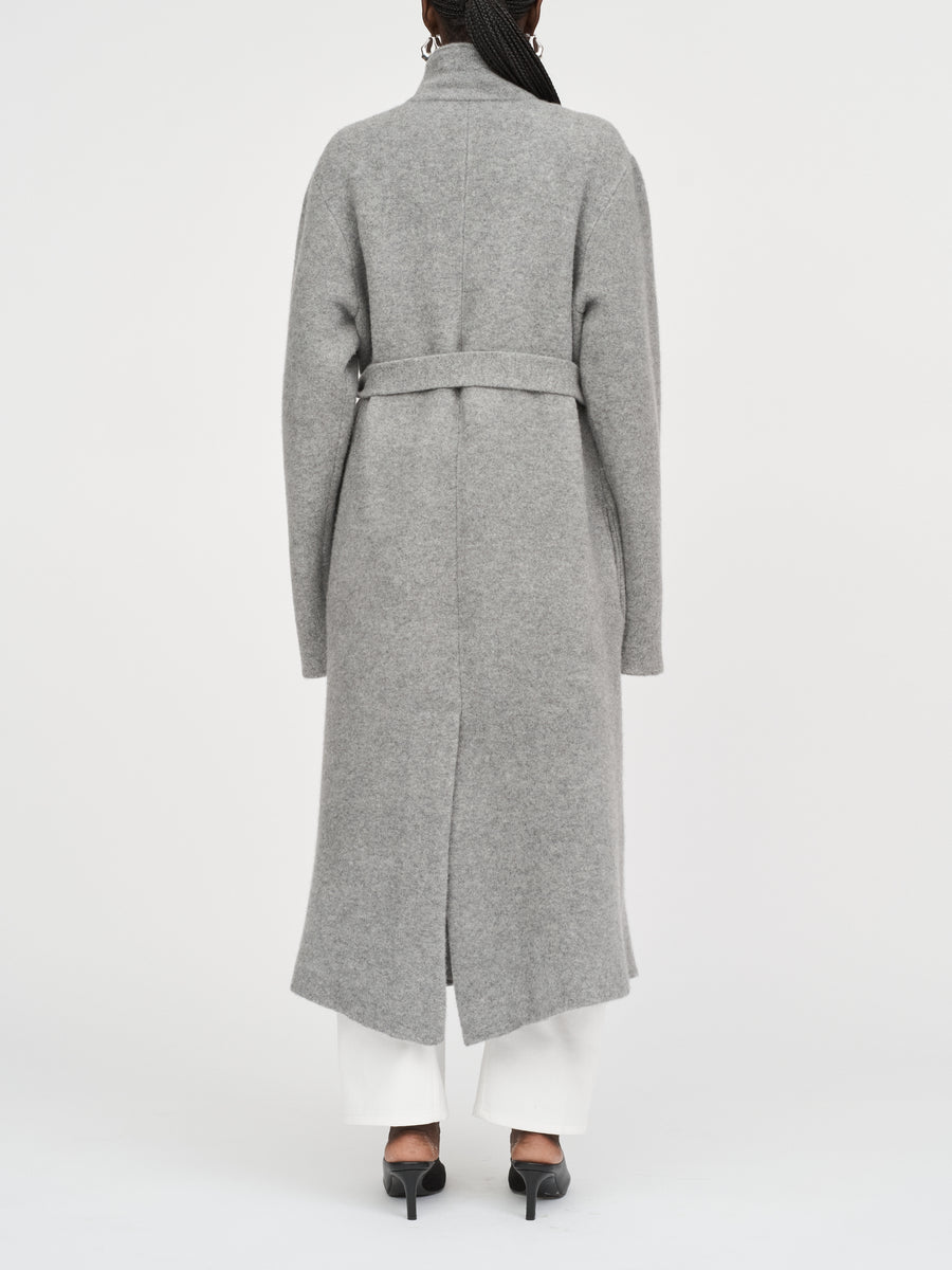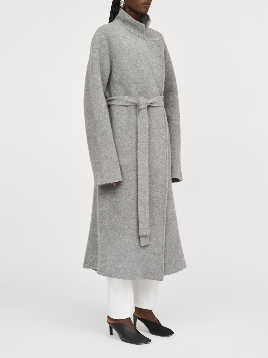 Crafted from merino felted wool, this coat offers a clean and warm design with no hardware maintaining a refined, minimal look. Featuring a notch lapel, tie belt, and back vent that allows for ease of movement.