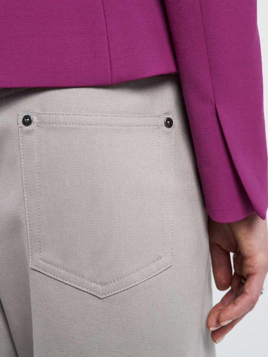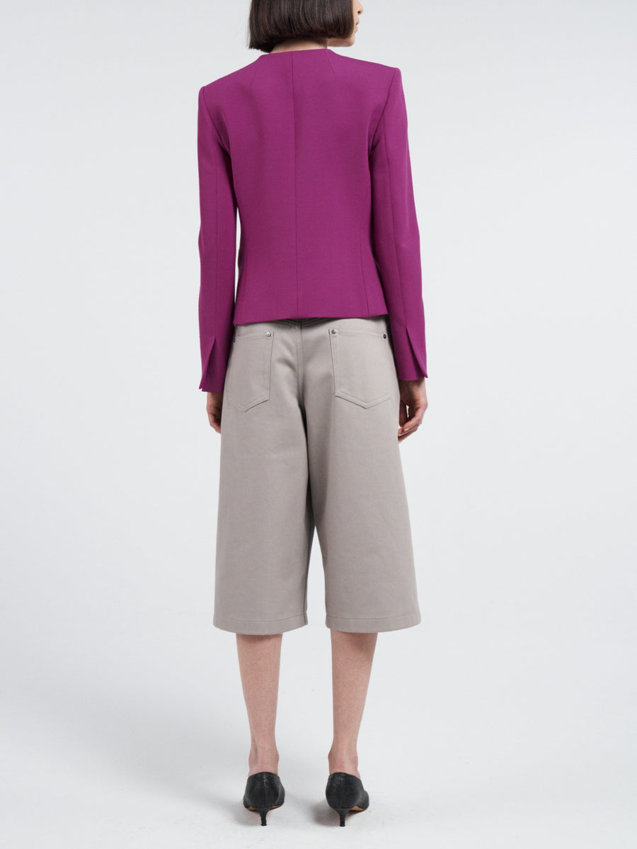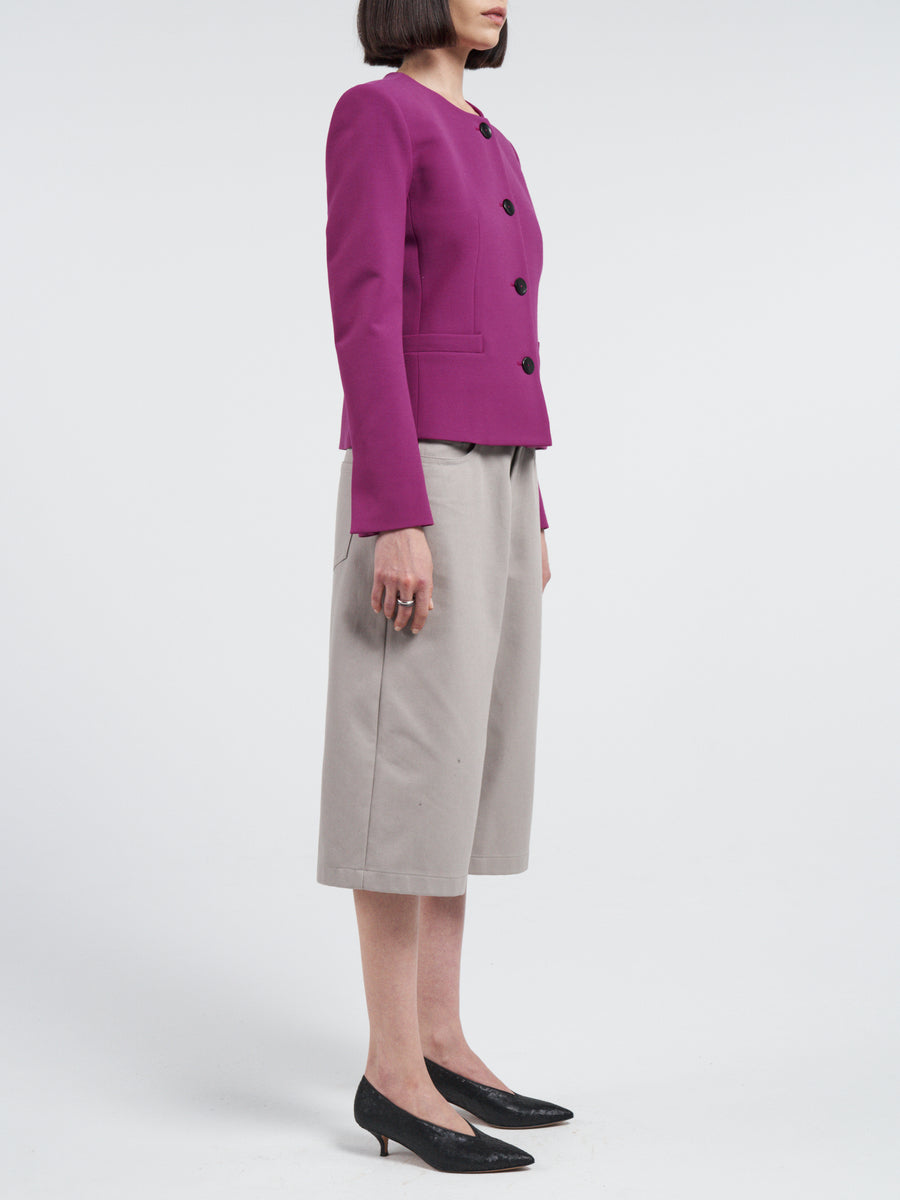 Crafted in responsible Italian wool basketweave, this bold magenta blazer features a fitted, structured silhouette. Detailed with four keyhole buttons, two single welt pockets.