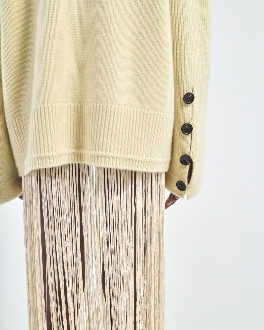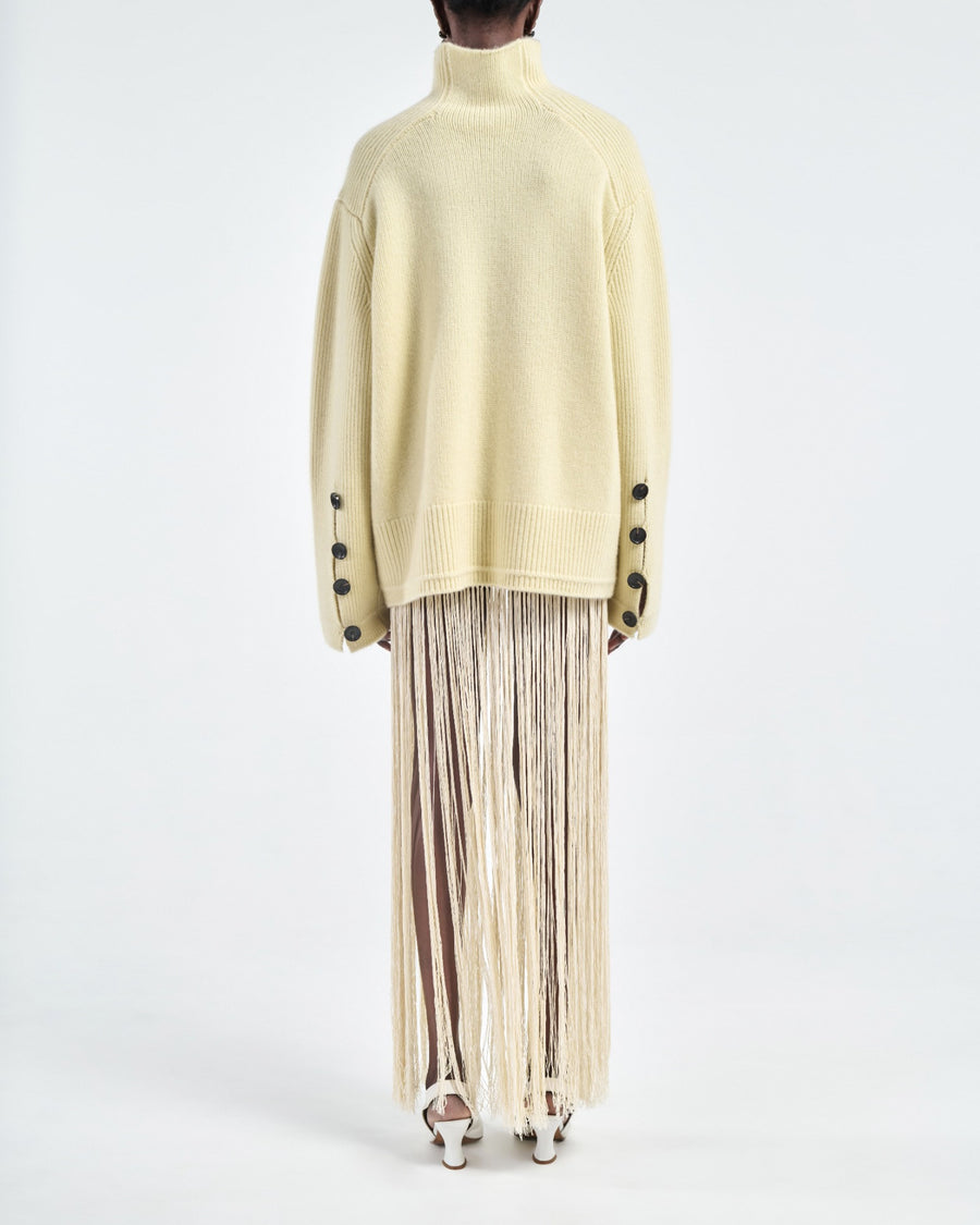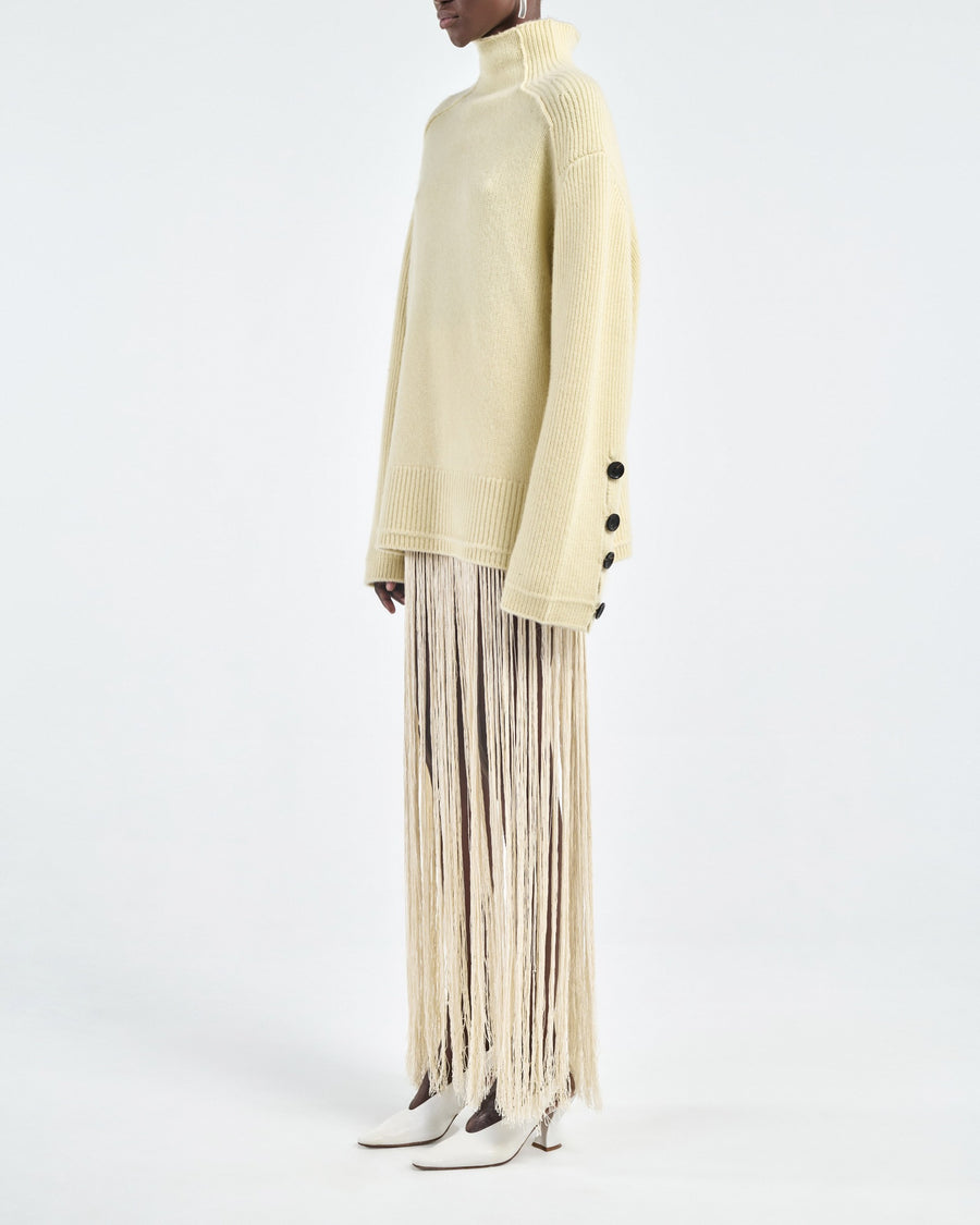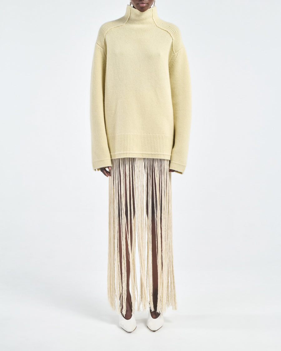 Ivory hand-knotted skirt in 100% organic mercerized cotton. Features long fringe detailing and a fluid drape. Worn as a statement layer.