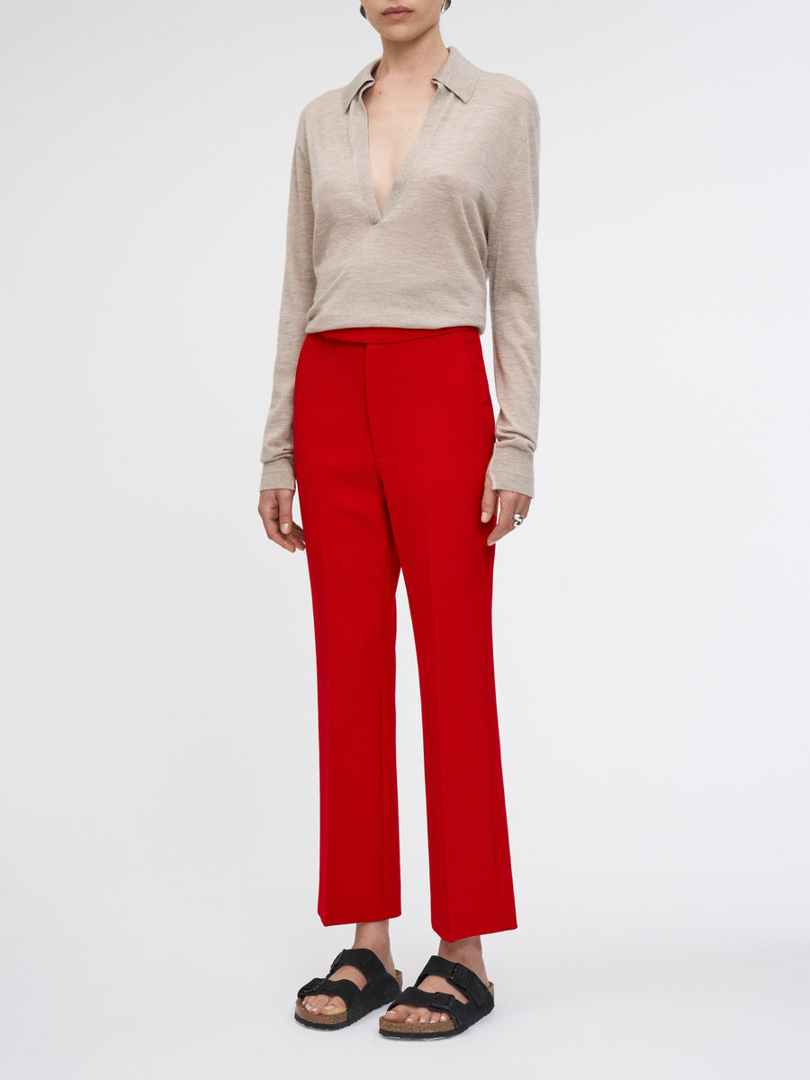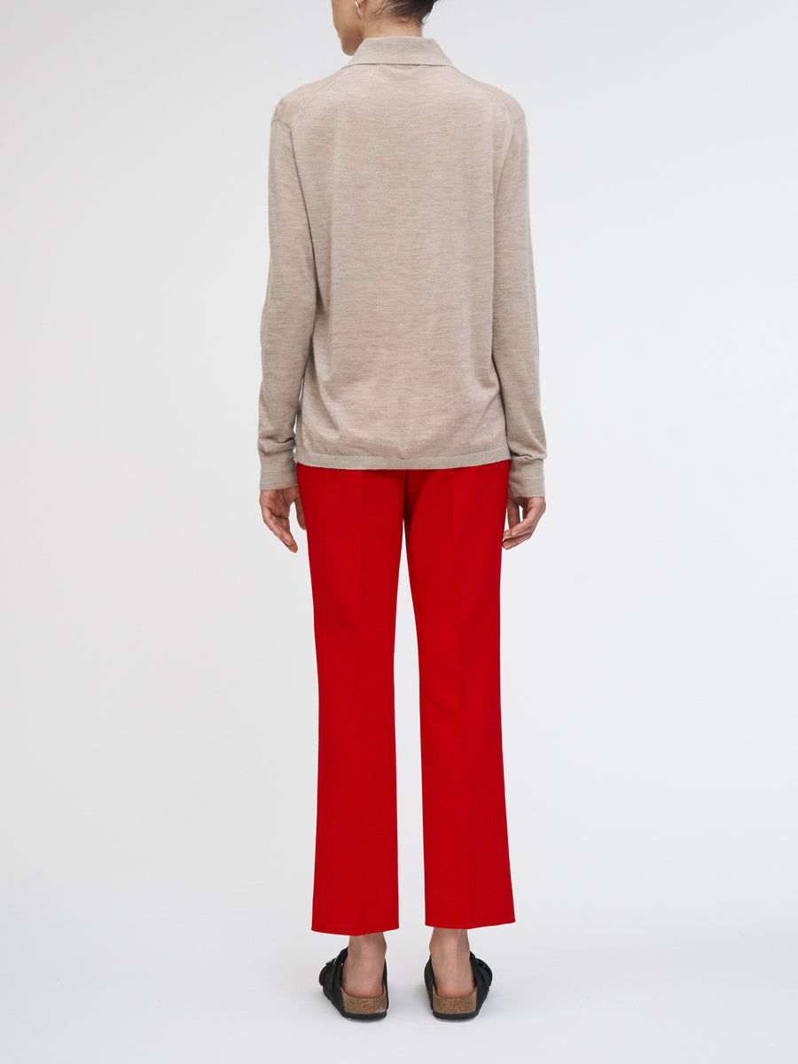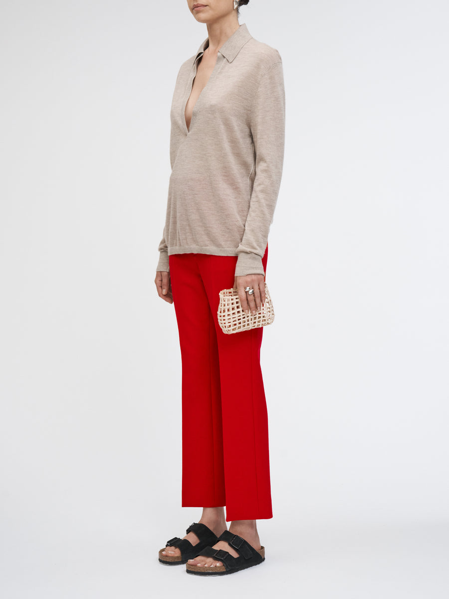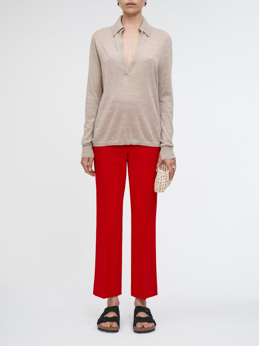 Crafted in tissue-weight heathered stone cashmere, this elongated tunic-length shirt combines elegance with comfort. Featuring a soft shirting collar and a plunging sharp neckline, it is accented with milk-white contrast link lines running along the seams.