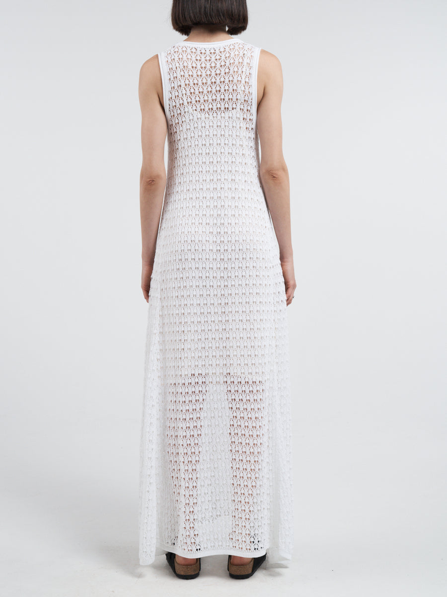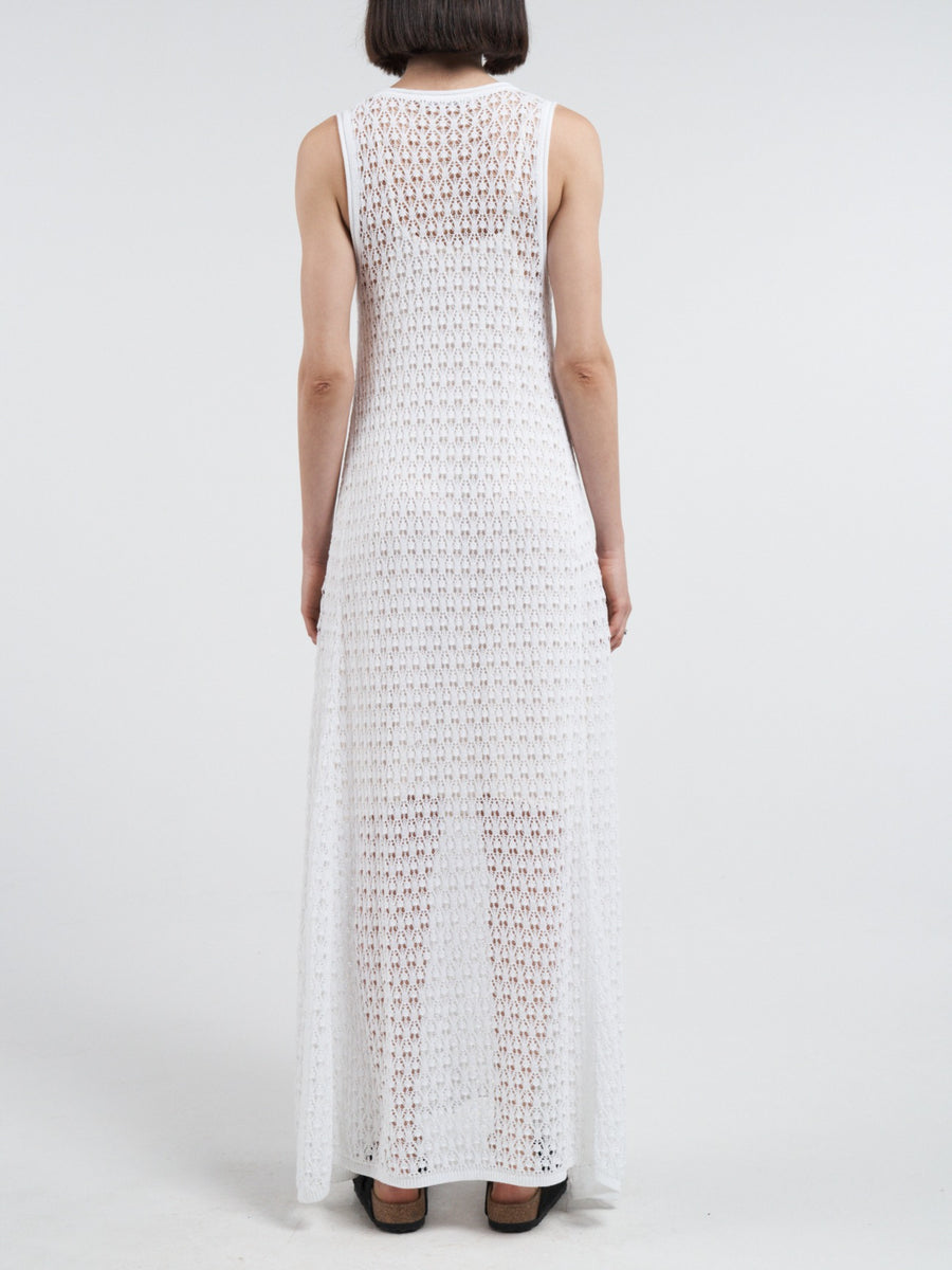 Crafted in organic mercerized cotton with a delicate knit lace stitch, this sheer, floor-length tank dress exudes a dramatic yet soft elegance. The all-over lace pattern and A-line silhouette create a natural flow as the dress gracefully reaches the floor. Finished with a half-woven slip for added modesty, this piece offers a sophisticated balance of texture and movement.