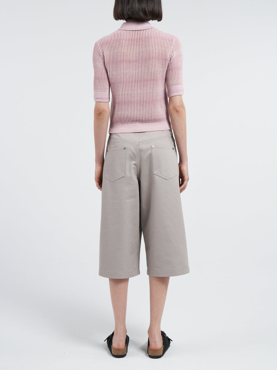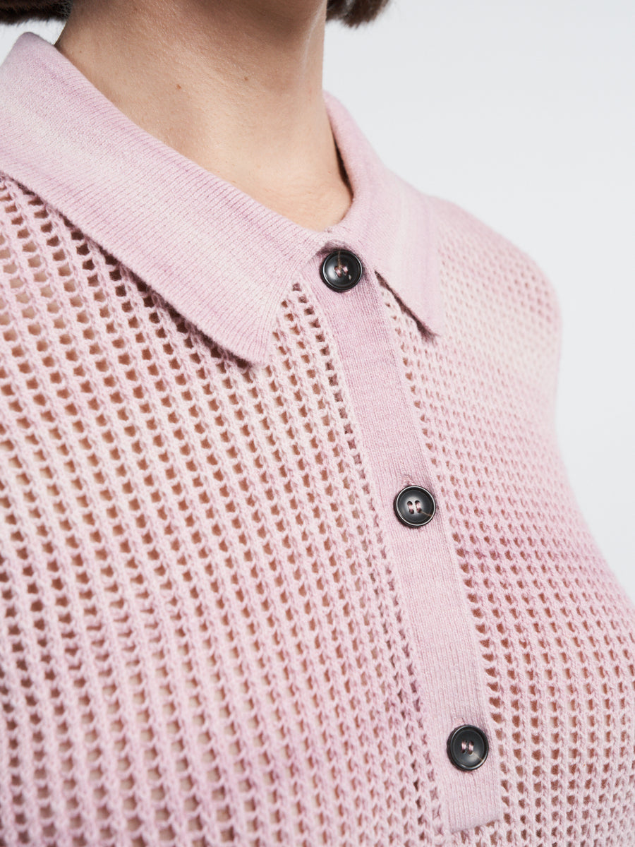 Crafted from our signature recycled 50/50 organic cashmere-cotton blend, this polo features a special degrade-dyed yarn that creates a tonal color variant through the mesh knit, resulting in a unique 'smudged' stripe effect. The design includes a buttonless polo neckline with a shirting collar, elbow-length sleeves, and a fitted silhouette that finishes at the waist.