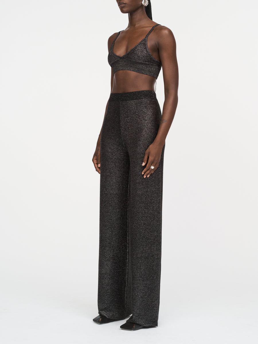 Knit from a sleek FSC-certified viscose blend in black and metallic silver, this comfortable pullover triangle bralette shimmers with a subtle, glitter-like finish. Perfect for layering, it adds a touch of sparkle beneath a sheer shirt or works beautifully as a stand-alone top.
