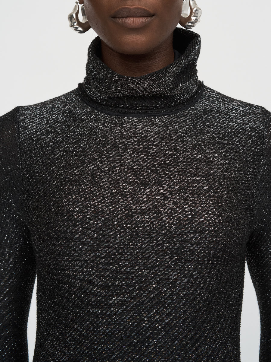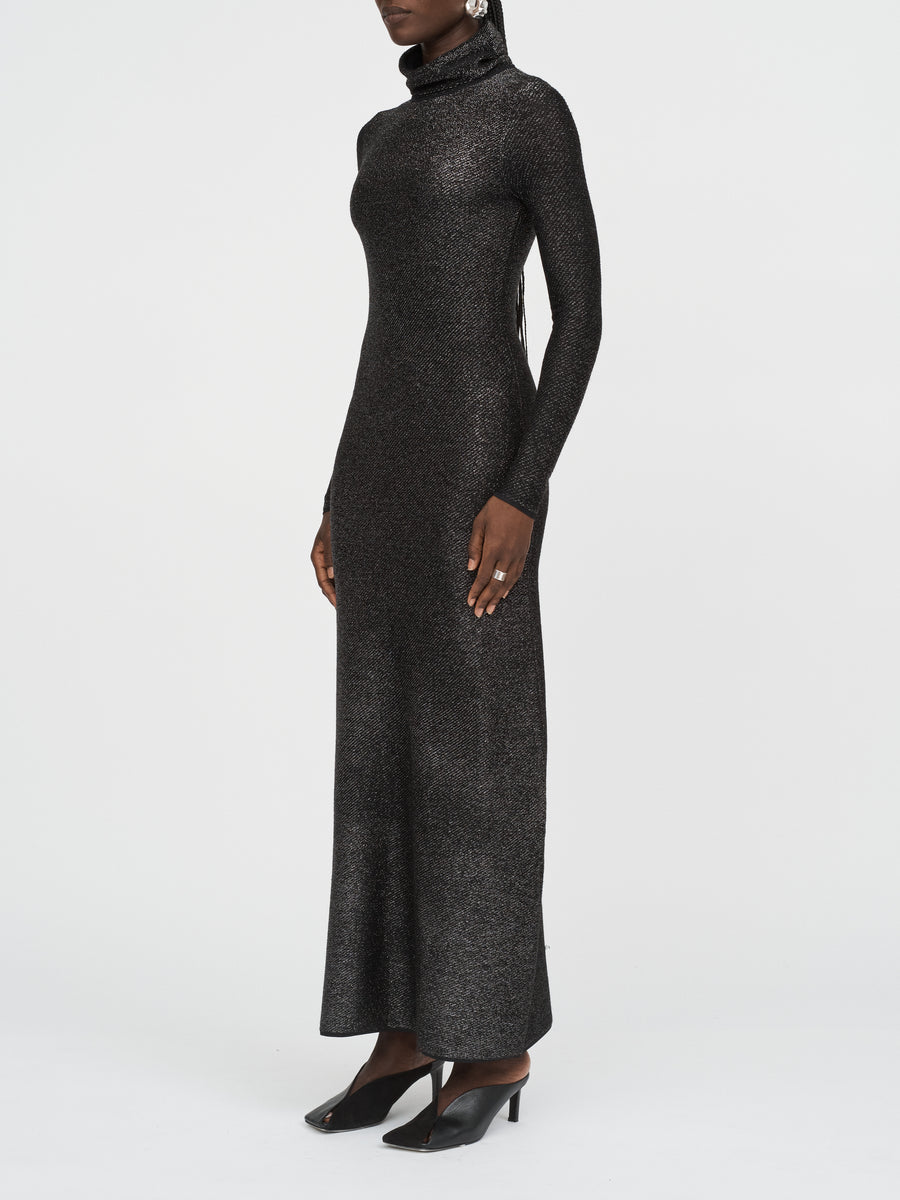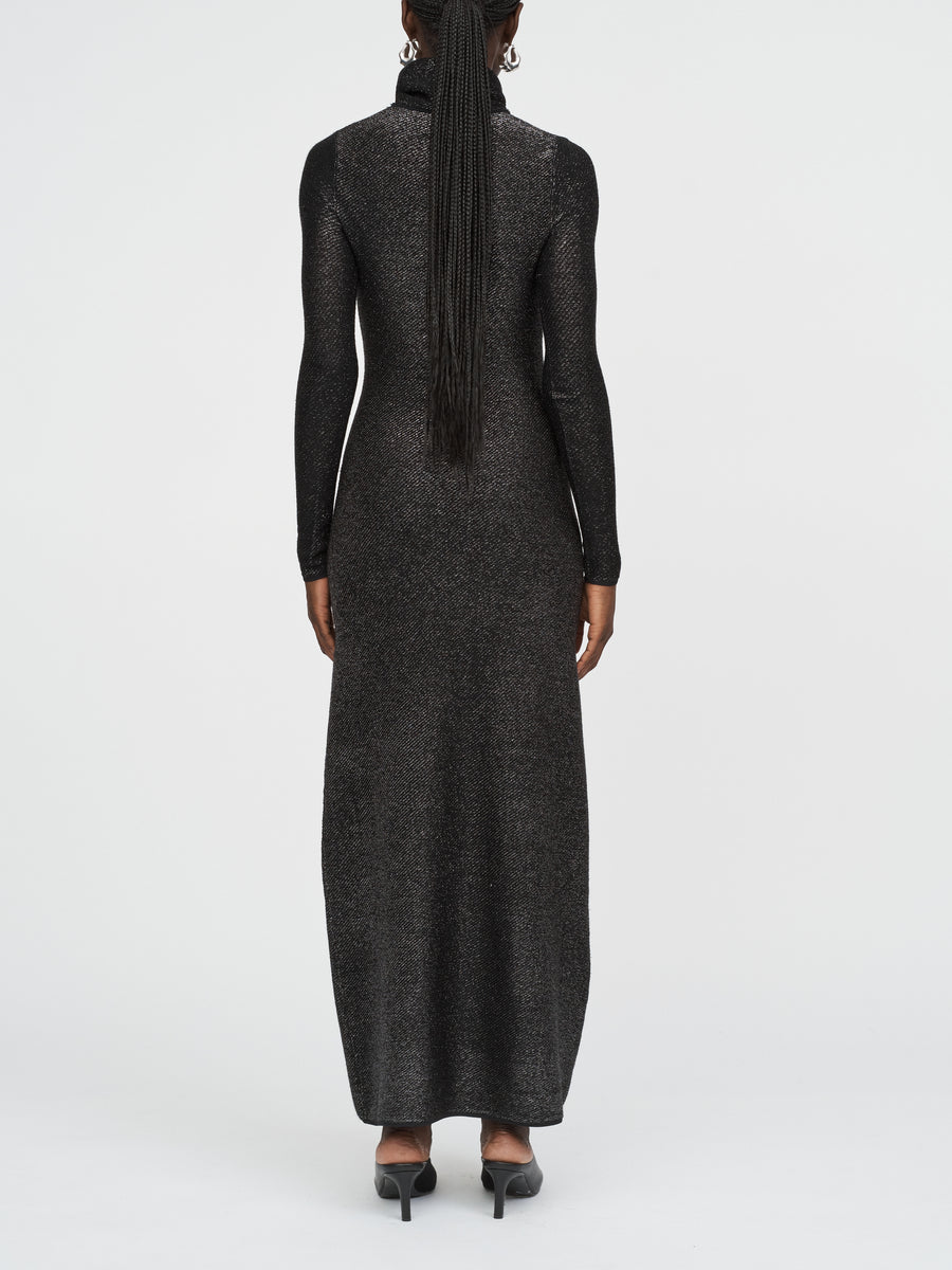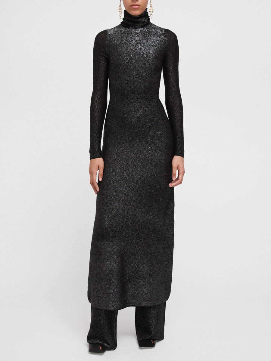Crafted from a sleek FSC-certified viscose blend in black and metallic silver, this ankle-length dress shimmers with a subtle, glitter-like effect. Featuring a slim fit, long fitted sleeves, and a relaxed turtleneck, this dress is an effortless statement piece.