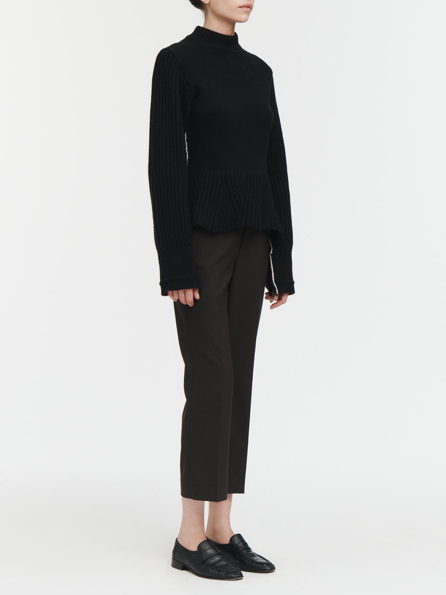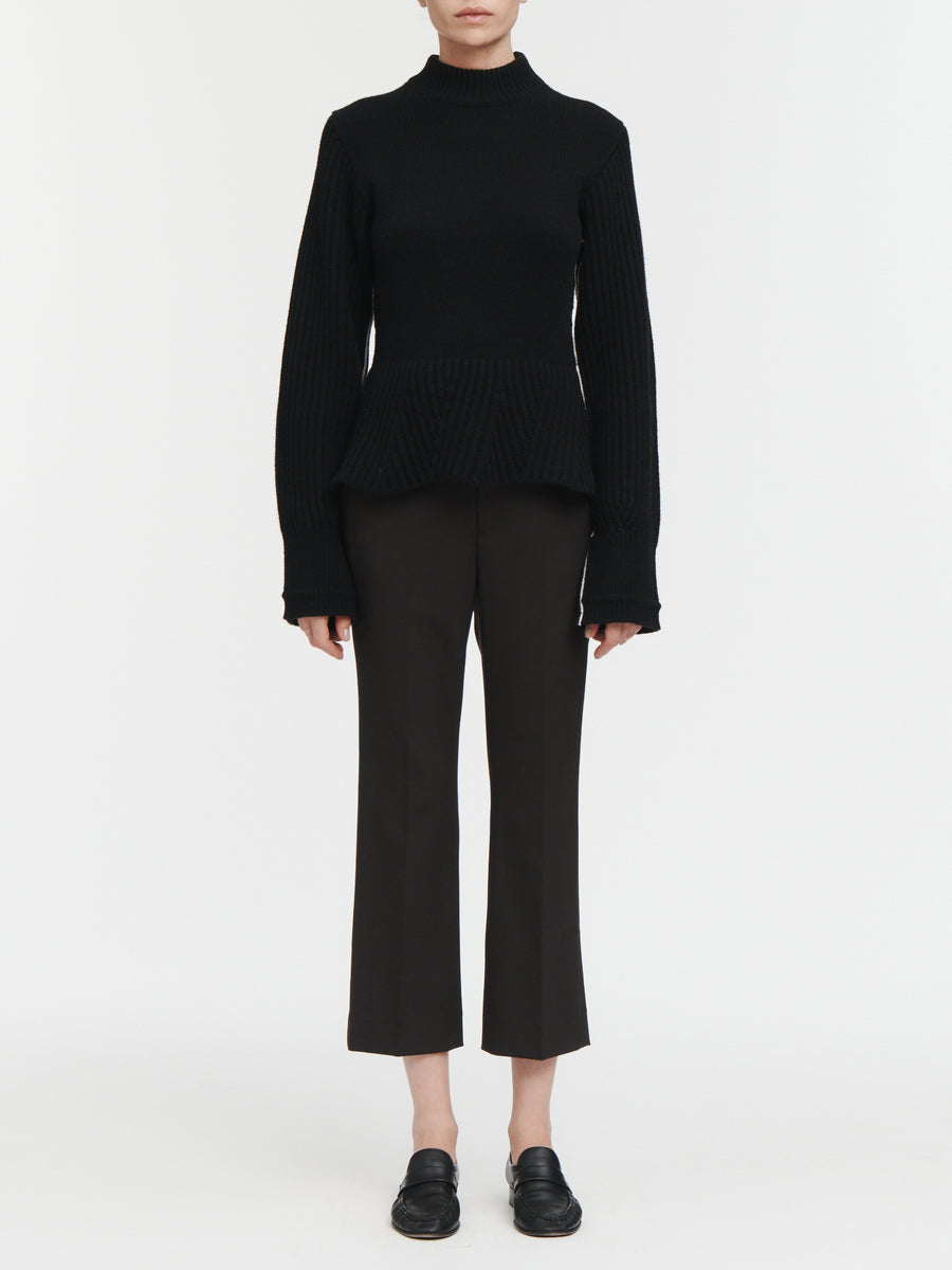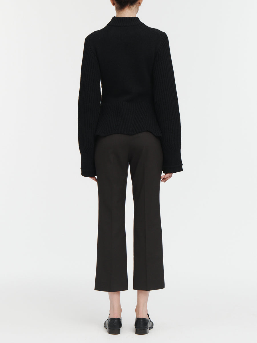The Peplum Mock Neck Sweater in Black has a slim fit and peplum detail at the waist. Made in our signature Italian 50% recycled cashmere & 50% organic cotton blend.