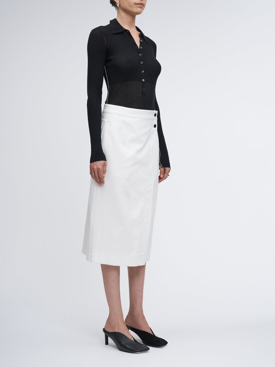 Crafted from a lightweight sheer black organic cotton knit, this ribbed polo plays with subtle contrasts. The bust and sleeves offer a denser knit, while the body remains delicately sheer. Finished with a deep polo placket and biodegradable buttons.
