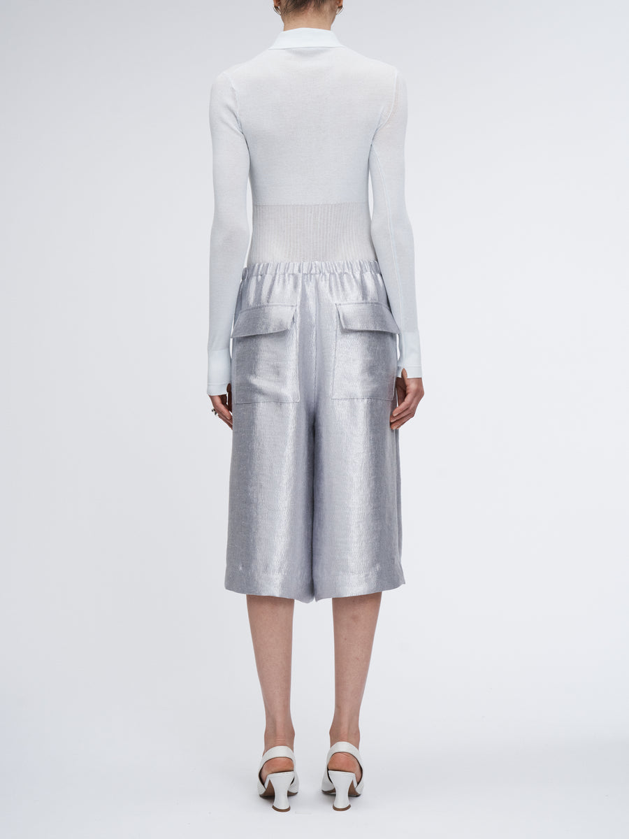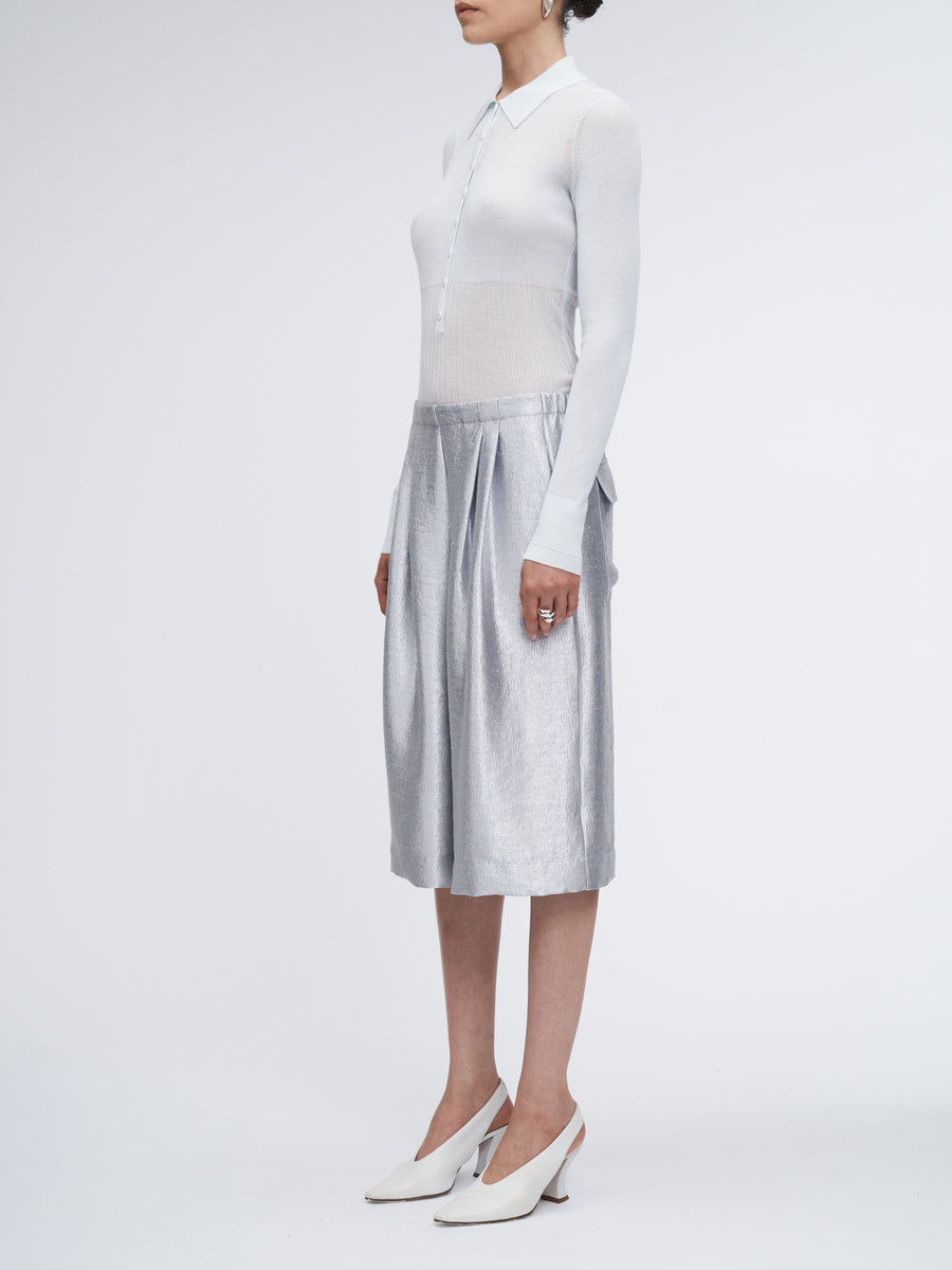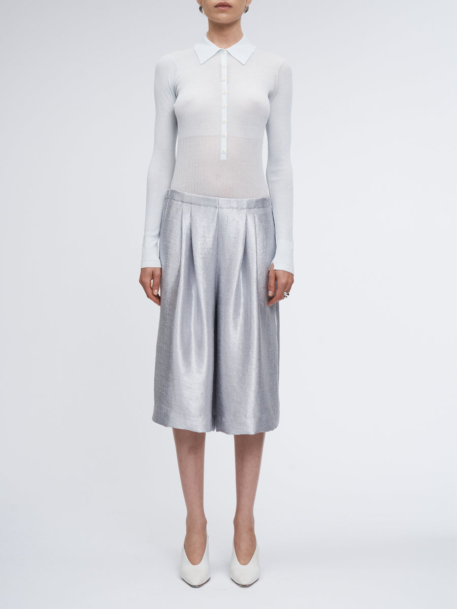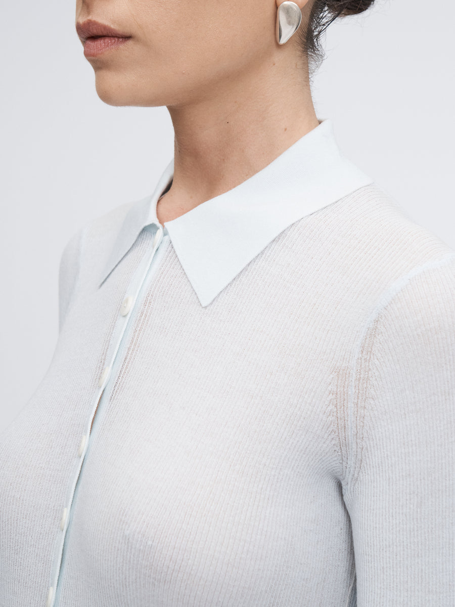 Crafted from a lightweight sheer pale ice blue organic cotton knit, this ribbed polo plays with subtle contrasts. The bust and sleeves offer a denser knit, while the body remains delicately sheer. Finished with a deep polo placket and biodegradable buttons.