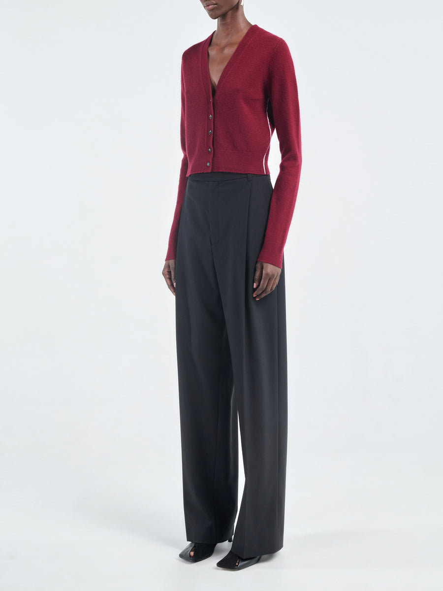 Shrunken V-neck Cardigan in ox blood Italian responsible wool-cashmere blend. It has a slim, cropped fit and is finished with signature urea buttons.