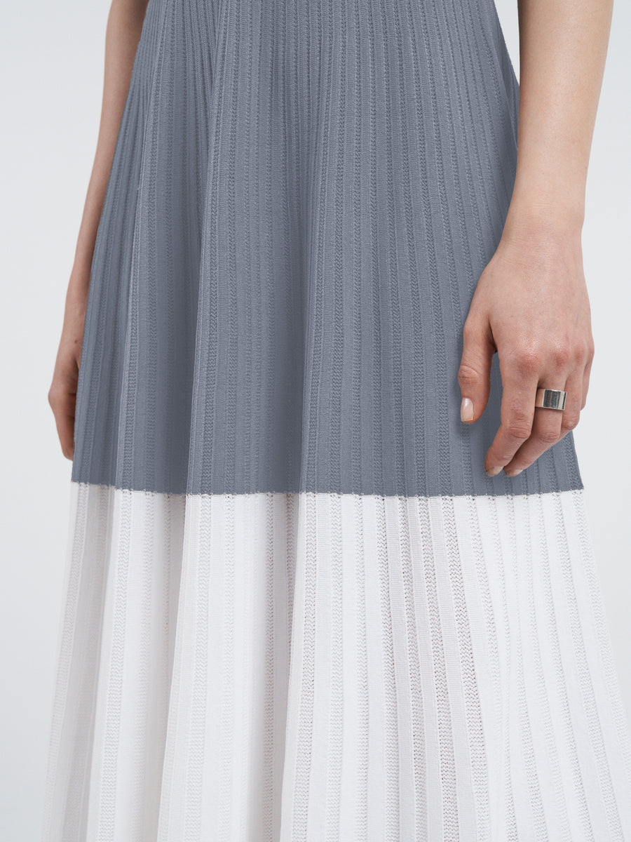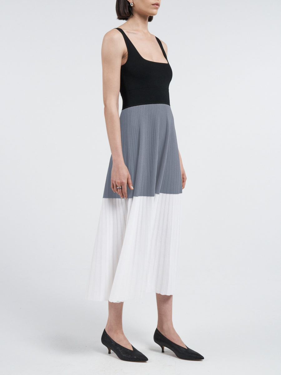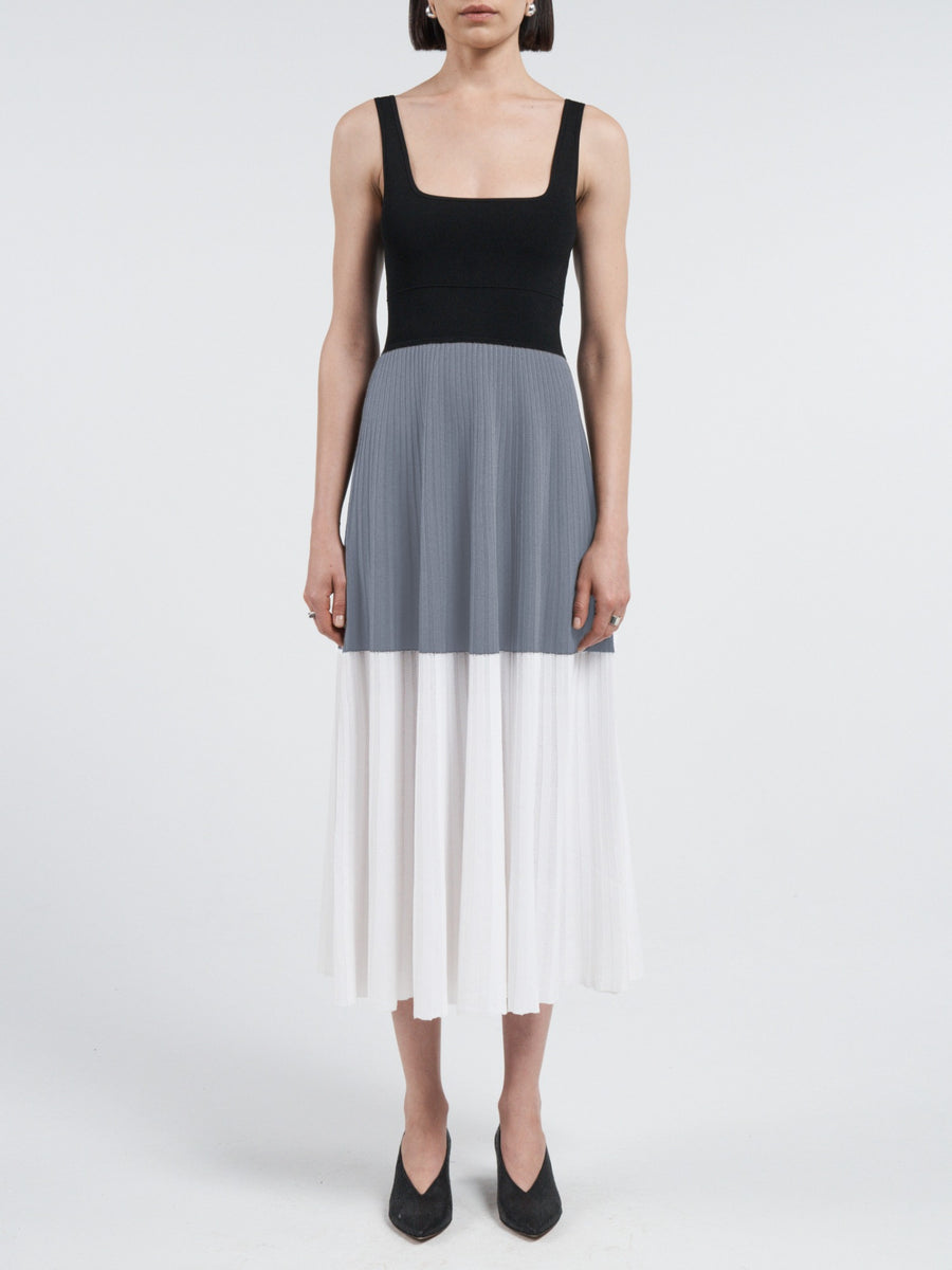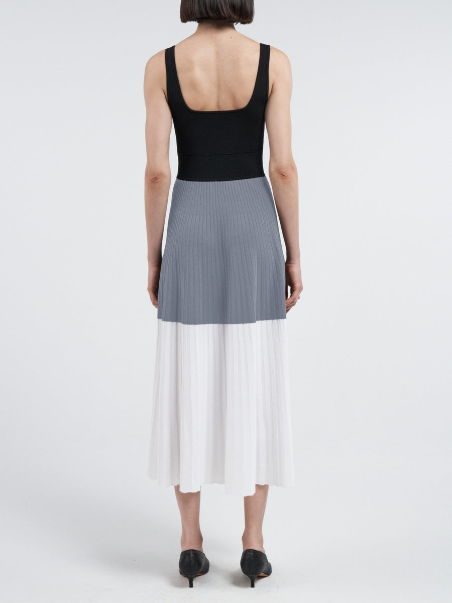 The color-blocked version of our best selling Square Neck Mesh Dress features a solid black bodice that fits closely through the waist, transitioning into a steel grey block from waist to hip, and is completed by a milk white skirt from hip to hem. Crafted in a solid mesh knit, the skirt creates a full, flowing silhouette that reaches a midi length.
