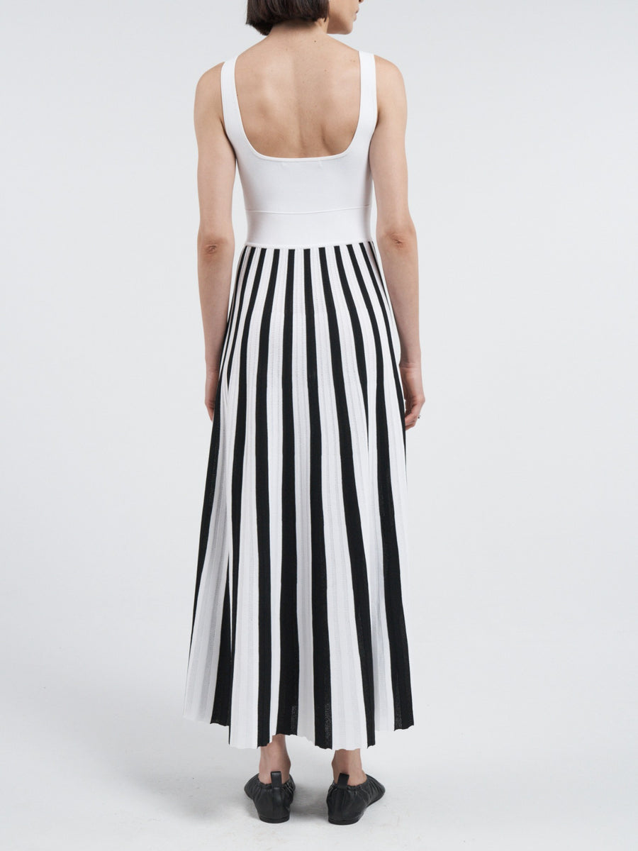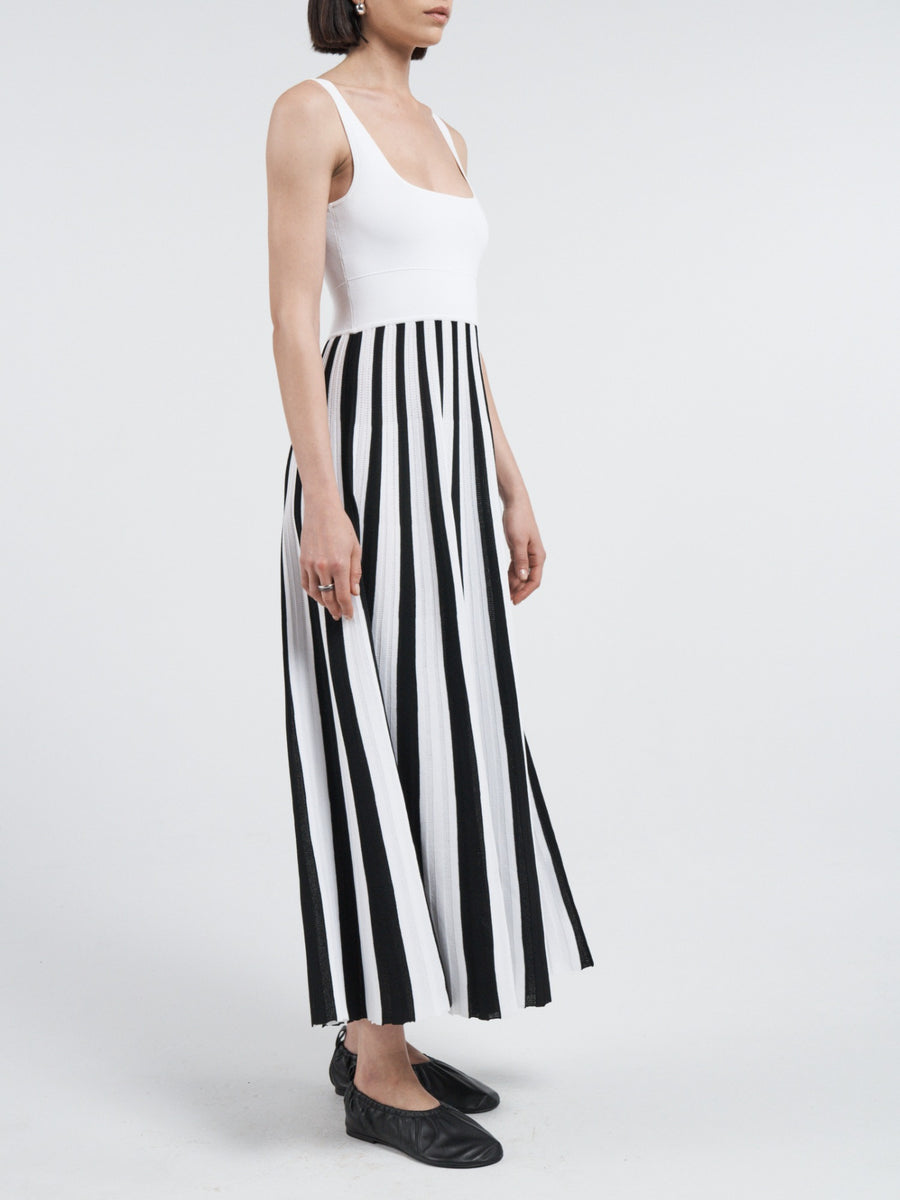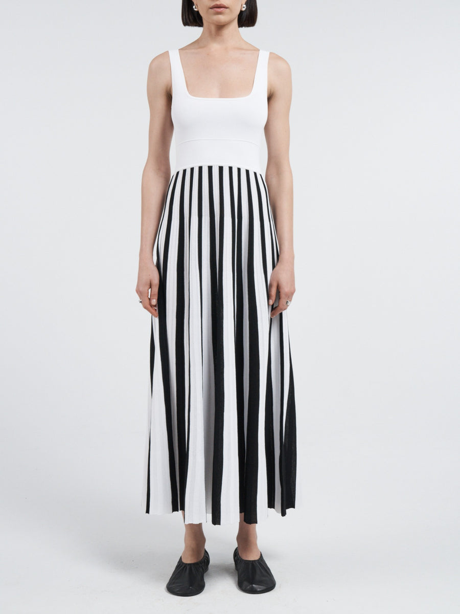 One of our best-selling dresses, now reimagined in new colors. This square-neck viscose mesh dress combines comfort and flattering design. The solid milk white bodice fits closely through the waist, transitioning into a black and white striped skirt. Crafted in a solid mesh knit, the skirt creates a full, flowing silhouette that reaches a midi length.