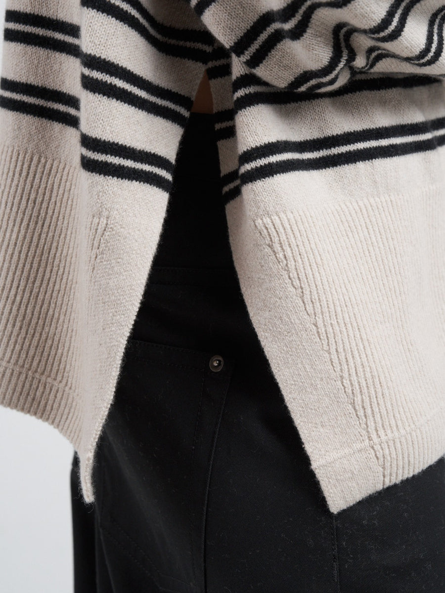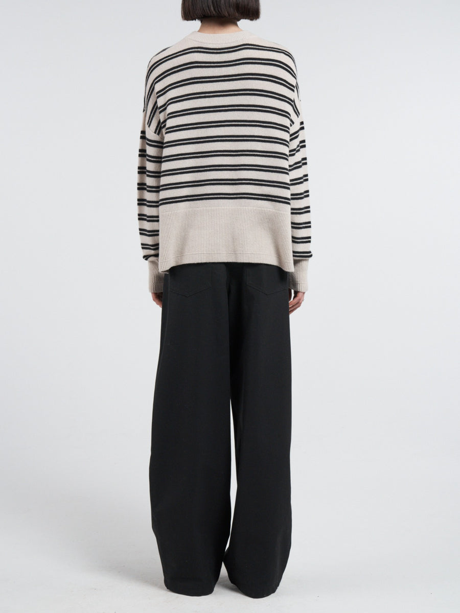 The Swing Crew is an elevated take on the classic crew neck cardigan, crafted from our 50/50 organic cotton and recycled cashmere blend. This crema and black striped sweater features high side seam slits, creating a relaxed fit, while a dramatic elongated double rib-knit hem gives a defined finish.