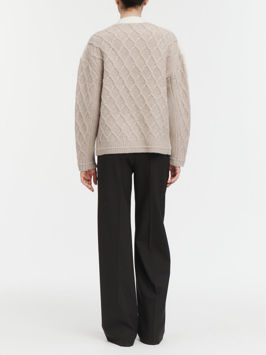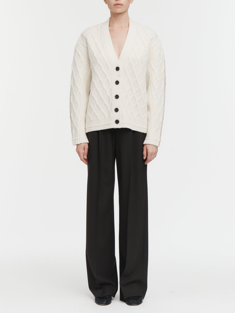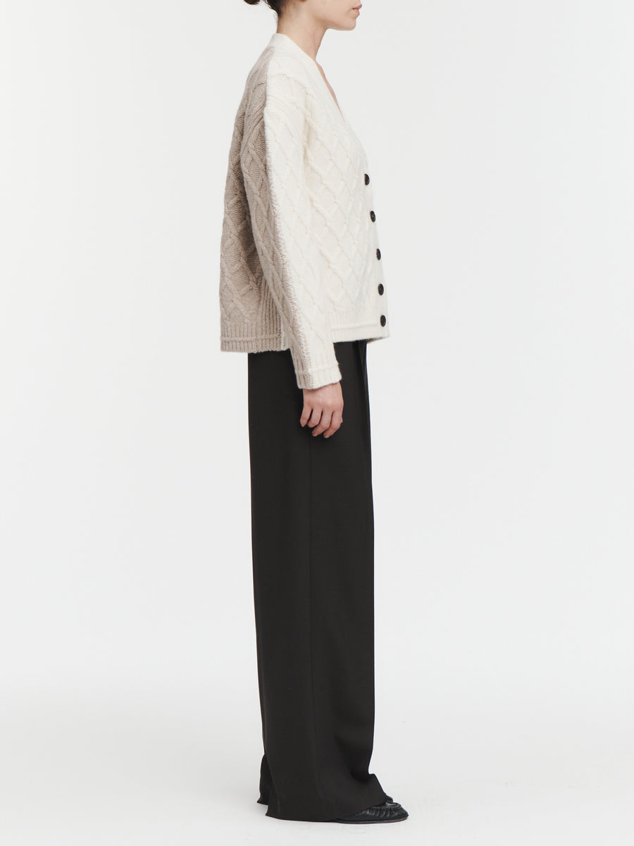 The Twisted Cable Cardigan in Ivory/Stone is a two tone cardigan with Ivory in front and Stone on back and slightly oversized fit. Made in our RWS certified extra fine merino wool, this is a heavier weight sweater with a chunky stitch.