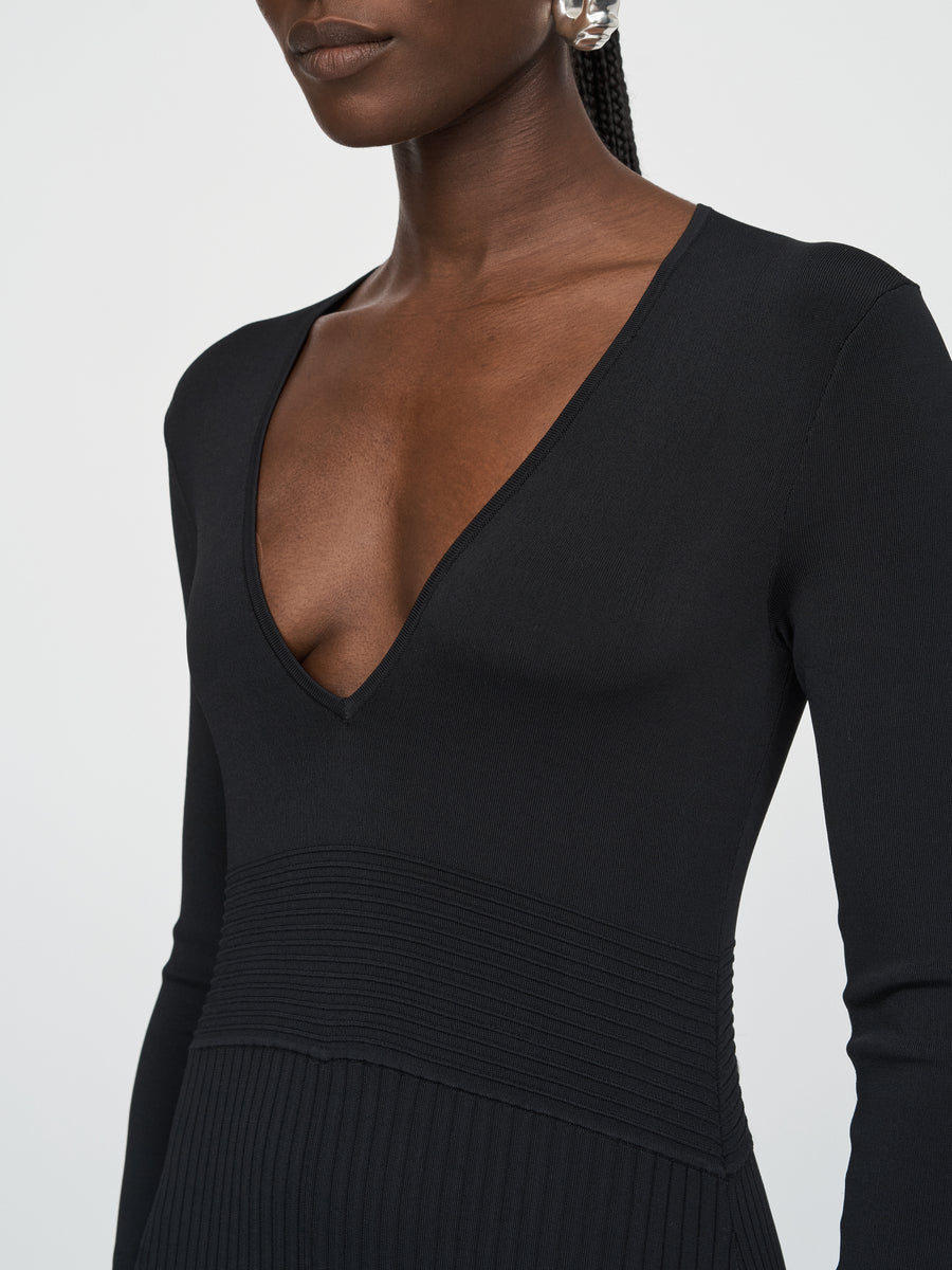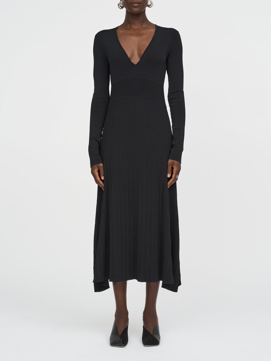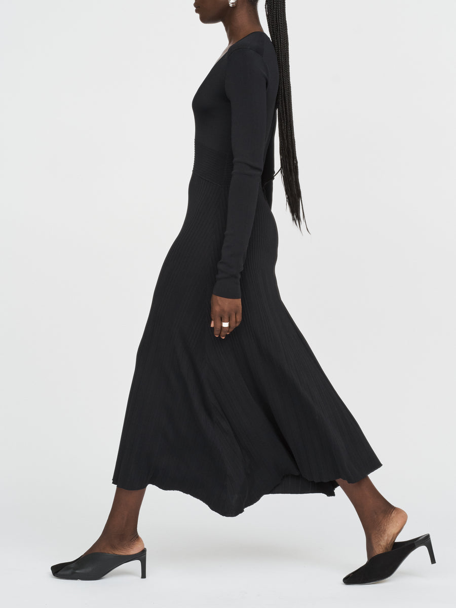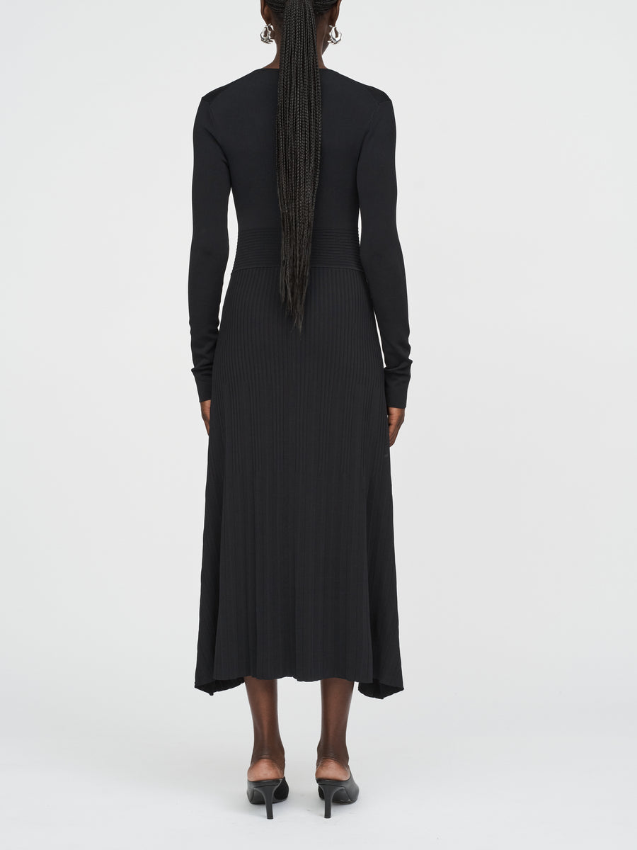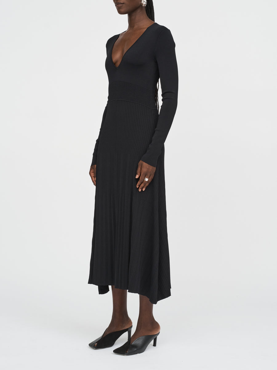 Knit from Italian viscose, this mid-calf waisted V-neck dress features a fluid pleated skirt designed with three distinct pleat styles, offering an elegant blend of texture and movement.